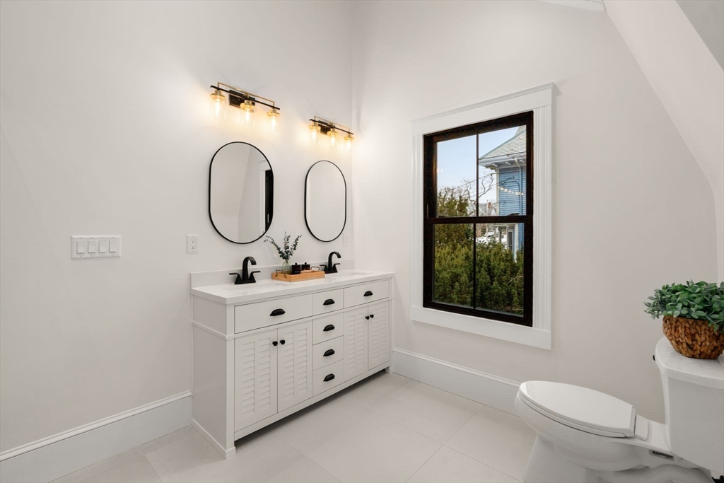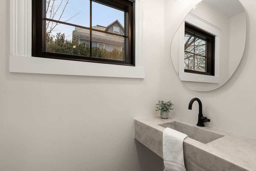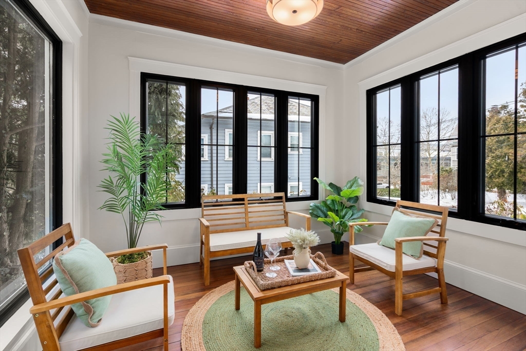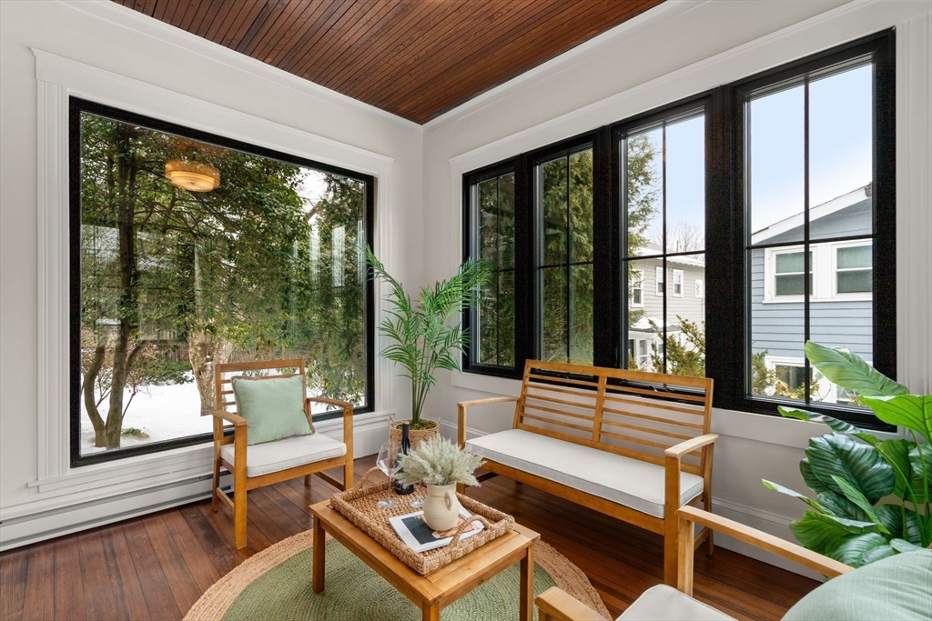 High-end 2025-renovated Dutch Colonial in East Watertown, moments from the new 2026 Watertown High School. Elegant home blends refined updates with retained old-world charm, featuring original hardwood floors. Elegant foyer offers built-in cubbies & classic brick flooring. 4 bdrms on the 2nd floor & 3.5 baths, including a primary suite with private bath & walk-in closet. Striking central brick fireplace anchors the main living space. Kitchen is appointed with quartz countertops, oak cabinetry, & stainless steel appliances, flowing to a large sunroom off the dining room. Double doors open to an expansive wood deck overlooking an exceptionally private rear gardens with beautiful stone walls & brick patio. Side entrance lower level includes a comfortable family room & full bath. New HVAC system. Detached garage converted to a heated versatile studio, office, or yoga space. Short distance to Watertown Square and Arsenal Yard. 4 parking. Perfect for entertaining or relaxing family living.