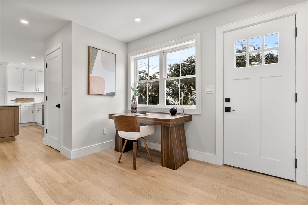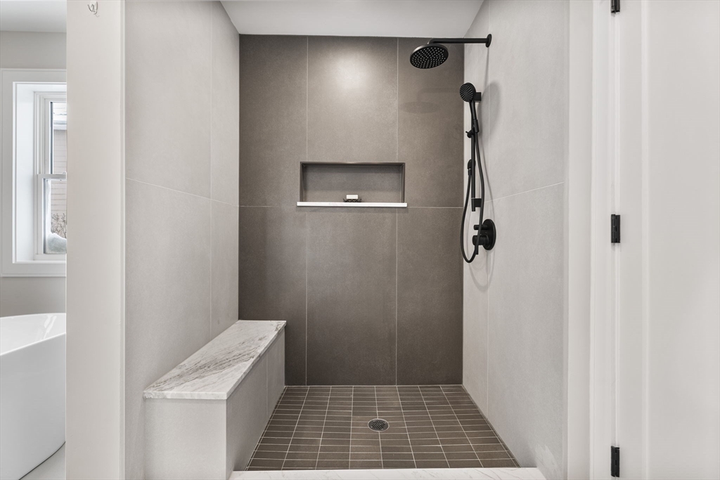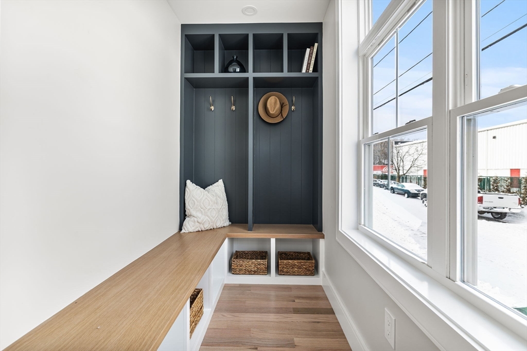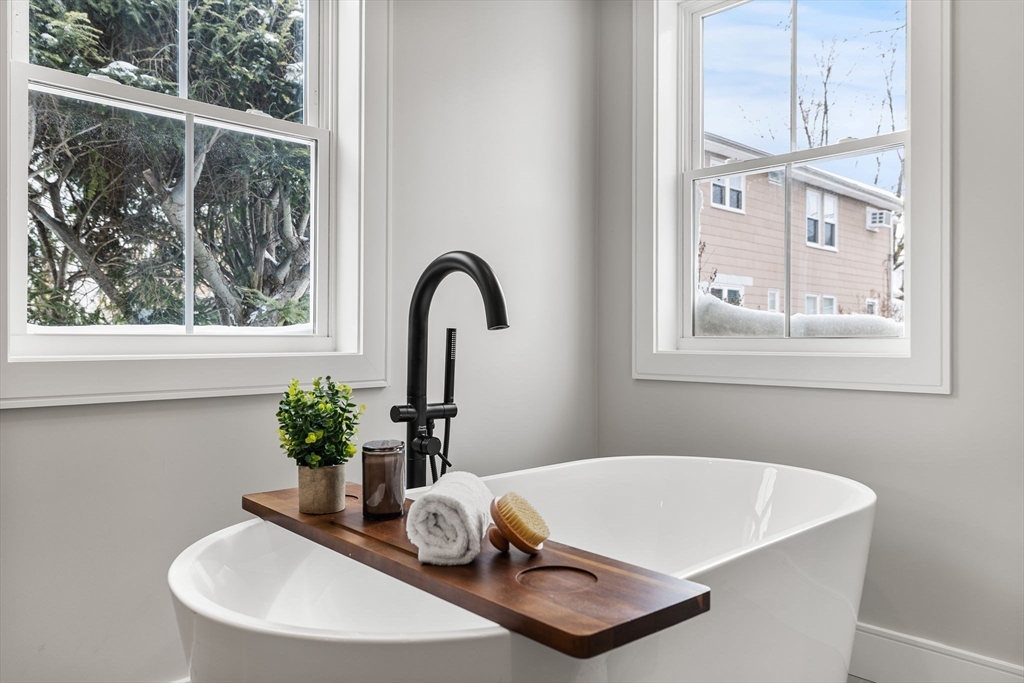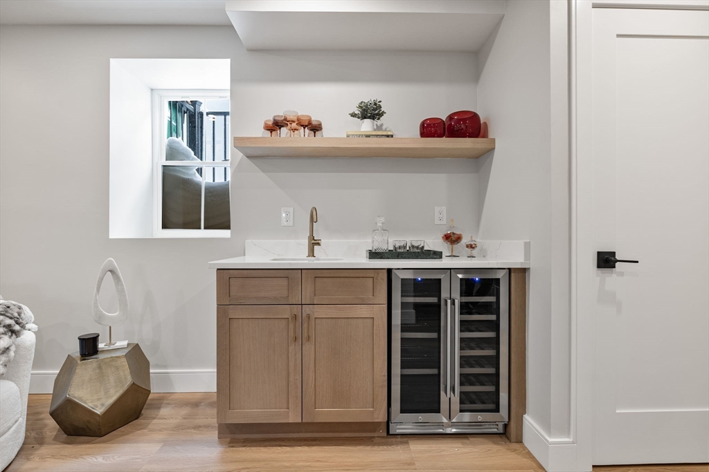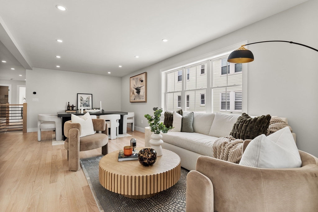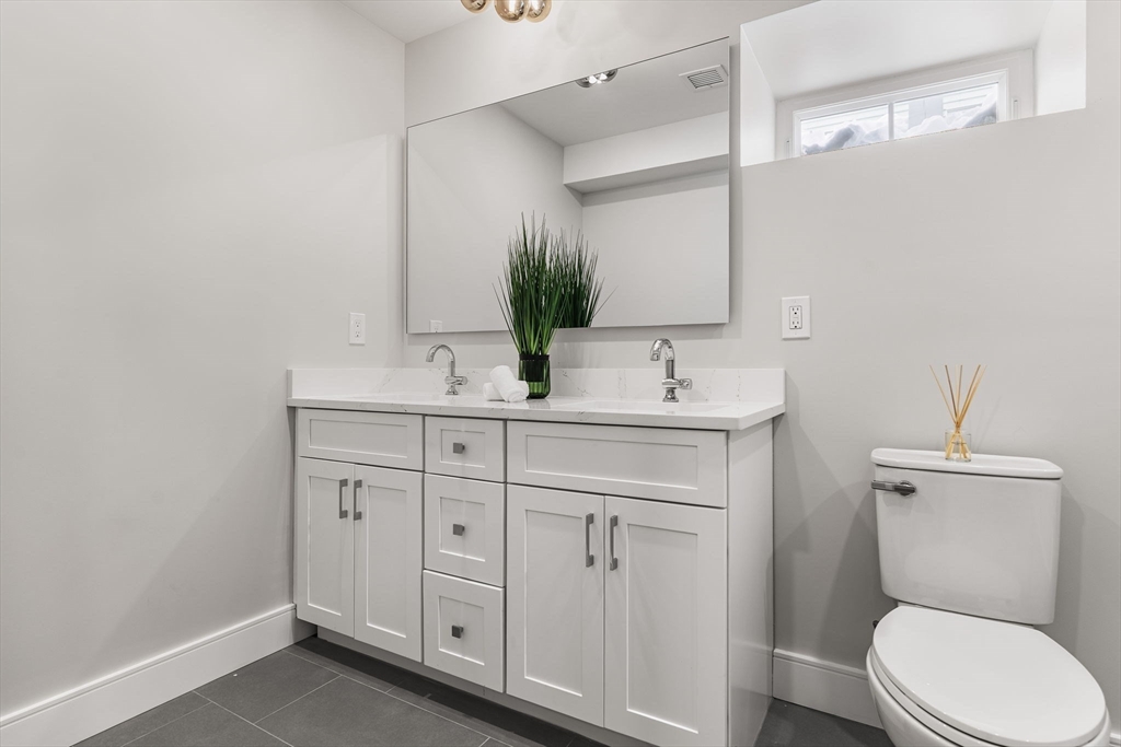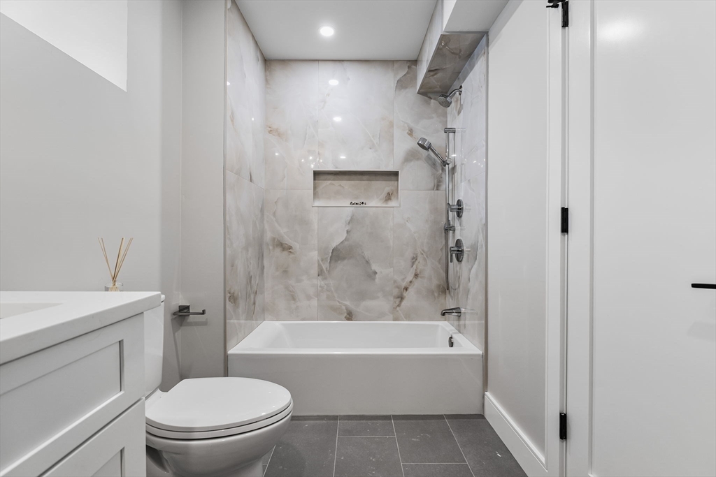 This exceptional bi-level residence offers over 2,100 sq ft of impeccably designed living space across two refined levels; a full gut renovation that rivals new construction. Sunlight floods the open-concept main level, highlighting the stunning kitchen featuring Bosch appliances, Calacatta Premata quartz surfaces, a Fabuwood white oak island & custom hood with integrated designer lighting. The expansive living and dining area create a seamless setting for sophisticated entertaining.The serene primary suite showcases a generous walk-in closet with custom built-ins and a spa-caliber bath with double vanities, an oversized shower, and soaking tub. A second bedroom, full bath, and laundry complete the main level.Below, an expansive lounge with wet bar anchors two additional well-appointed bedrooms and a full bath. Includes a private fenced yard (450 sq ft) and three deeded parking spaces off-street. Minutes to Assembly Row and Wellington T.