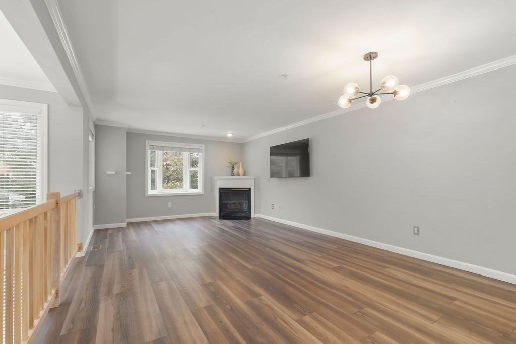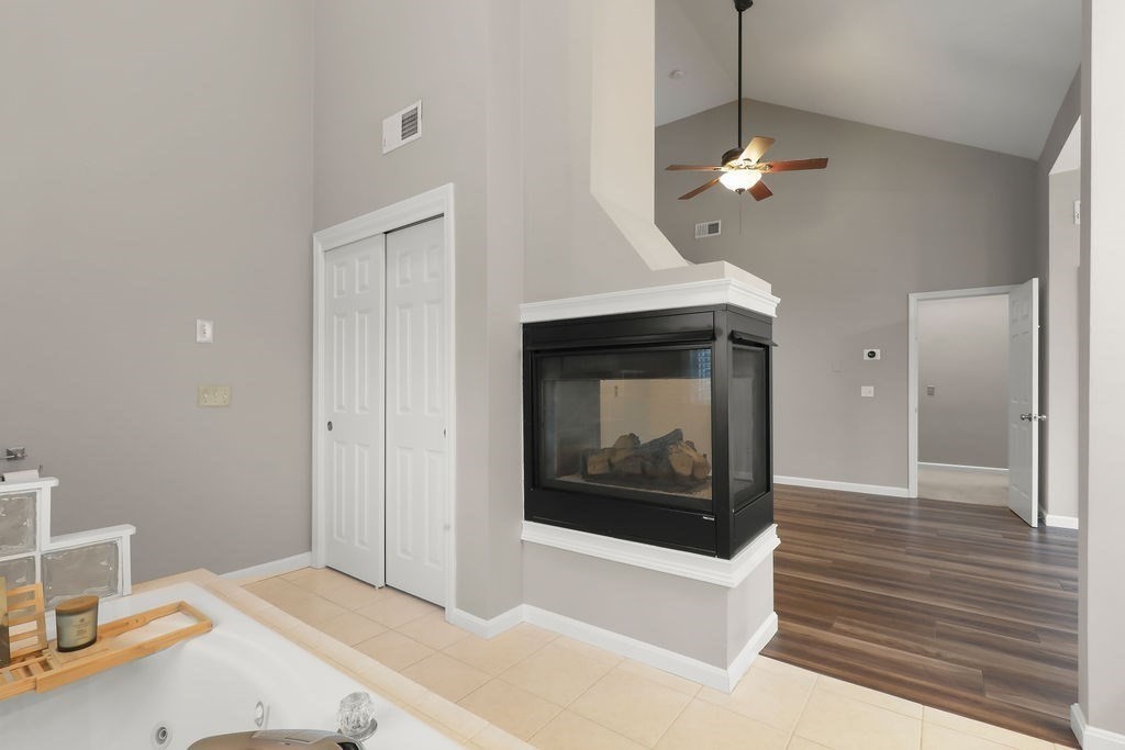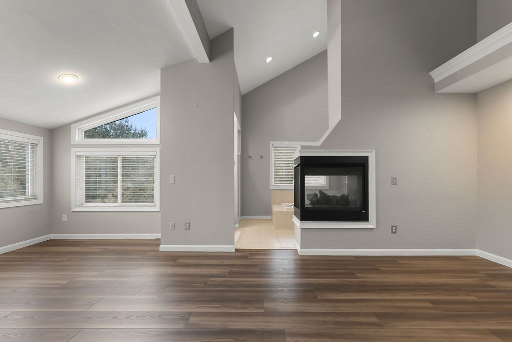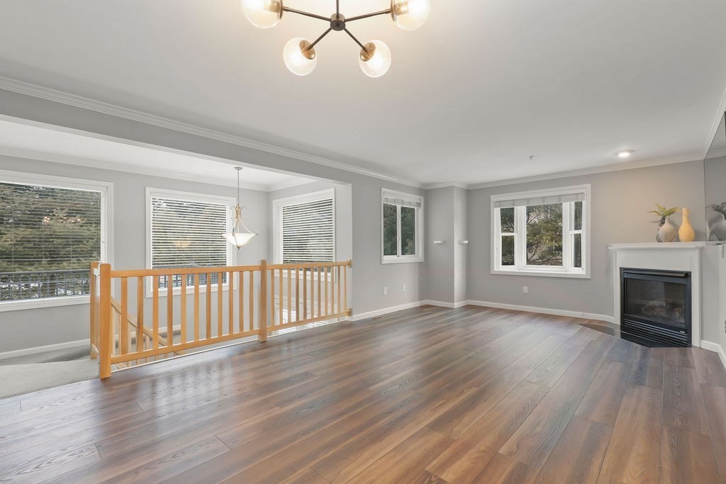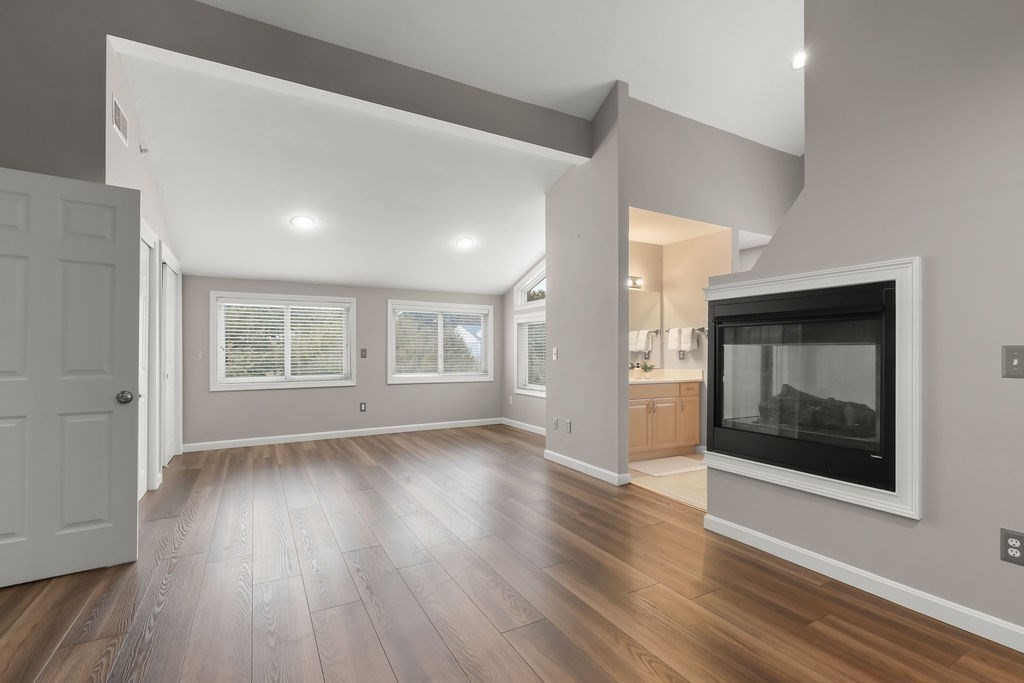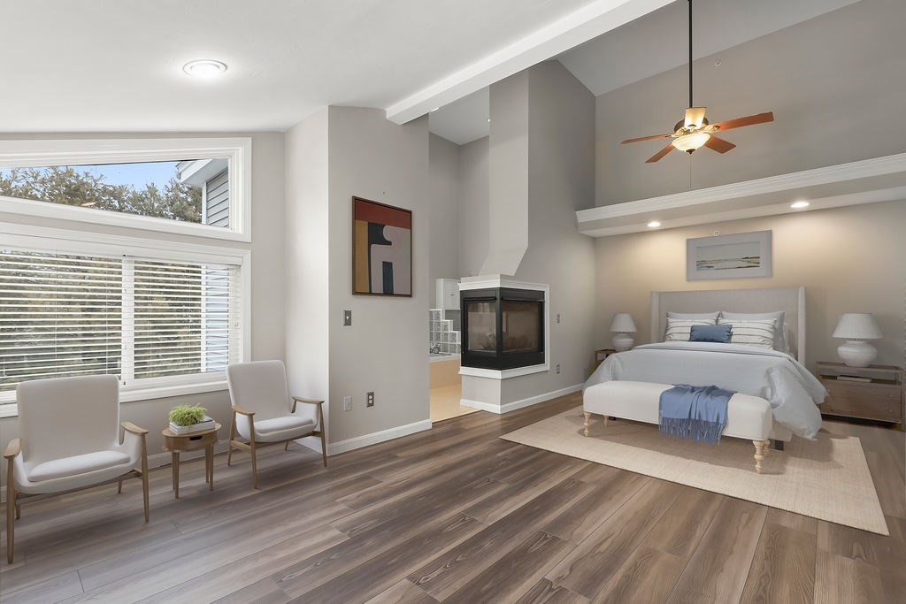 This corner townhouse-style condo offers an open floor plan filled with natural light and a spacious feel throughout. The oversized kitchen is a standout with abundant cabinet space and room for a table or island, ideal for everyday living and entertaining. It flows seamlessly into the dining and living areas, where a cozy fireplace creates a warm, inviting atmosphere. LVP flooring runs throughout the living areas and bedrooms, creating a cohesive look. Expansive windows enhance the bright interior. Upstairs, cathedral ceilings add volume and charm. The primary suite features a stunning look-through fireplace connecting the bedroom and en-suite bath. A cozy loft makes a perfect office or reading nook. The lower level offers a two-car tandem garage and a utility/laundry room with space for a workout area or office. Enjoy a prime location near shops, restaurants, the train, I-495, plus peaceful trails and ponds right outside your door! Welcome home.