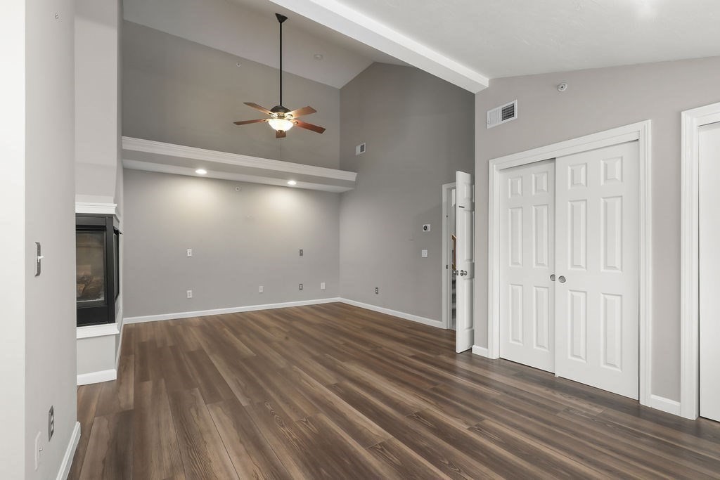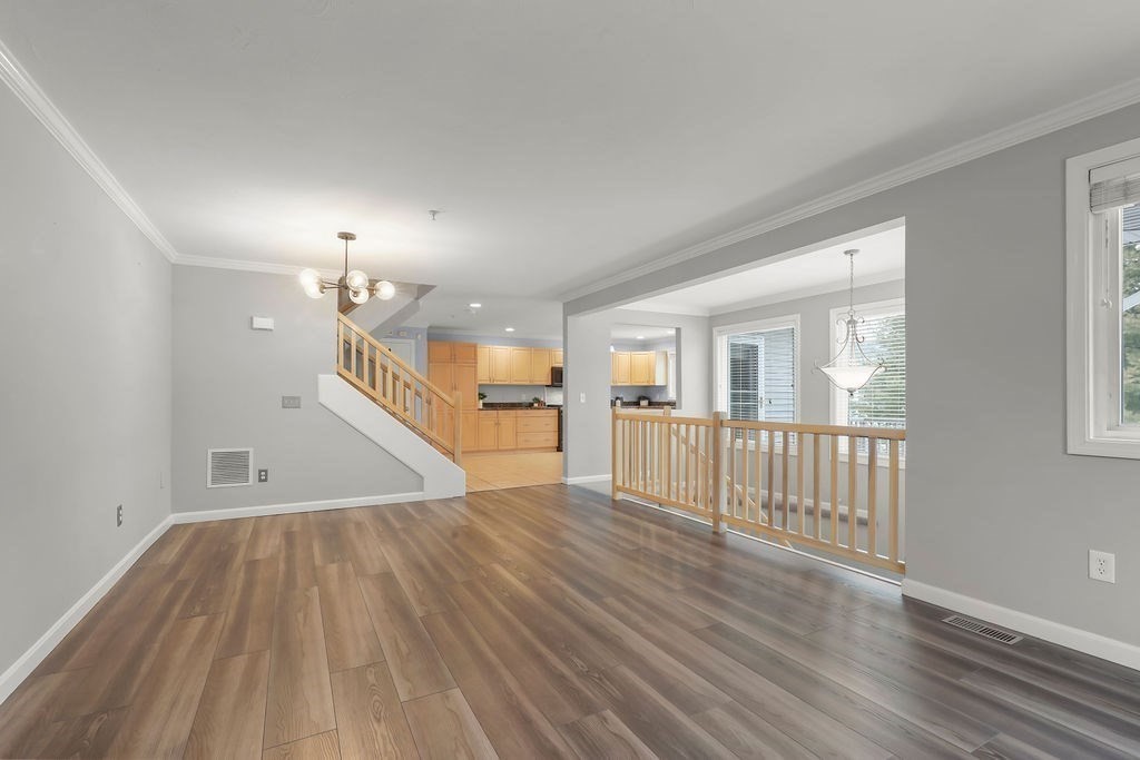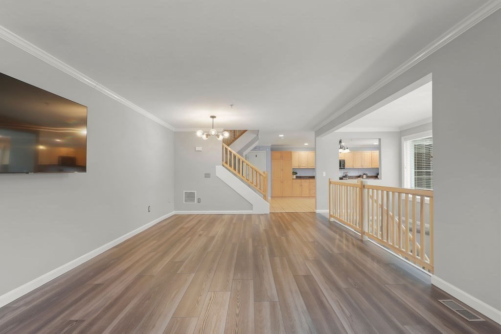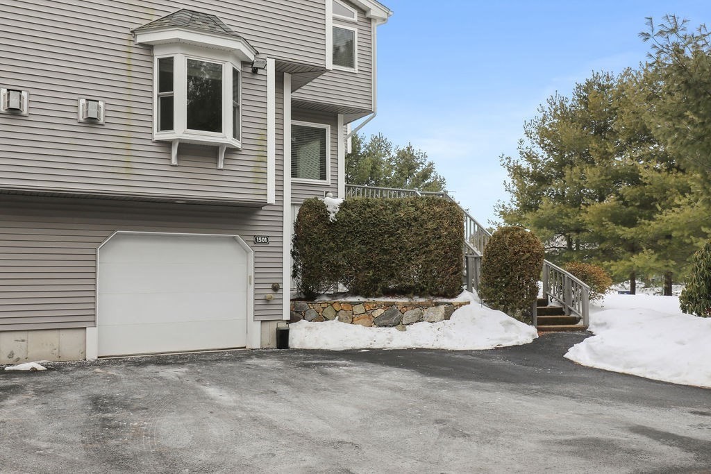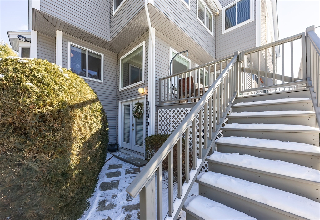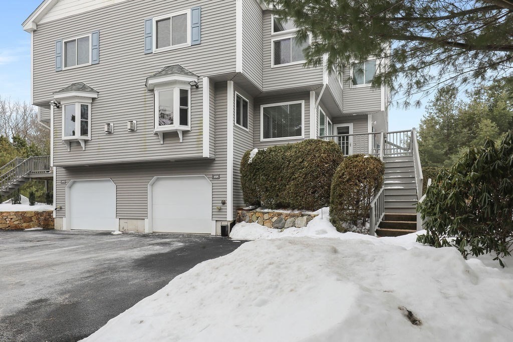 This corner townhouse-style condo offers an open floor plan filled with natural light and a spacious feel throughout. The oversized kitchen is a standout with abundant cabinet space and room for a table or island, ideal for everyday living and entertaining. It flows seamlessly into the dining and living areas, where a cozy fireplace creates a warm, inviting atmosphere. LVP flooring runs throughout the living areas and bedrooms, creating a cohesive look. Expansive windows enhance the bright interior. Upstairs, cathedral ceilings add volume and charm. The primary suite features a stunning look-through fireplace connecting the bedroom and en-suite bath. A cozy loft makes a perfect office or reading nook. The lower level offers a two-car tandem garage and a utility/laundry room with space for a workout area or office. Enjoy a prime location near shops, restaurants, the train, I-495, plus peaceful trails and ponds right outside your door! Welcome home.