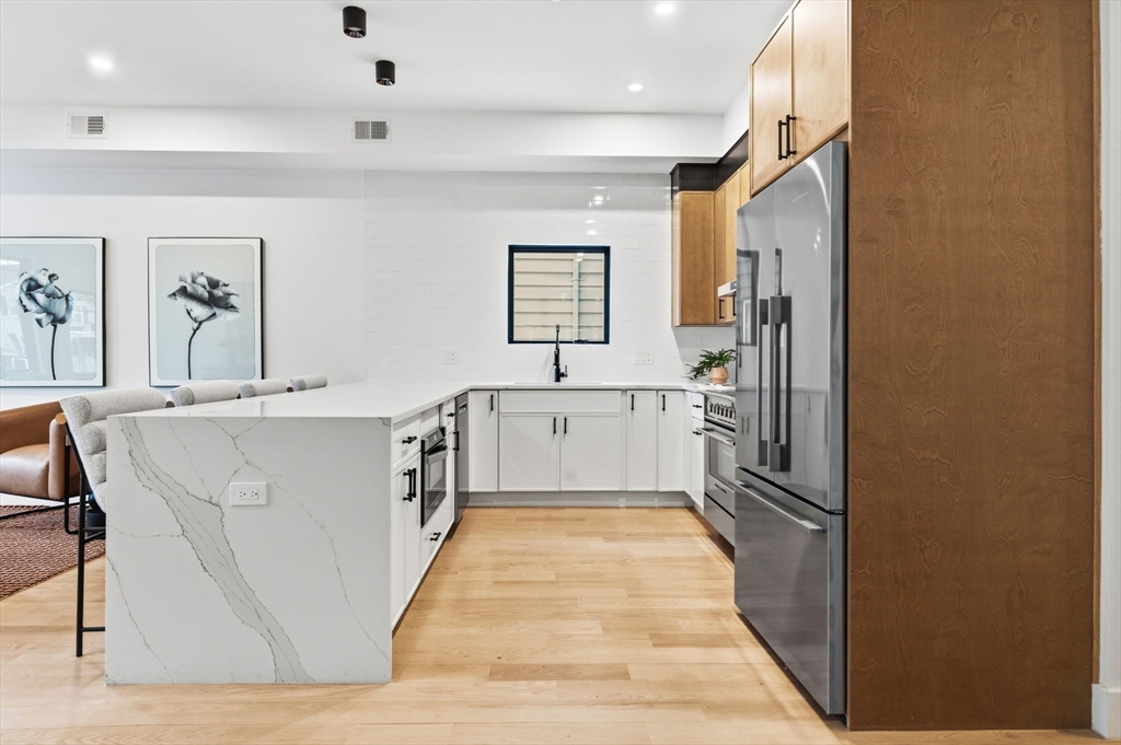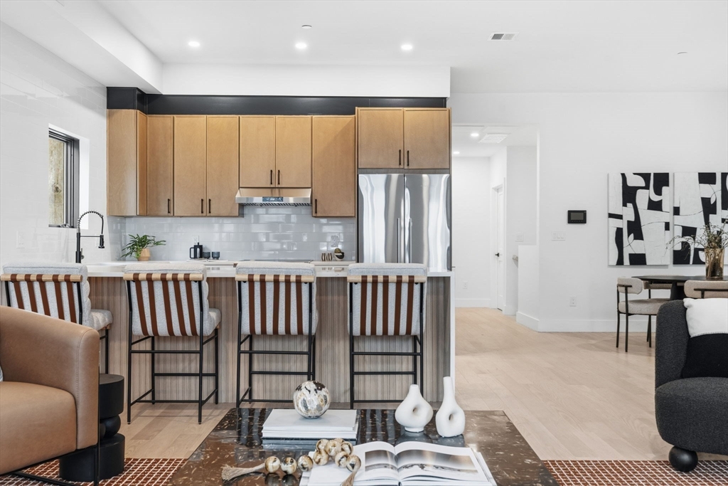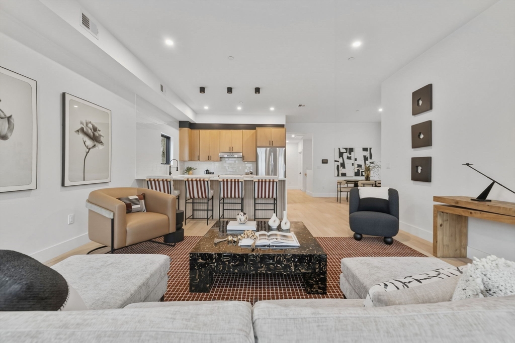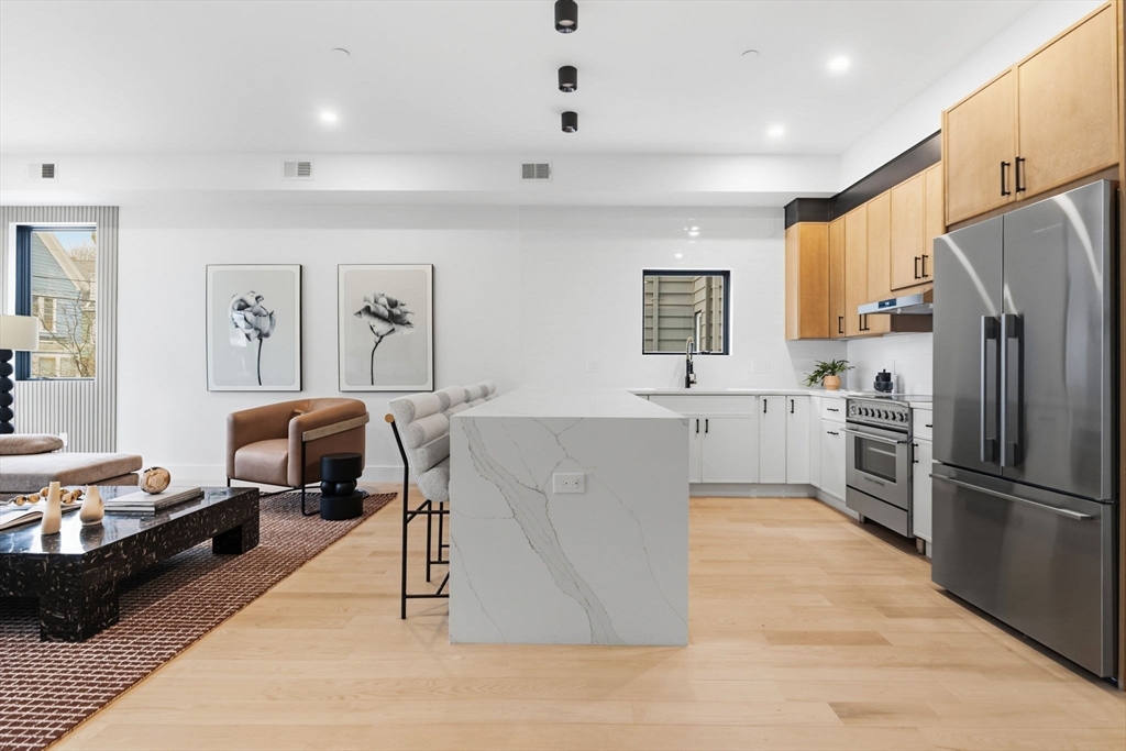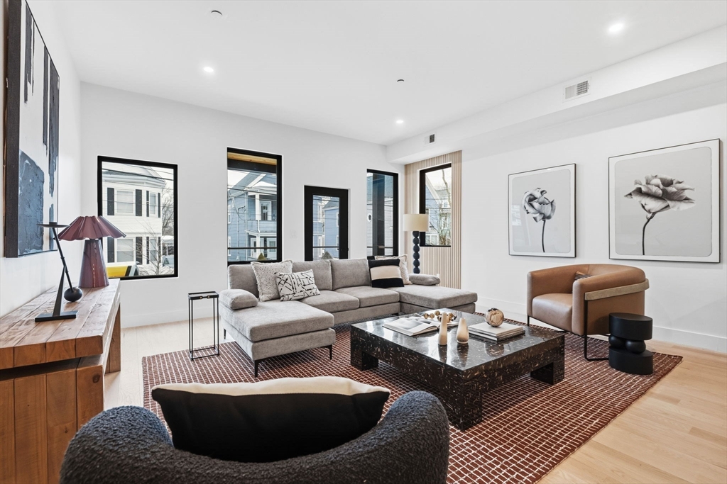 Your chance to own a thoughtfully designed new construction home in one of Somerville’s most connected neighborhoods. This 2,382 sq ft bi-level unit offers 3 beds+ & 3.5 baths designed for comfort & everyday living. The main level showcases an open concept layout anchored with 10' ceiling, a spacious living & dining area & a stunning kitchen with Fisher & Paykel appliances, quartz countertops & a mix of warm wood & crisp white cabinetry. Floor-to-ceiling Marvin windows fill the space with natural light & extend to a private deck, ideal for relaxing or entertaining. A private primary suite is tucked just off the main living area with a luxurious bath and walk-in closet, while a bright guest bedroom and powder complete this floor. Downstairs, a spacious family room opens directly to the patio for seamless indoor-outdoor living, along with a junior suite and additional office. Set within a boutique building just moments from Davis Square, the Green Line Extension & the Community Path.