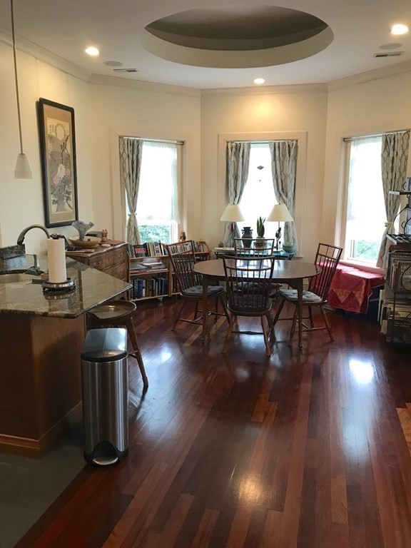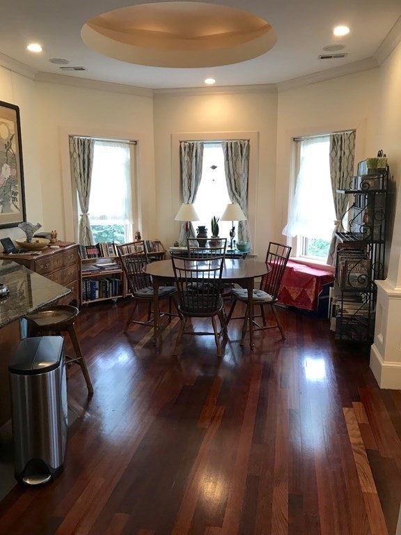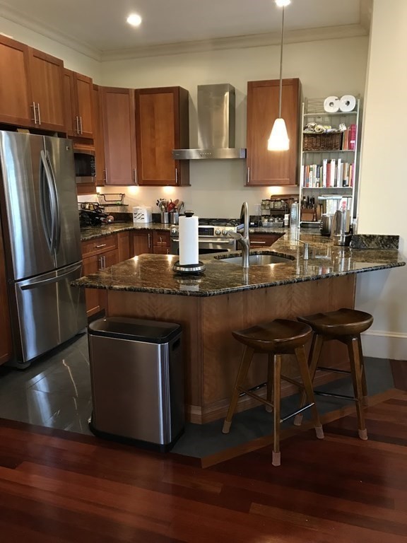 Phenomenal penthouse unit located five minutes from Central Square in tree-lined Cambridgeport. Fully renovated on the top floor of a beautiful prewar building equipped with elevator. Unit features 12-foot ceilings, bold moldings and large windows. Open kitchen with gas range, stainless steel appliances, granite counters, microwave, dishwasher and disposal, and formal dining area. Large living room with windows overlooking Cambridgeport and Boston. In-unit laundry and central AC. Additional storage in Basement. HEAT AND HOT WATER INCLUDED IN THE RENT. Completely integrated sound system with separate controls for each room. Truly a one-of-a-kind space with beautiful light and million dollar views. A must-see. Available April 1st with some flexibility up to June 1st