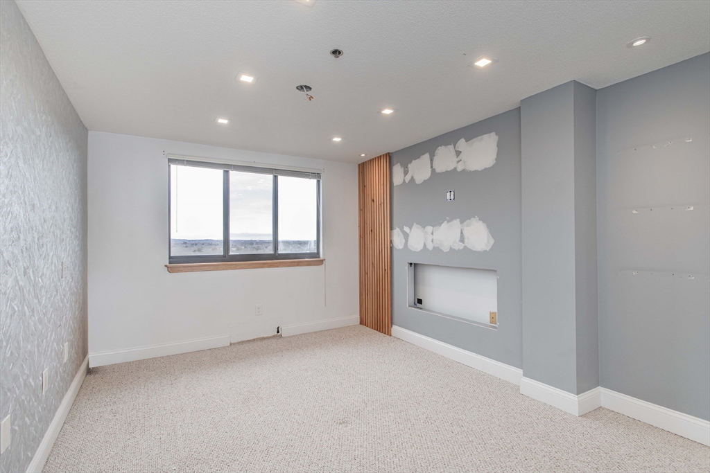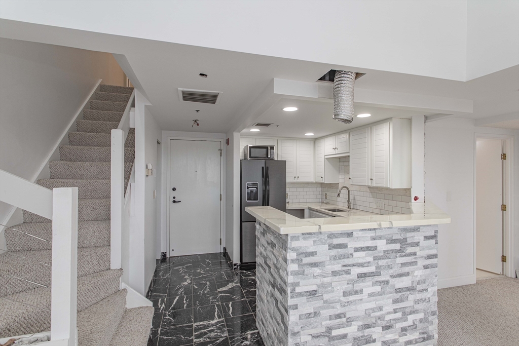 Welcome to The Elms - Perched on the 8th floor, this rare two-level townhouse-style penthouse offers a sense of space, light, and privacy that’s hard to find. With nearly 1,000 SF soaring cathedral ceilings and an open layout, the home feels airy and inviting from the moment you step inside. Sweeping views stretch beyond the windows, creating a peaceful backdrop for both quiet mornings and cozy evenings at home. The galley kitchen features white cabinetry, stainless steel appliances, recessed lighting, and a tiled backsplash, opening effortlessly to the main living area—perfect for gathering with friends or simply enjoying your own retreat in the sky. A thoughtful 1.5-bath layout and true two-level design provide comfort and separation of space. Elevator building with in-ground pool and low $389/month condo fee. Convenient to Weymouth’s commuter rail for an easy ride into Boston. Sold as-is, where is, offering a wonderful opportunity to personalize and make it your own.