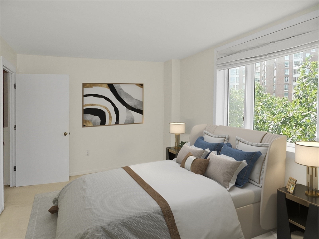 Bright and spacious luxury one bedroom home with European balcony overlooking beautifully landscaped courtyard with fountain. Fully applianced gourmet kitchen. Generously sized master suite. Luxurious marble bathroom. In-unit laundry. Garage parking for one car. 24-hour concierge service. Health club and indoor lap pool. Close to shopping mall, fine restaurants, transportation, MIT, MGH, Biogen, Genzyme and Harvard. Roof deck with the Charles River and Boston skyline views. The building has two guest suites for your visitors.