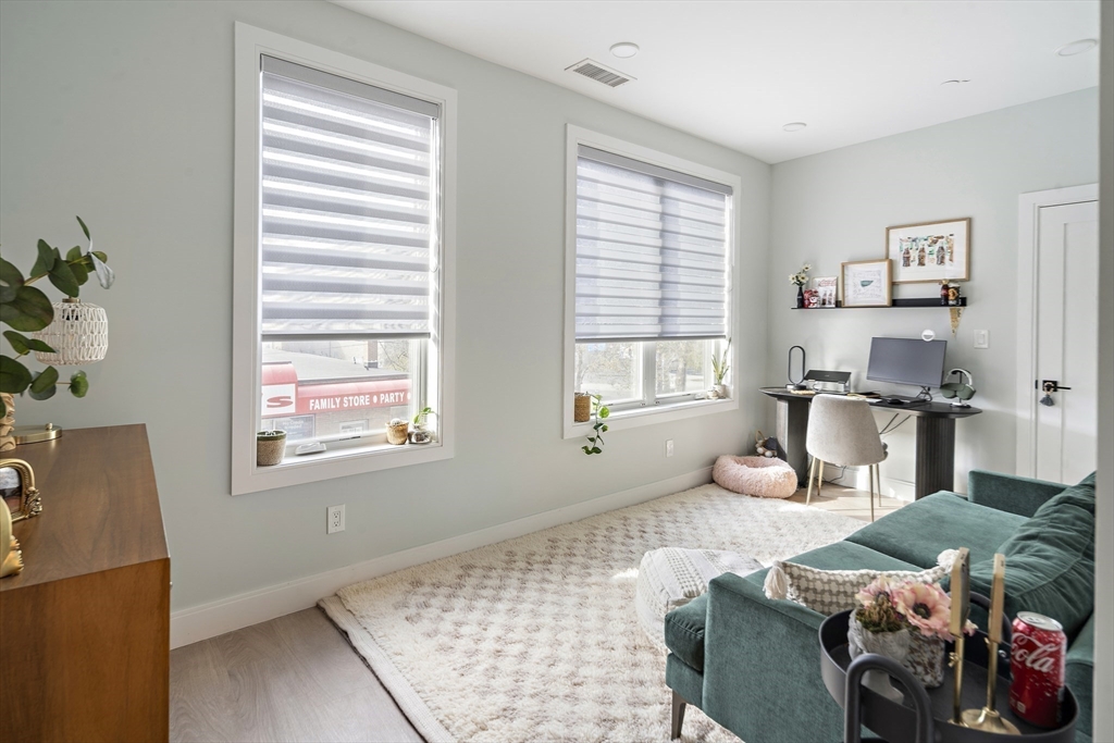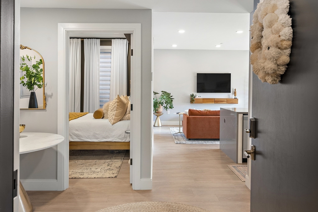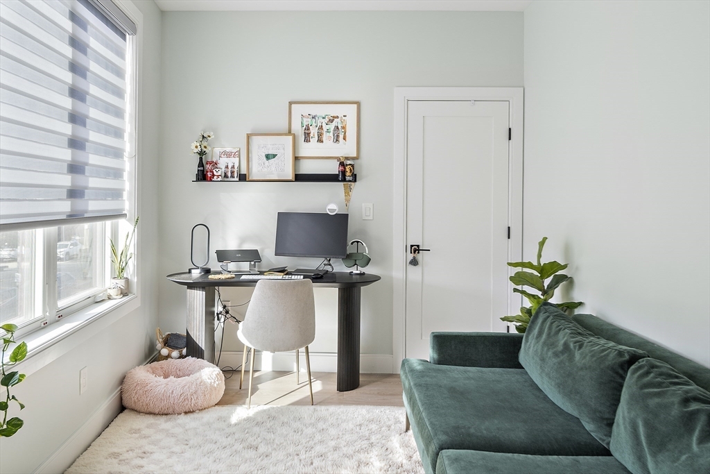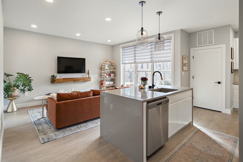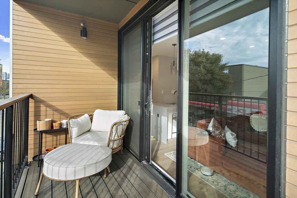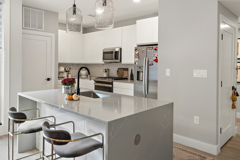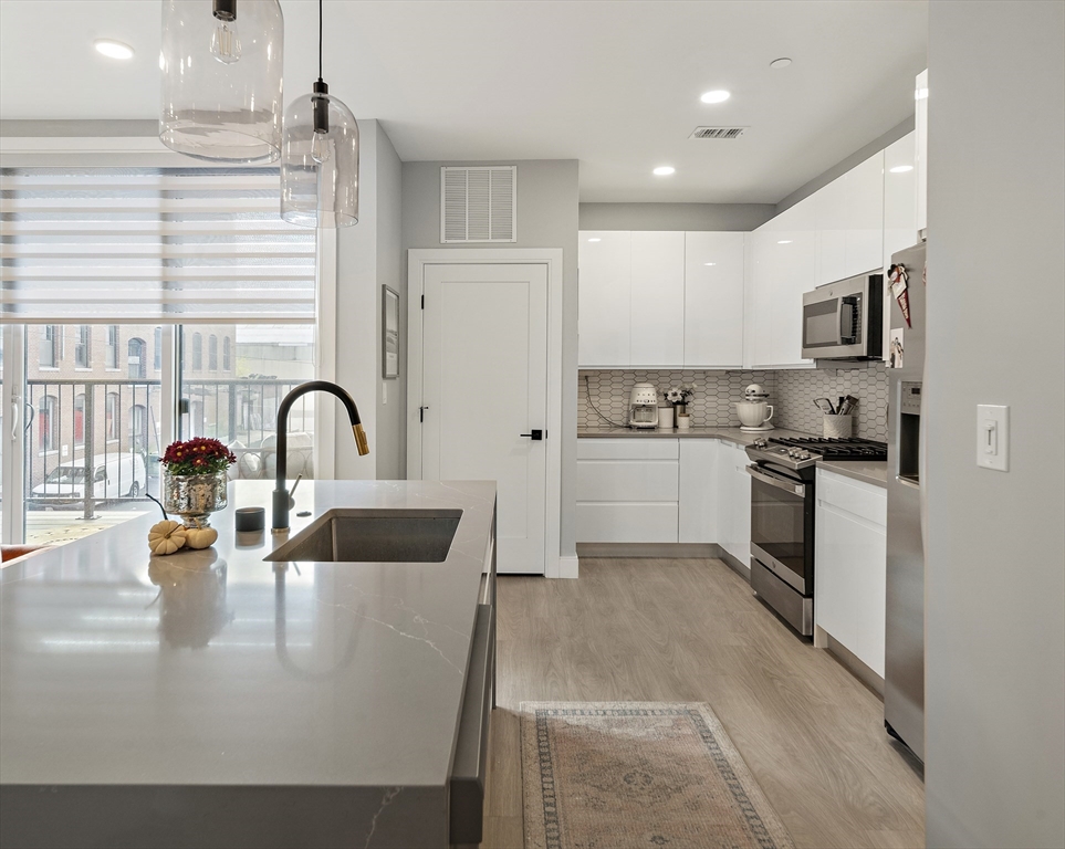 Welcome home to this stunning 2-bed, 2-bath condo in one of East Boston’s most sought-after neighborhoods. Built in 2022, this modern residence offers a like-new feel with a sun-filled open-concept layout designed for both comfort and style. The sleek kitchen features quartz countertops, slab cabinetry, and stainless steel appliances, opening seamlessly into the bright living area and your first private deck—perfect for morning coffee or unwinding at the end of the day. A second private deck provides additional outdoor space ideal for entertaining. White oak flooring adds warmth throughout, while central AC and in-unit laundry deliver everyday convenience. Enjoy generous closet space plus a deeded storage unit. Residents also have access to a common roof deck showcasing sweeping views of the Boston skyline and waterfront. Conveniently located near shopping, dining, nightlife, major highways, Logan Airport, and public transit—this is East Boston living at its best.