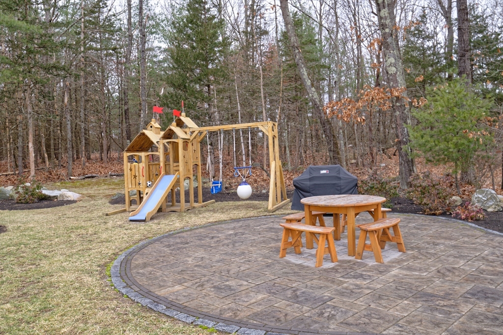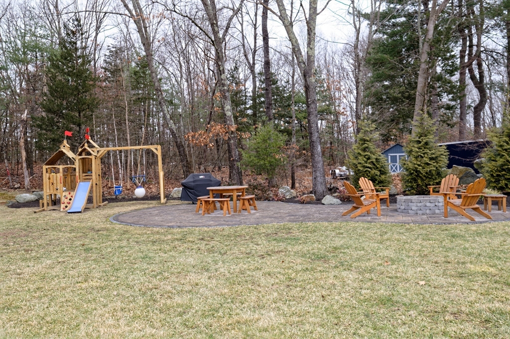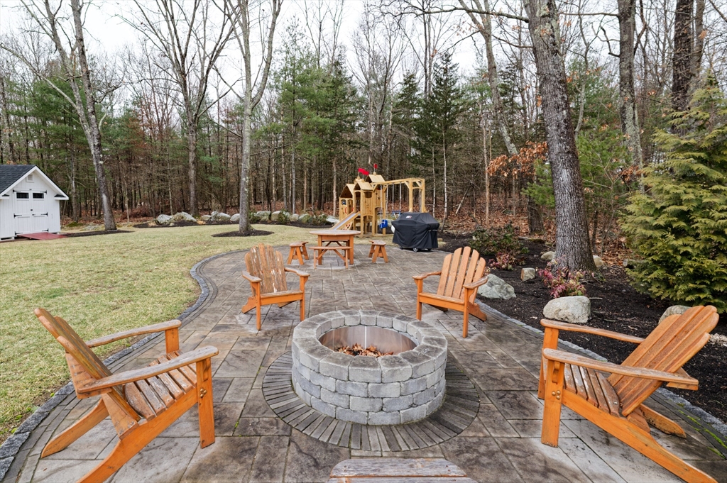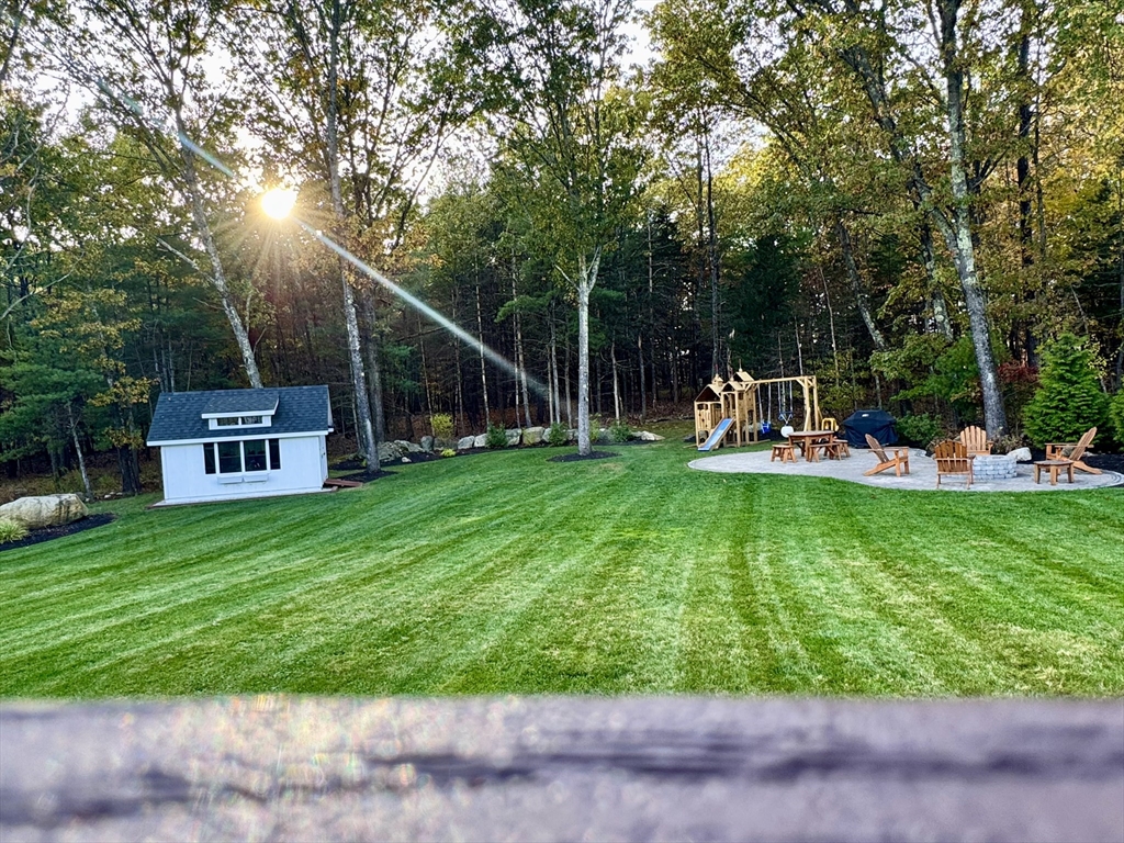 Almost-new construction set on 1.35 acres of flat, beautifully landscaped grounds, offering the outdoor space and privacy buyers seek. The vaulted living room features a striking marble fireplace and flows into a chef’s kitchen with quartz countertops, a large island, and custom backsplash. The dining area includes built-in wine cooler and bar, and sunlit sitting area ideal for entertaining. Upstairs, a spacious primary suite with a custom California Closet and three additional bedrooms showcase designer lighting and curated window treatments. Primary bath offers a tiled shower, dual sinks, and counter space. Owned solar panels provide efficiency and no electric bills.The expansive backyard features a large deck and patio with firepit, designer shed, and play area, with wooded land beyond for recreation and exploration. Conveniently located near Stoddard Park, this home offers a rare blend of luxury, land, and efficiency. Open house Saturday and Sunday. Showings start Friday