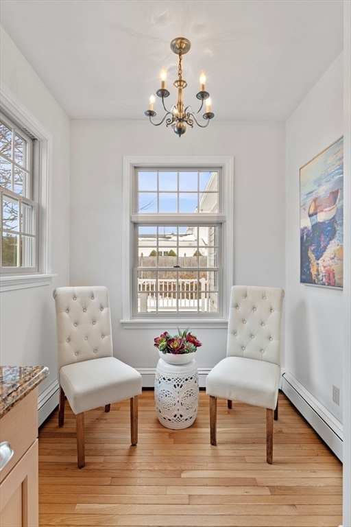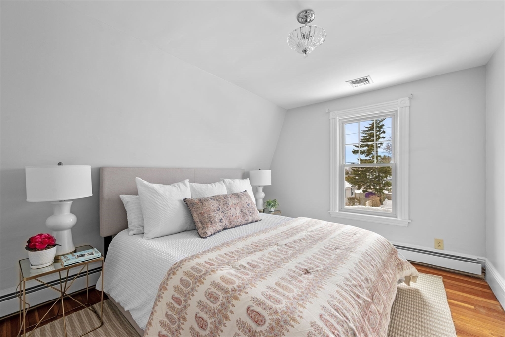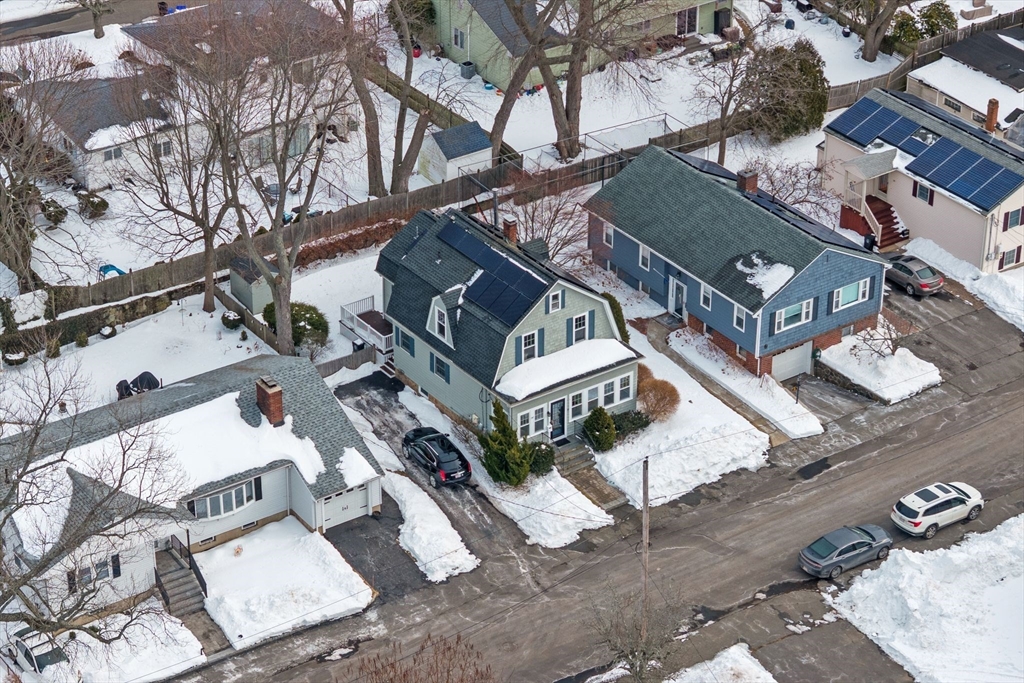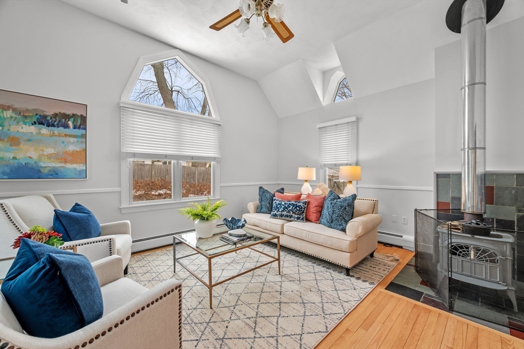 Welcome to this updated Colonial on a quiet dead-end cul-de-sac near Phillips Park. The renovated kitchen offers granite countertops, stainless steel appliances, and space for casual dining, while the updated first-floor full bath adds modern style and convenience. Hardwood floors run through the main living areas, flowing from the living and dining rooms into a rear family room with cathedral ceiling, wood stove, and direct access to the deck and patio. An enclosed front porch adds flexible space. Upstairs are three bedrooms and a full bath, with a finished bonus room and laundry in the basement. Owned solar panels help keep utility costs low, plus a new storm door and rear back door. The level fenced yard is landscaped with lighting and irrigation. Close proximity to the parks, field, beaches & wonderful schools! Move right in and start enjoying life in this vibrant seaside town!