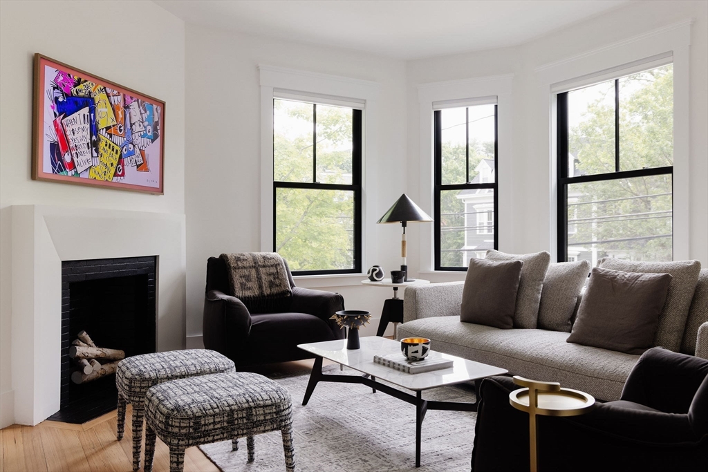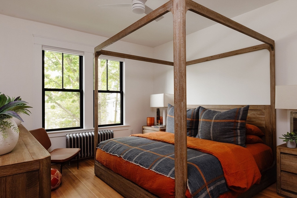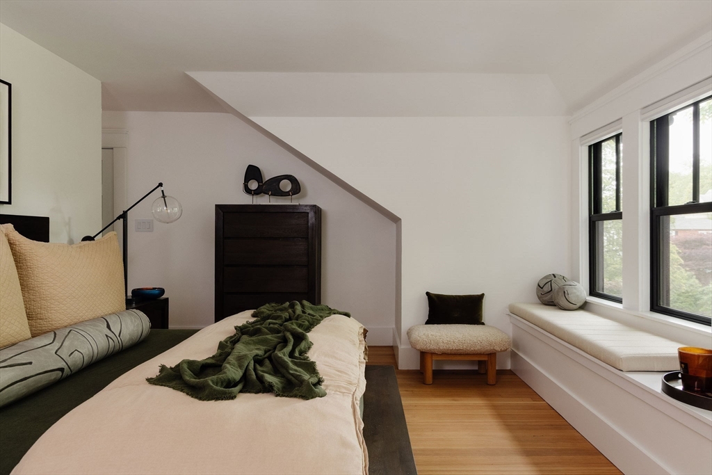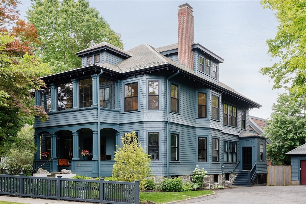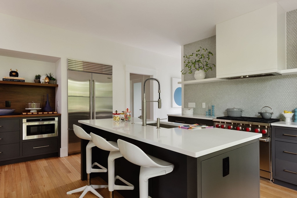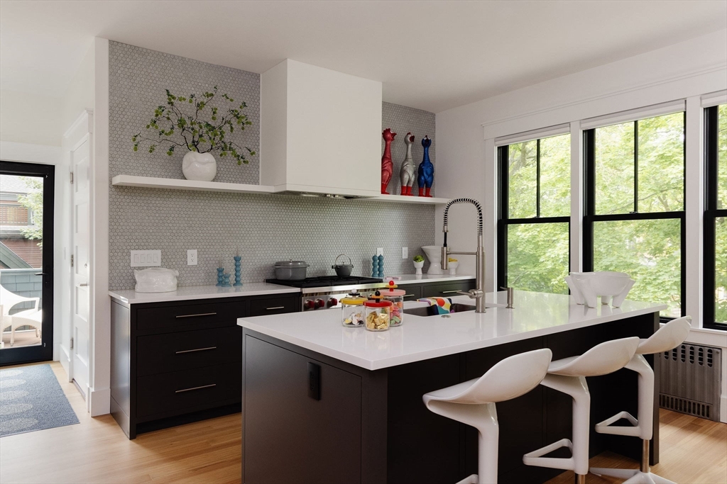 East Watertown. Superb modern condominium in restored 1910ca Shingle-Style/Colonial Revival. Fully gutted to the studs, this spacious 4 bedroom property features 2 primary suites (one on each floor) a fireplaced living room & dining room, a stunning custom-built kitchen with Sub Zero/Wolf stainless steel Appliances, SileStone counters, Walnut espresso bar and reclaimed wood floors. There's an oversized front-to-back family room/game room on the top floor with vaulted ceilings, a half bath, 3-exposures, reclaimed wood floors and a wall of windows facing West. Also, full-insulation and sound-proofing, modern bathrooms with Japanese tile, Kohler and Duravit fixtures, large Marvin windows & doors, private decks, enclosed porches, patios as well as exclusive-use yard space. Two-zone central air-conditioning, 3-zone gas heating w/fully restored hot water radiators, new plumbing, walk-in closets, in-unit laundry, ample storage in basement and garage.
