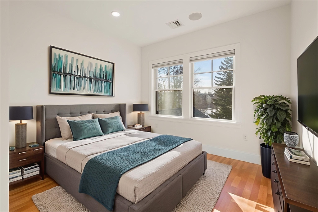 Enjoy upscale urban comfort in this bright two-bedroom, two-bath home perfectly situated in vibrant Roslindale Village. Expansive windows invite abundant sunlight while framing dynamic neighborhood views. Located in a stylish, professionally managed elevator building only a decade old, the residence offers a sleek open design accented by recessed lighting, detailed trim, and contemporary finishes. The gourmet kitchen features quartz surfaces, stainless appliances, a custom tile backsplash, and a spacious breakfast bar suited for entertaining. Two beautifully appointed baths include glass-enclosed tile showers, with a private en-suite serving the primary bedroom, which also offers a walk-in closet. A generous second bedroom provides flexible use. Additional features include central air, high-efficiency systems, built-in Bluetooth audio, in-unit laundry, and the convenience of one garage and one off-street parking space.