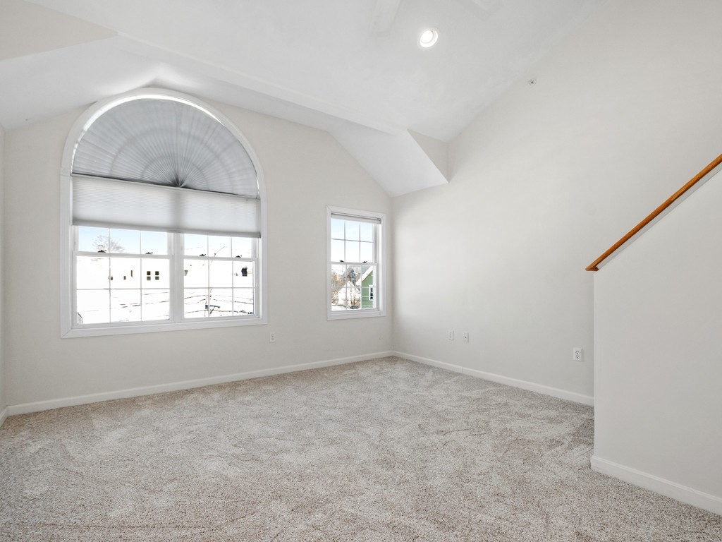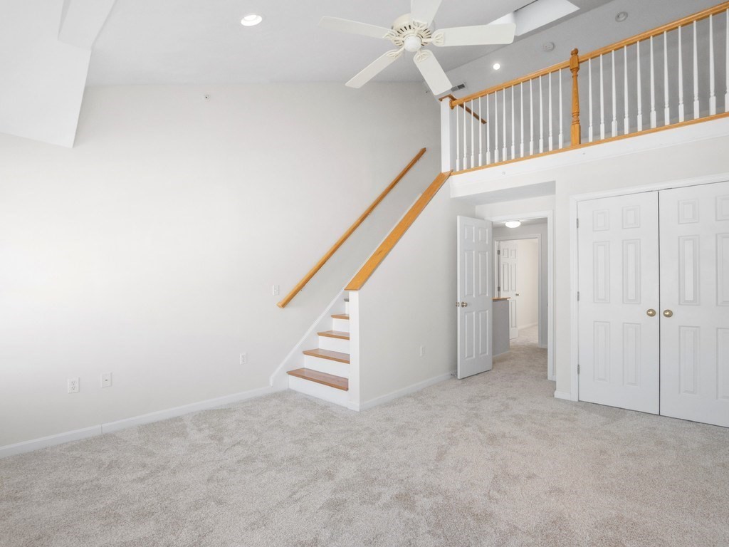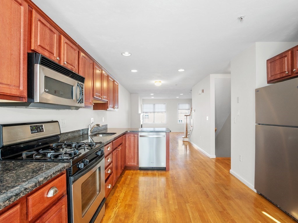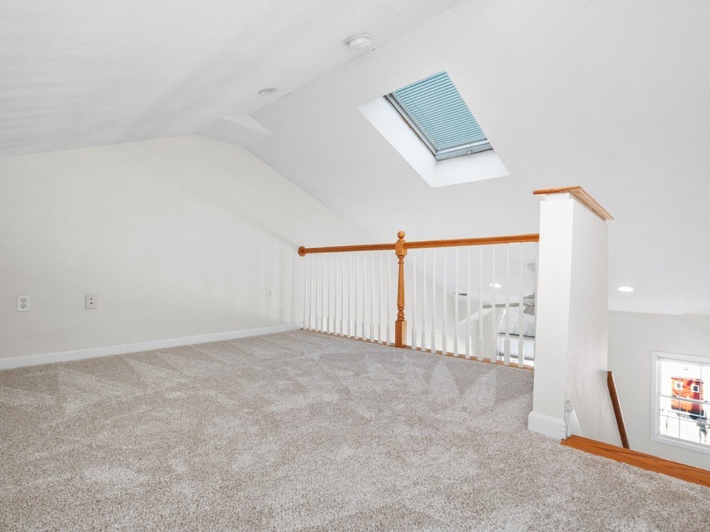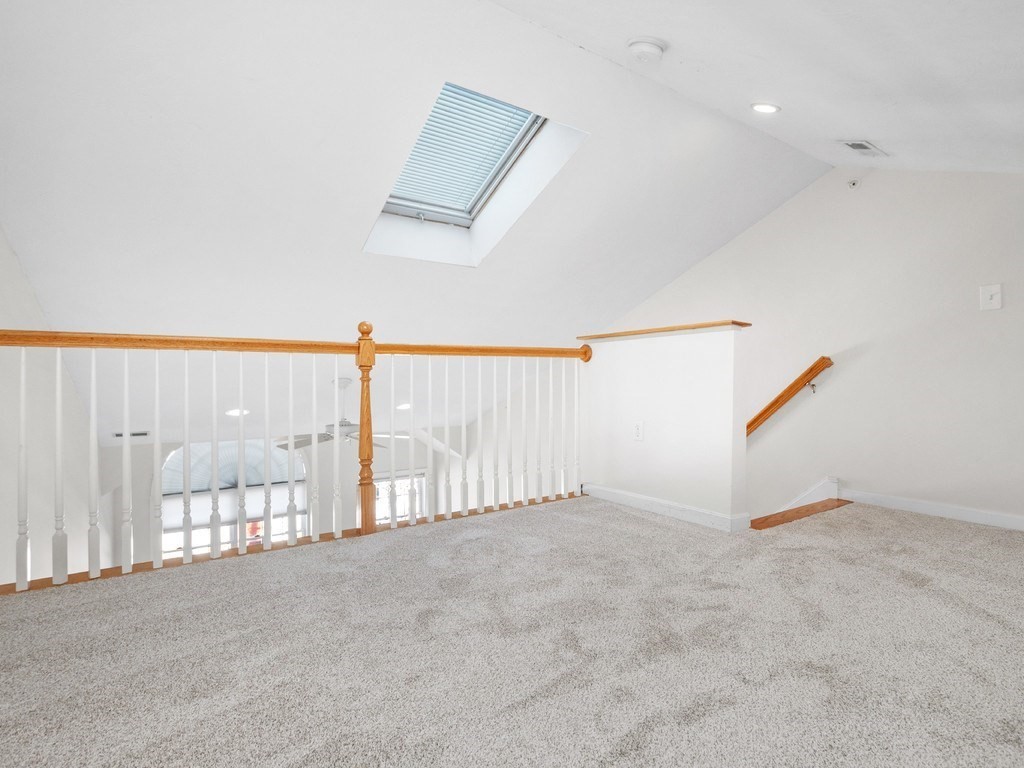 Welcome to this stunning townhome in Waltham's coveted Fieldstone Crossing. Freshly painted and updated with newer roof, siding, HVAC system, decks, appliances, and new bedroom carpeting. This modern, low-maintenance home offers central air and a direct-entry garage with custom floors, lighting, and two-car parking. Just steps from Moody Street’s restaurants, shops, and public transportation, it features a bright living room with hardwood floors, recessed lighting, a gas fireplace, and an open layout flowing into the dining area and breakfast bar. The kitchen includes granite counters, stainless-steel appliances, gas cooking, ample cabinetry, and French doors to a private balcony. The upper level offers two bedrooms, including a spacious primary with cathedral ceilings, an arched picture window, and a skylit loft ideal for an office or nursery, plus ceramic tile baths and more! Smart, stylish living in a prime Waltham location.