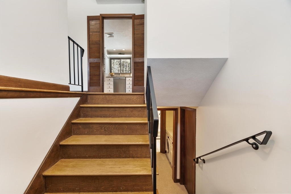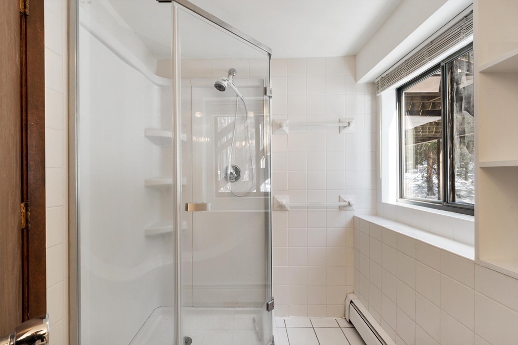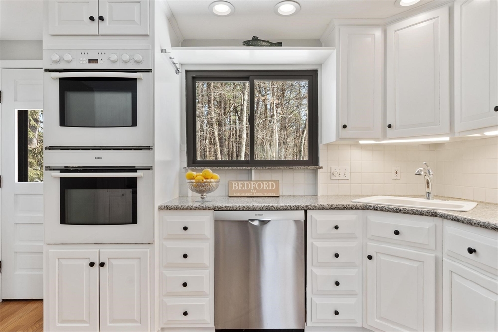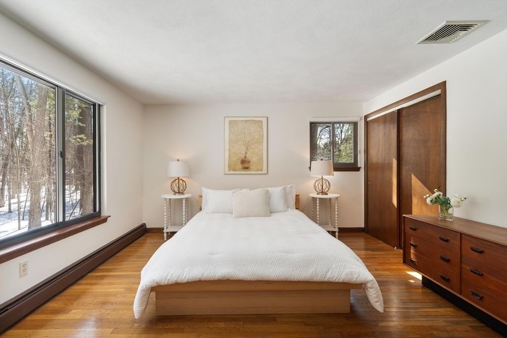 This contemporary split-level home in desirable Bedford blends comfort, space, and a seamless connection to nature! The sun-filled living room welcomes you with vaulted ceilings, exposed beams, and a cozy fireplace. The living room flows seamlessly to the dining room with direct access to a bright sunroom and oversized mahogany deck overlooking the private, wooded backyard. The centrally located kitchen offers granite countertops and birch cabinetry for easy entertaining. Three bedrooms complete the upper level, including a spacious primary suite, along with a hallway bathroom featuring a tub with tranquil views of the trees. The lower level adds a generous family room with a second fireplace, laundry nook, additional bedroom, and full bathroom - perfect for guests, home office, or flexible living options. A sheltered patio and cedar outbuilding with screened porch enhance this peaceful setting. Convenient access to Rte 3, Rte 128, and the Minuteman Bikeway.