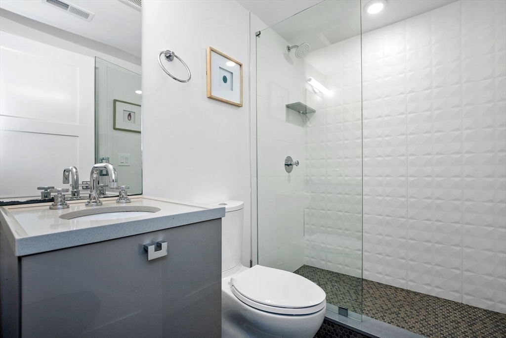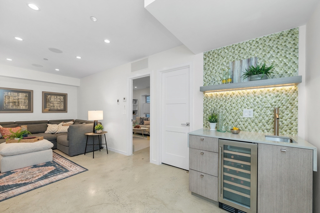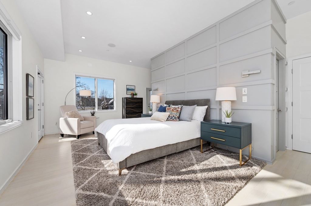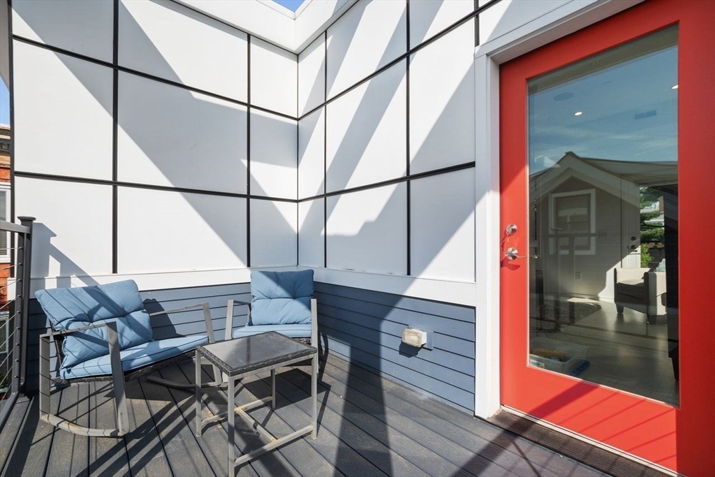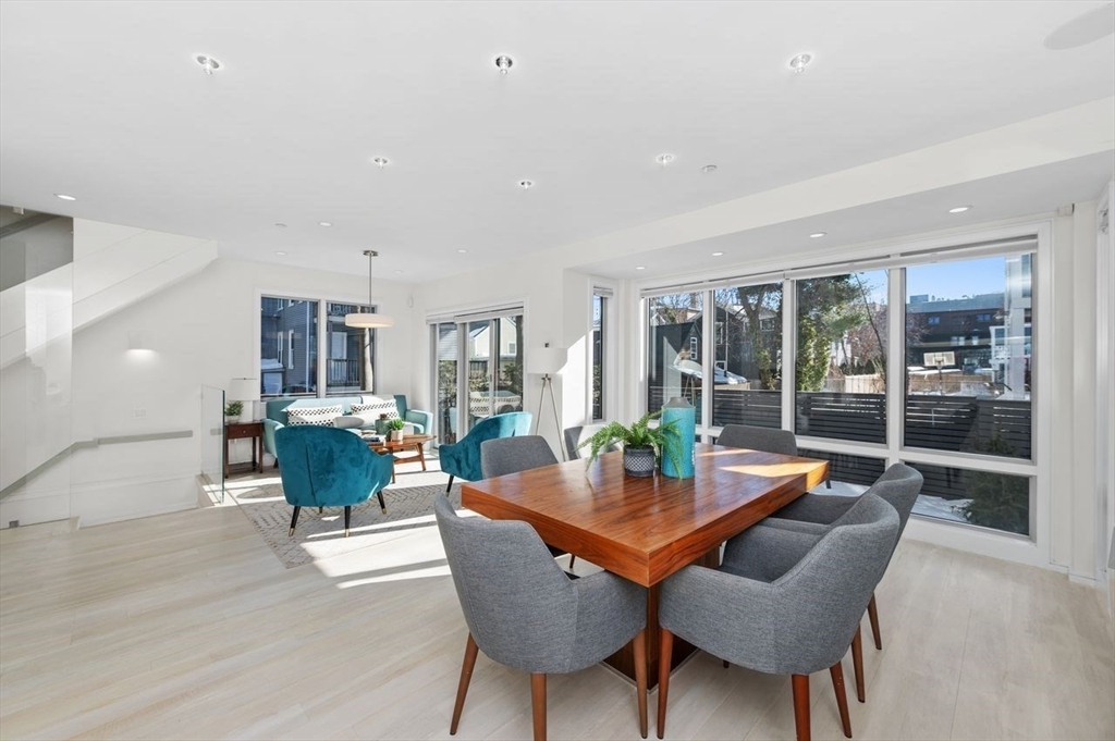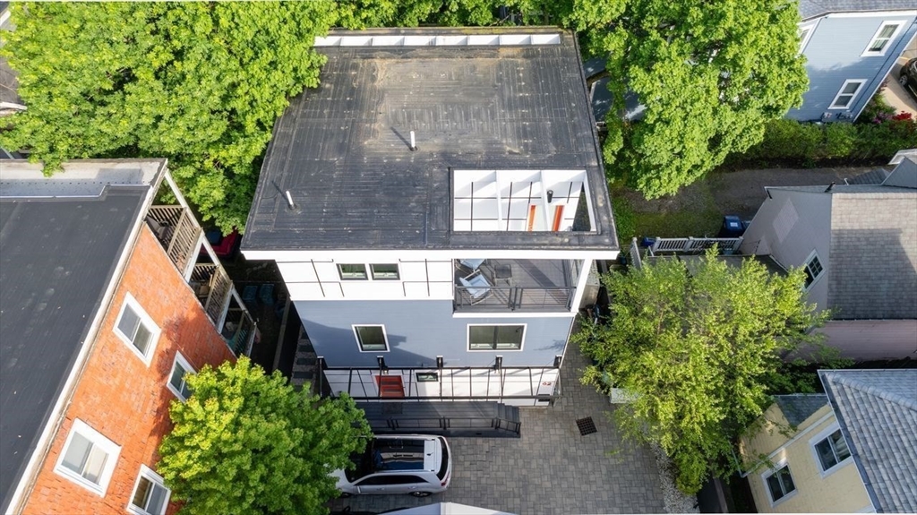 Tucked away from the street, this free-standing contemporary home, built in 2018, offers privacy and modern luxury in Cambridgeport. Thoughtfully designed, it features an open living/dining area with a gas fireplace and direct access to a private stone patio and yard. The sleek European-style kitchen includes Thermador appliances and stone countertops. A custom staircase with glass panels leads to two spacious second-floor bedrooms—one with a balcony—a full bath with double vanity, and in-unit laundry. The top-floor primary suite feels like a treetop retreat with two walk-in closets, a spa-like bath, and two balconies. The finished lower level, with separate entrance, includes a family room with wet bar, guest bedroom, and full bath. Ideally located near Central, Harvard, and Kendall Squares, Mass Ave shops and restaurants, and the Charles River, this stylish home blends comfort, convenience, and quality craftsmanship.