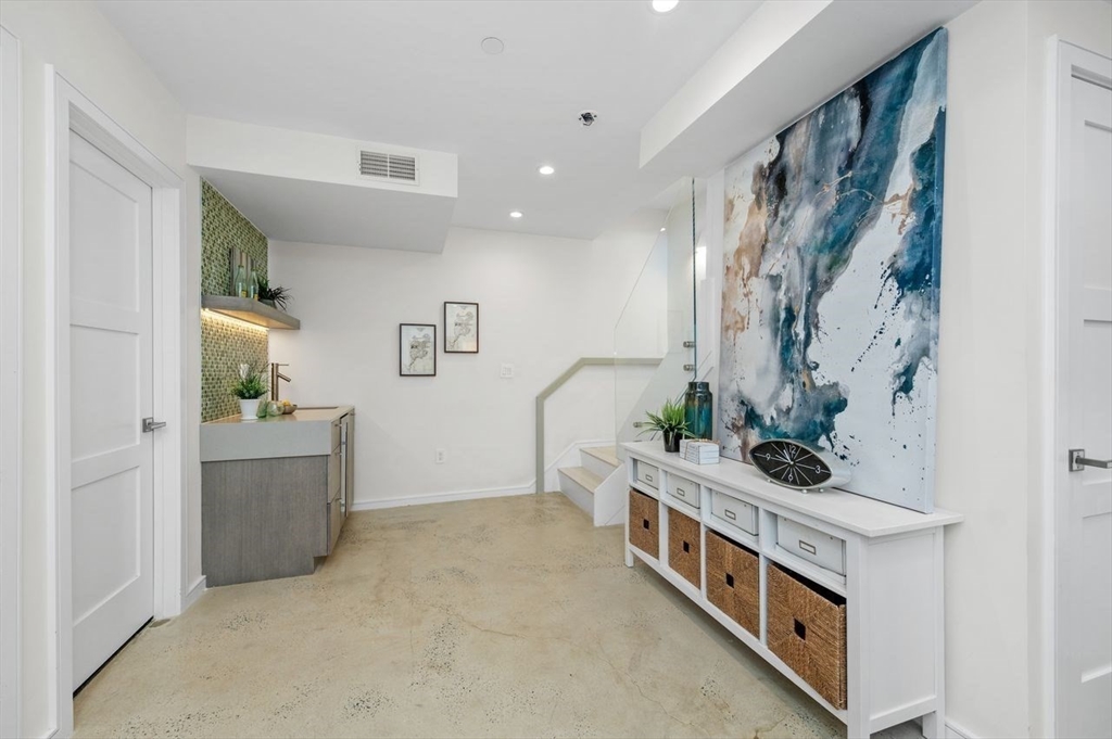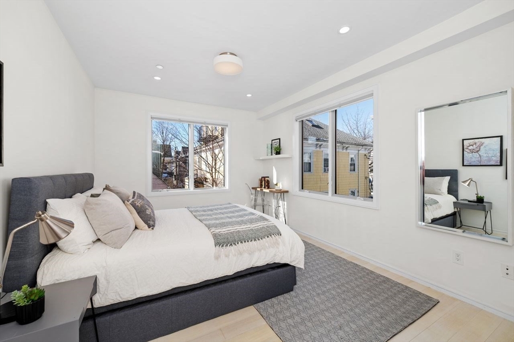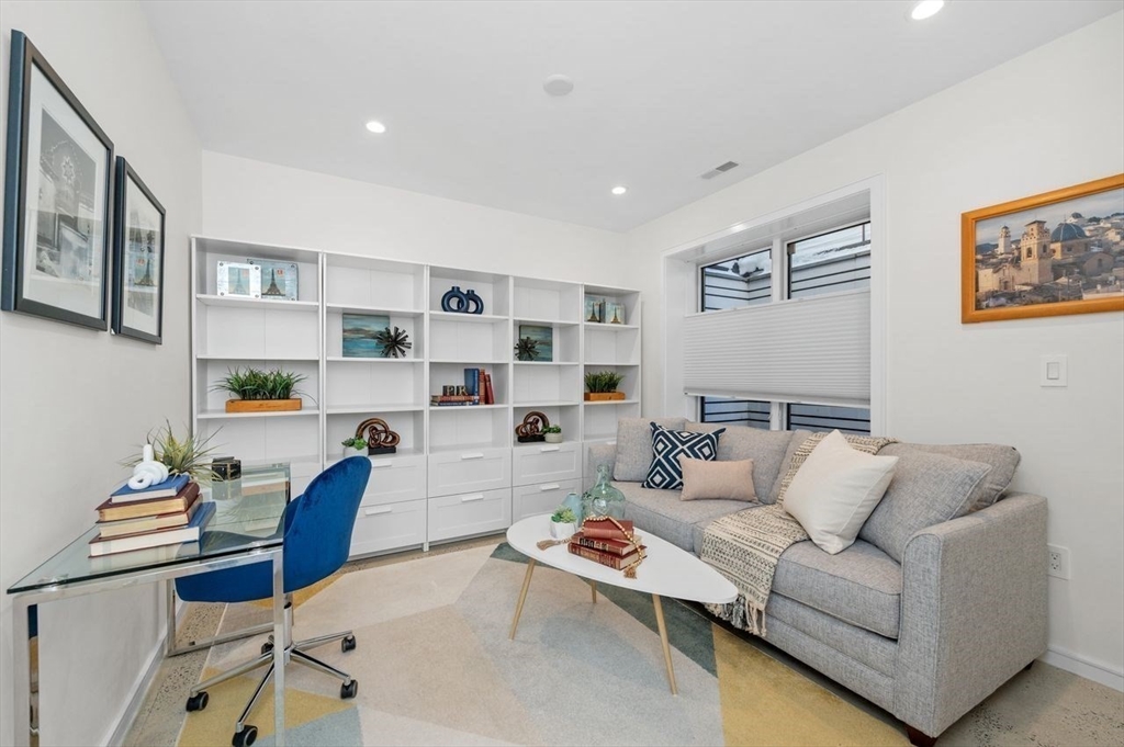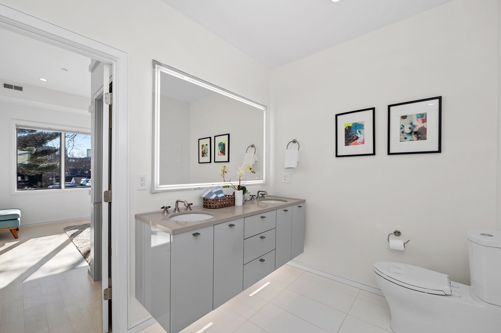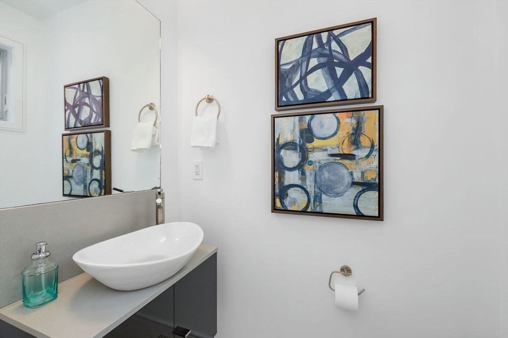 Tucked away from the street, this free-standing contemporary home, built in 2018, offers privacy and modern luxury in Cambridgeport. Thoughtfully designed, it features an open living/dining area with a gas fireplace and direct access to a private stone patio and yard. The sleek European-style kitchen includes Thermador appliances and stone countertops. A custom staircase with glass panels leads to two spacious second-floor bedrooms—one with a balcony—a full bath with double vanity, and in-unit laundry. The top-floor primary suite feels like a treetop retreat with two walk-in closets, a spa-like bath, and two balconies. The finished lower level, with separate entrance, includes a family room with wet bar, guest bedroom, and full bath. Ideally located near Central, Harvard, and Kendall Squares, Mass Ave shops and restaurants, and the Charles River, this stylish home blends comfort, convenience, and quality craftsmanship.
