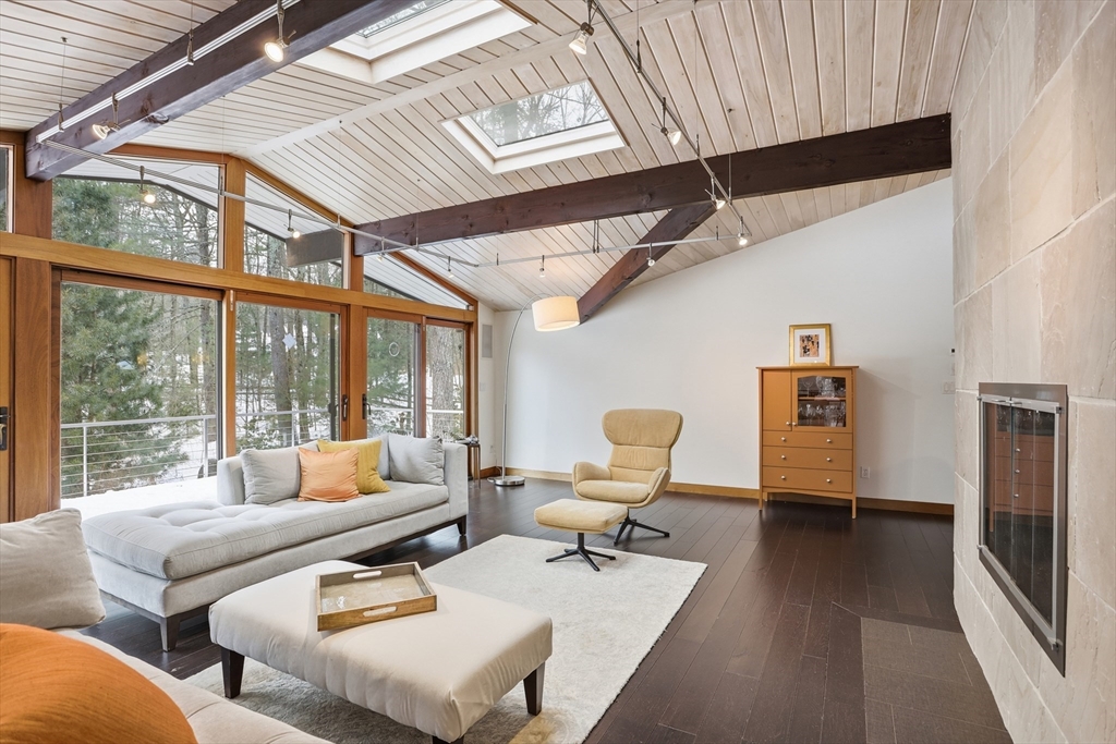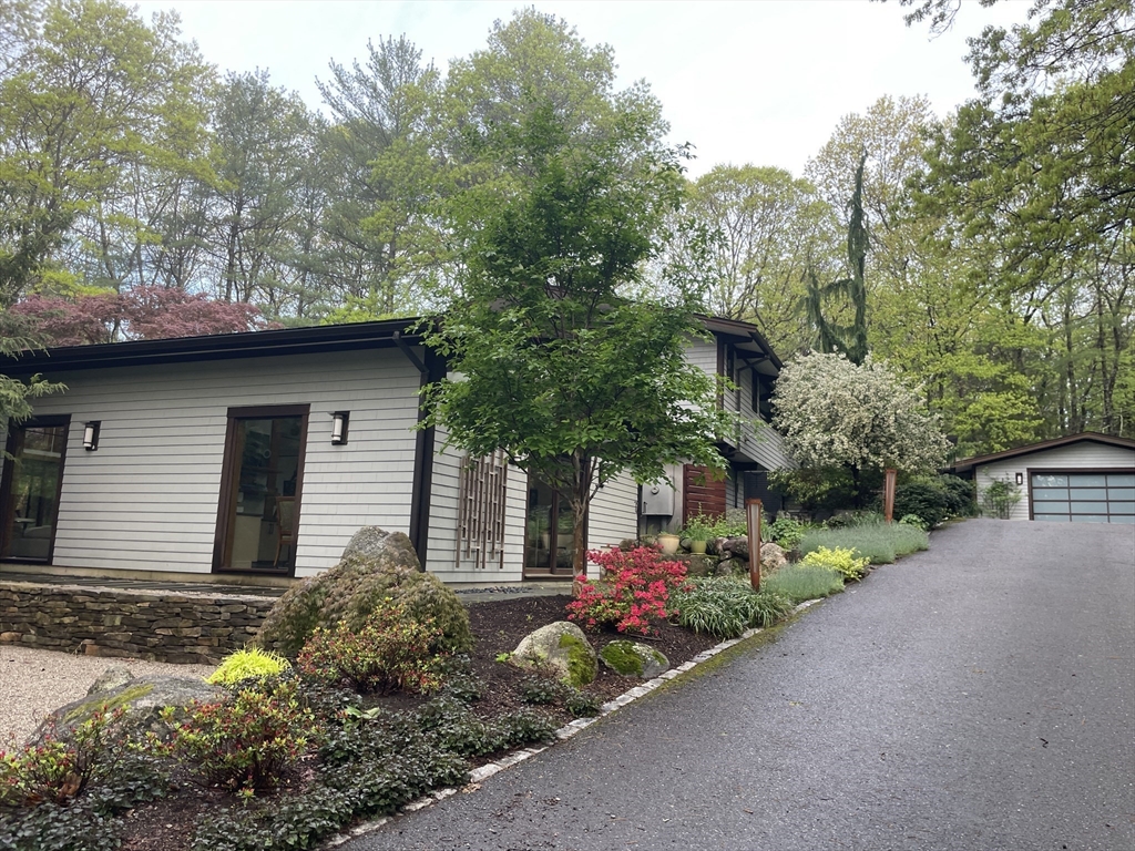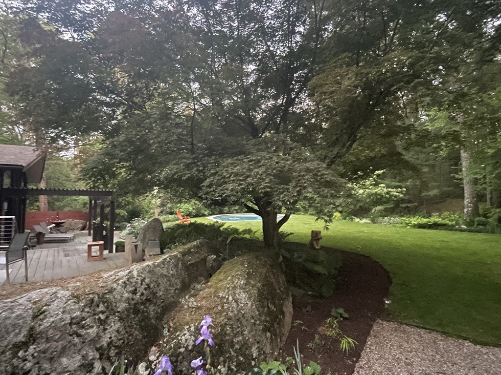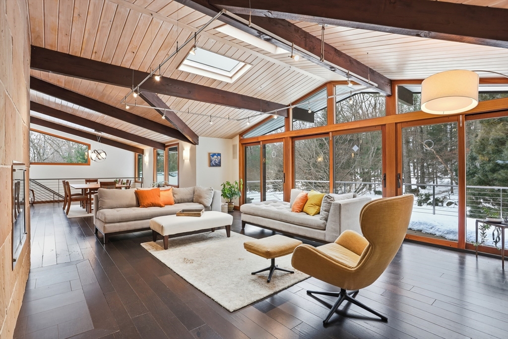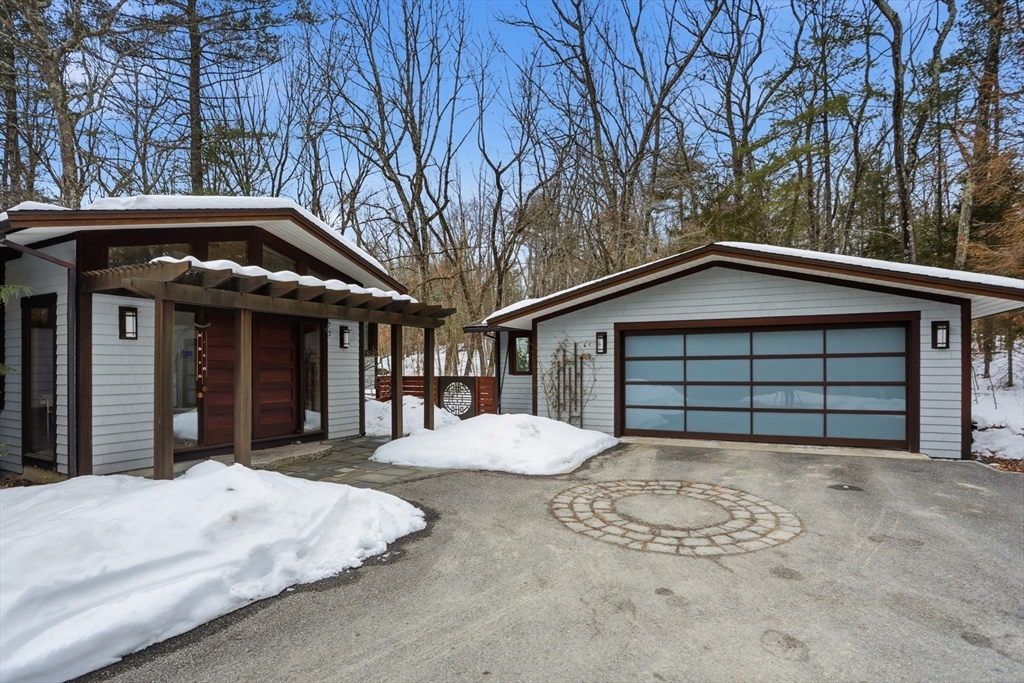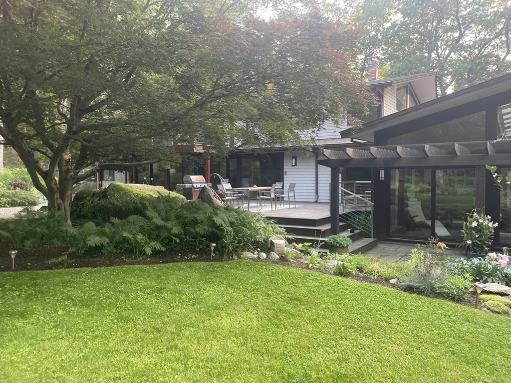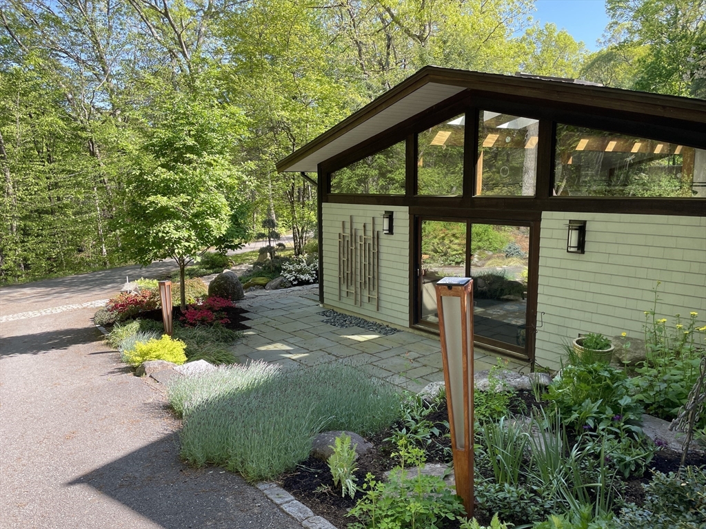 Extraordinary 11-room reimagined Deck Home Contemporary-a masterclass in design & craftsmanship. Stripped to the studs & thoughtfully expanded in 2007, blending Japanese country warmth w/mid-century modern simplicity. Radiant heat throughout, soaring ceilings, exposed beams, solid mahogany doors, skylights, Caerstone & limestone counters create a rare architectural statement. Walls of glass dissolve the boundary between indoors & out, flooding the home w/natural light & serene views. Open living spaces flow effortlessly, offering flexibility for office, gym, media rm or potential ADU. Dramatic wing w/15’ ceilings, 16 skylights & sliders open to a 25x10 pergola-covered patio. Landscape equally as inspiring—featured on the Carlisle Garden Tour—w/Japanese garden, rock outcroppings, specimen plantings, stone walls, expansive deck & heated Gunite saltwater pool. Privately sited on a cul-de-sac. A true value where quality & improvements far exceed the asking price.