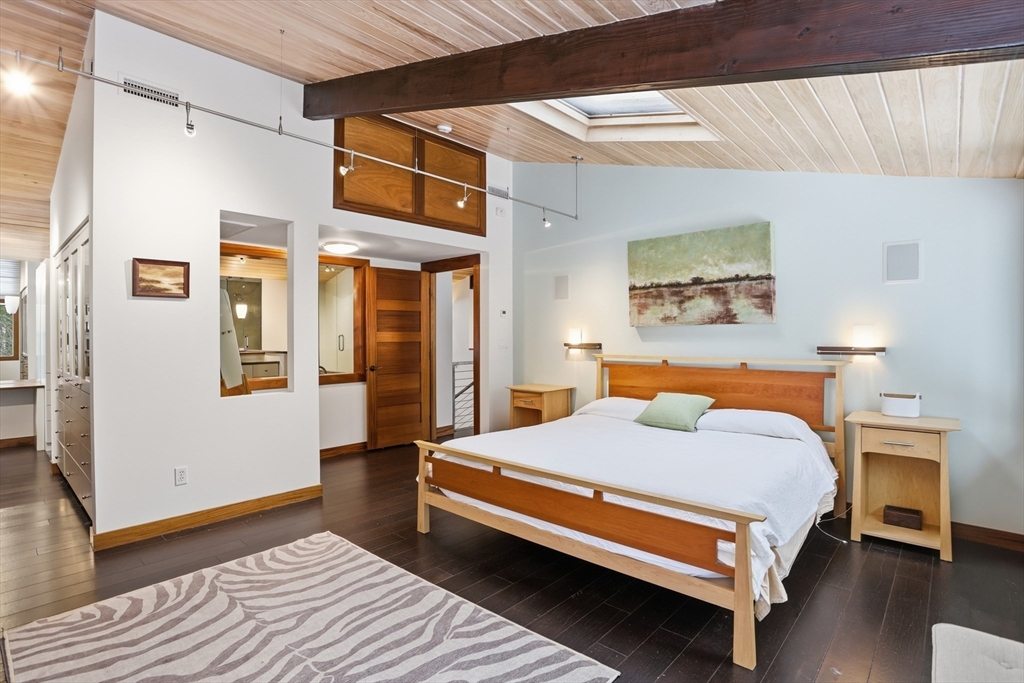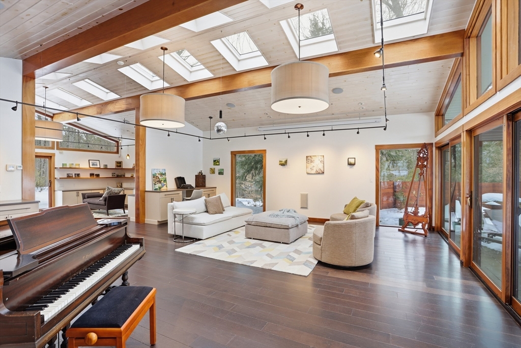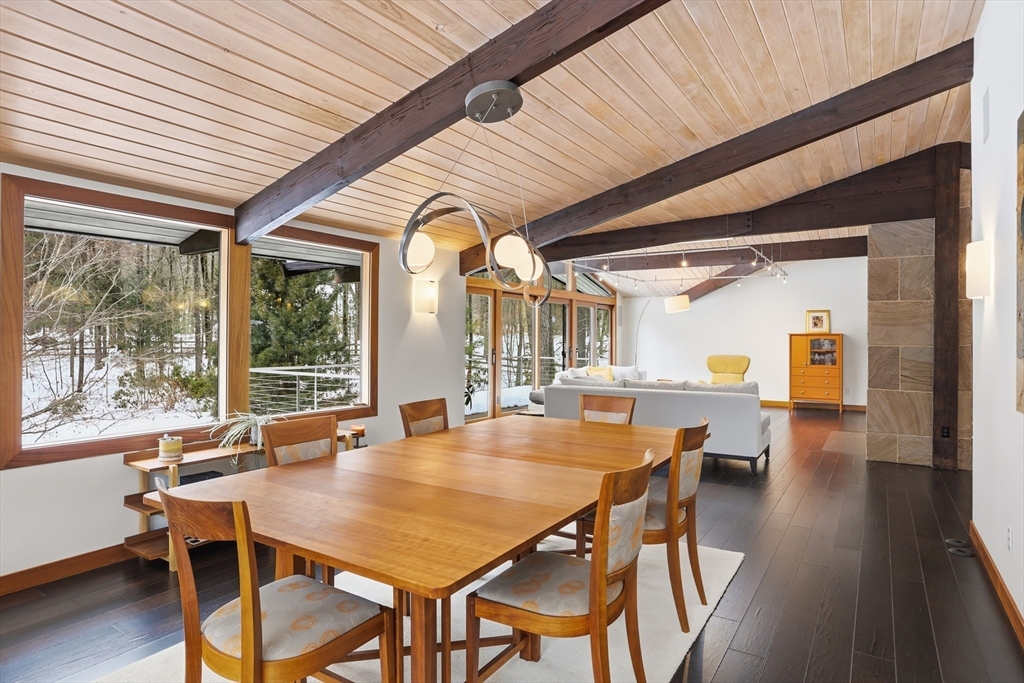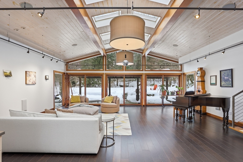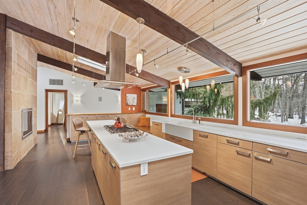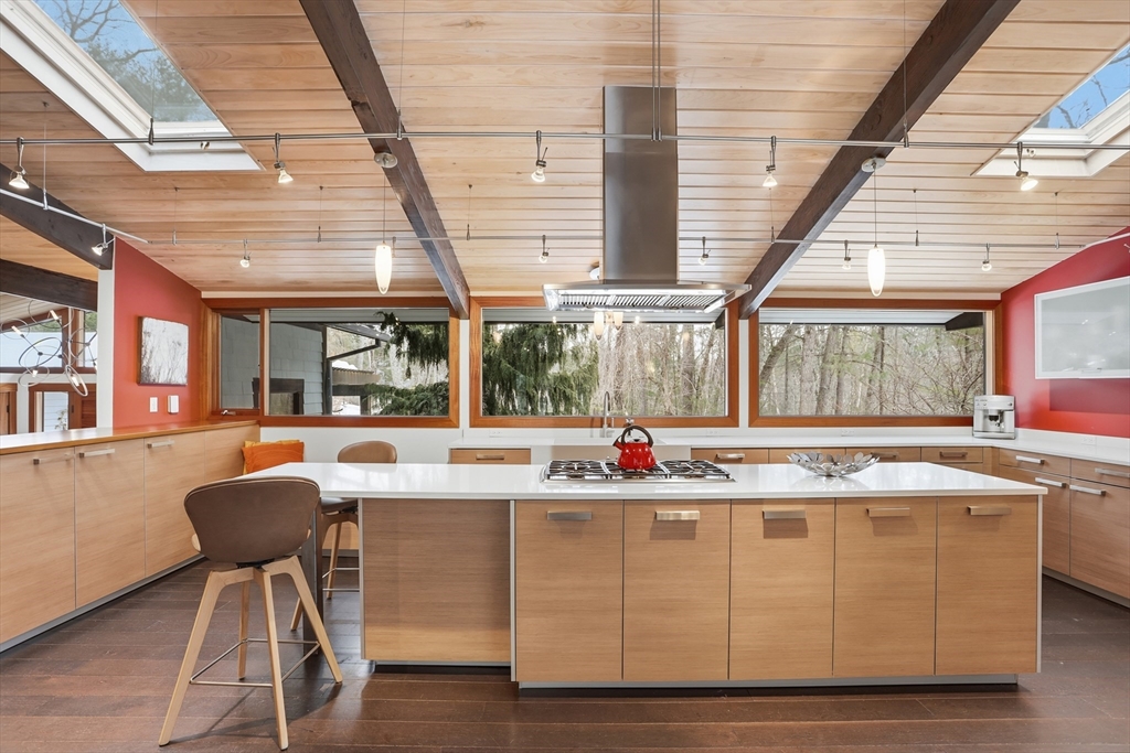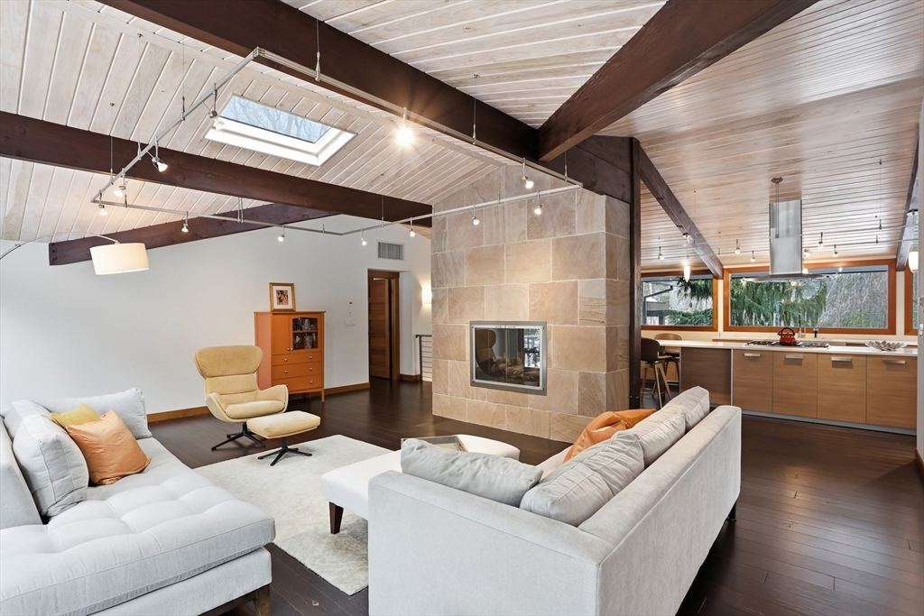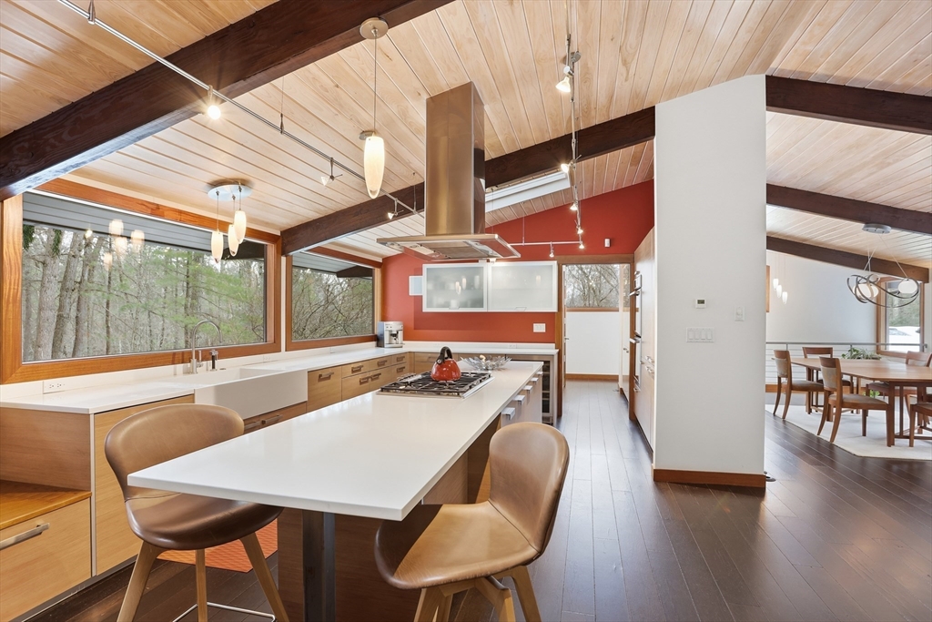 Extraordinary 11-room reimagined Deck Home Contemporary-a masterclass in design & craftsmanship. Stripped to the studs & thoughtfully expanded in 2007, blending Japanese country warmth w/mid-century modern simplicity. Radiant heat throughout, soaring ceilings, exposed beams, solid mahogany doors, skylights, Caerstone & limestone counters create a rare architectural statement. Walls of glass dissolve the boundary between indoors & out, flooding the home w/natural light & serene views. Open living spaces flow effortlessly, offering flexibility for office, gym, media rm or potential ADU. Dramatic wing w/15’ ceilings, 16 skylights & sliders open to a 25x10 pergola-covered patio. Landscape equally as inspiring—featured on the Carlisle Garden Tour—w/Japanese garden, rock outcroppings, specimen plantings, stone walls, expansive deck & heated Gunite saltwater pool. Privately sited on a cul-de-sac. A true value where quality & improvements far exceed the asking price.