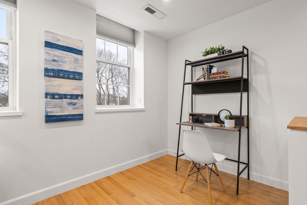 Thoughtfully renovated 2 bed, 1 bath condo is nestled within JP’s highly desirable Woodbourne neighborhood. This spectacular, upper-level unit is located inside a converted school house, where oversized windows bring in brilliant natural light throughout the home. A private entrance on the 1st floor ascends to an open floor plan encompassing a living room, dining area and home office nook. All millwork & doors throughout have been replaced & the entire unit repainted. Custom closet added for additional in-unit storage. Lovely kitchen features ample cabinets & brand new SS appliances. Both bedrooms are spacious and have oversized closets w/custom organizers. Noteworthy features include central A/C, 2 exclusive use parking spaces, in-unit laundry + shared common grounds. Professionally managed HOA w/ high owner occupancy includes landscaping and snow removal. Easy walk to Forest Hills Station (Orange Line T & Commuter Rail), Arboretum, restaurants, cafes, and all that JP has to offer.
