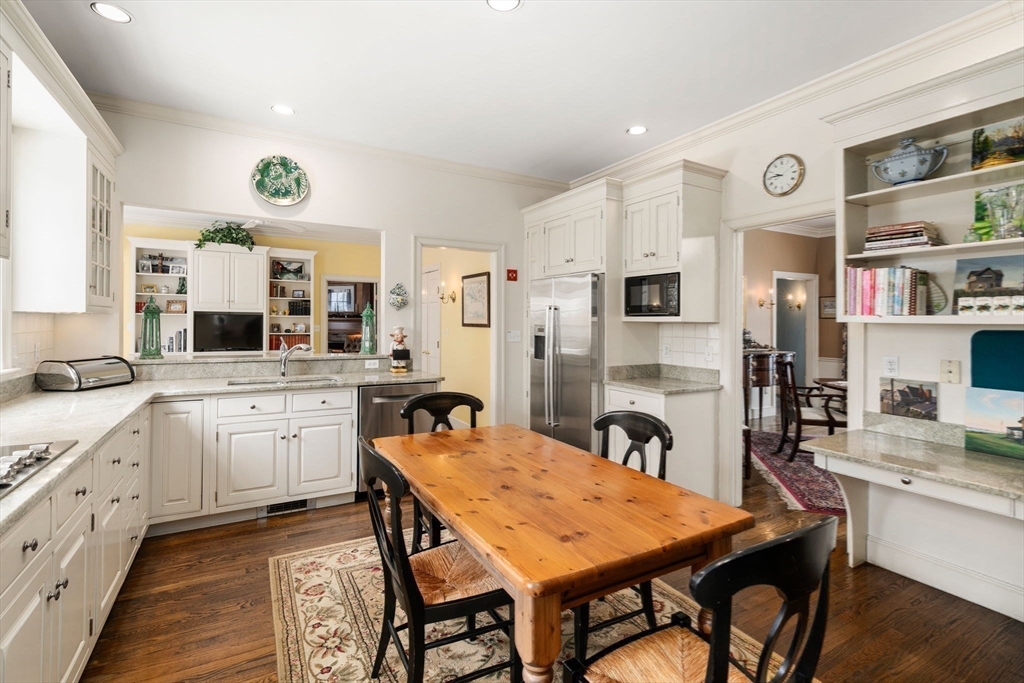 A custom-built Royal Barry Wills design for these owners sited just above the town of Belmont on a 20,000 + sq. ft lot with views to the Boston skyline. This home features oversized windows with sun-drenched rooms, high ceilings, craftsman style detail in built-ins, moldings and fireplace surround. You are welcomed into this house by a lovely open foyer with a spiral staircase to the second floor, a living room with a fireplace, a gorgeous dining room with fireplace and built-in corner cupboards, an office with a beautiful fireplace with wood surround and built-ins, a family room with built-ins adjacent to an eat-in 2015 new kitchen, additionally on the first floor there are closets for mudroom storage, half bath and a laundry room. The second floor has four corner bedrooms including the primary and two full baths. The lower level has a walk out patio area, a built-in bar area and a wonderful open space for billiards, ping-pong, poker table and a TV room.