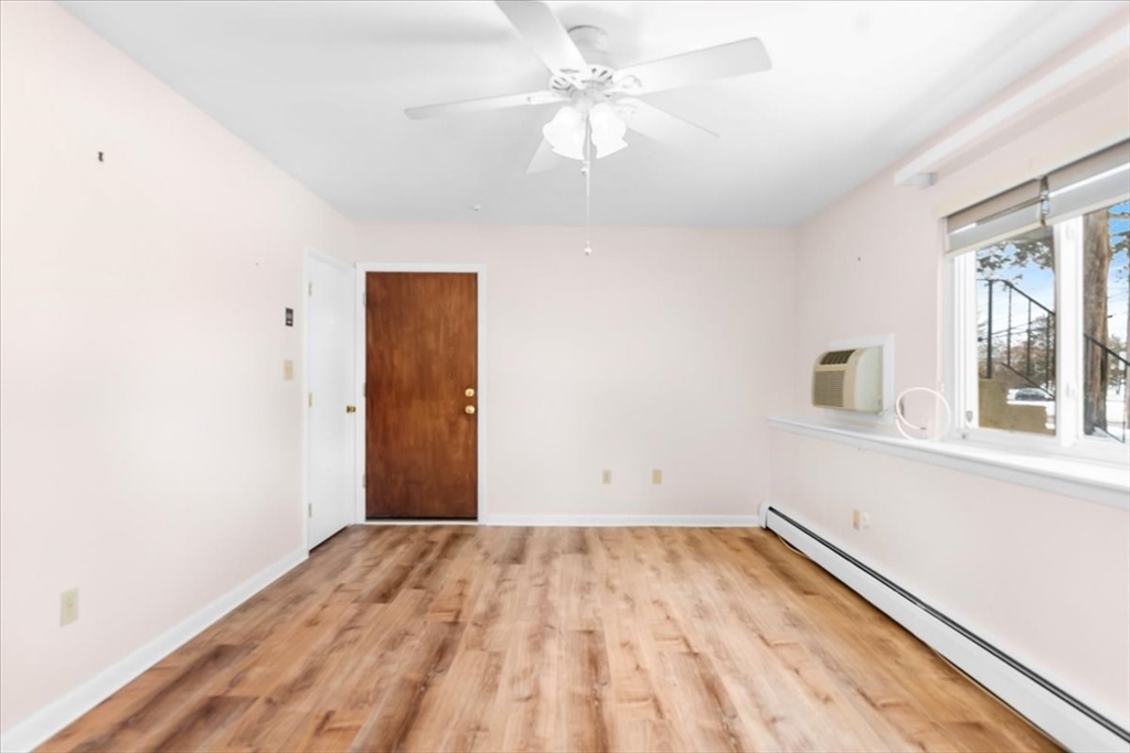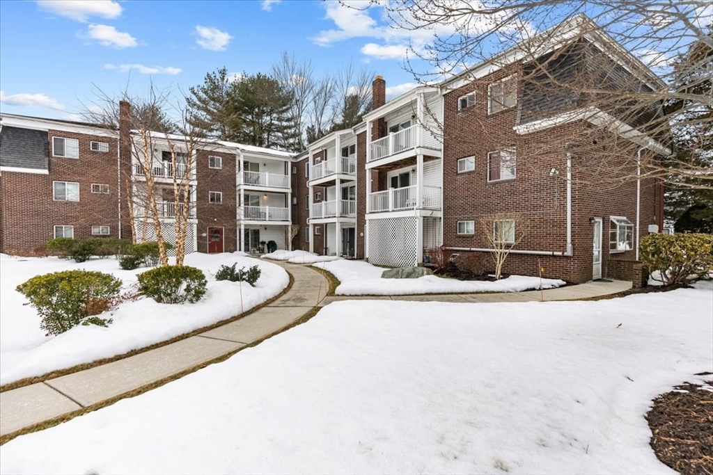 Welcome to Canton Village! This charming first floor 1 bedroom, 1 bath unit offers easy, convenient living in one of Canton's most sought-after communities. Spanning 656 sq ft, this cozy condo features new laminate hardwood floors throughout, a bright eat-in kitchen with white cabinetry, gas range and a sunny back door entry. The spacious bedroom boasts a ceiling fan and generous closet space, while the comfortable living area is bathed in natural light. Enjoy the ease of first floor access in this classic brick building surrounded by lush landscaping. Baseboard heat, wall A/C, and on-site amenities including a swimming pool make this a wonderful opportunity — perfect for first-time buyers or downsizers. Conveniently located near Route 138, Canton Center, commuter rail, shops, dining, and major highways. Deeded parking spot located next to the walkway to the backdoor. Don't miss this opportunity to own in Canton Village!