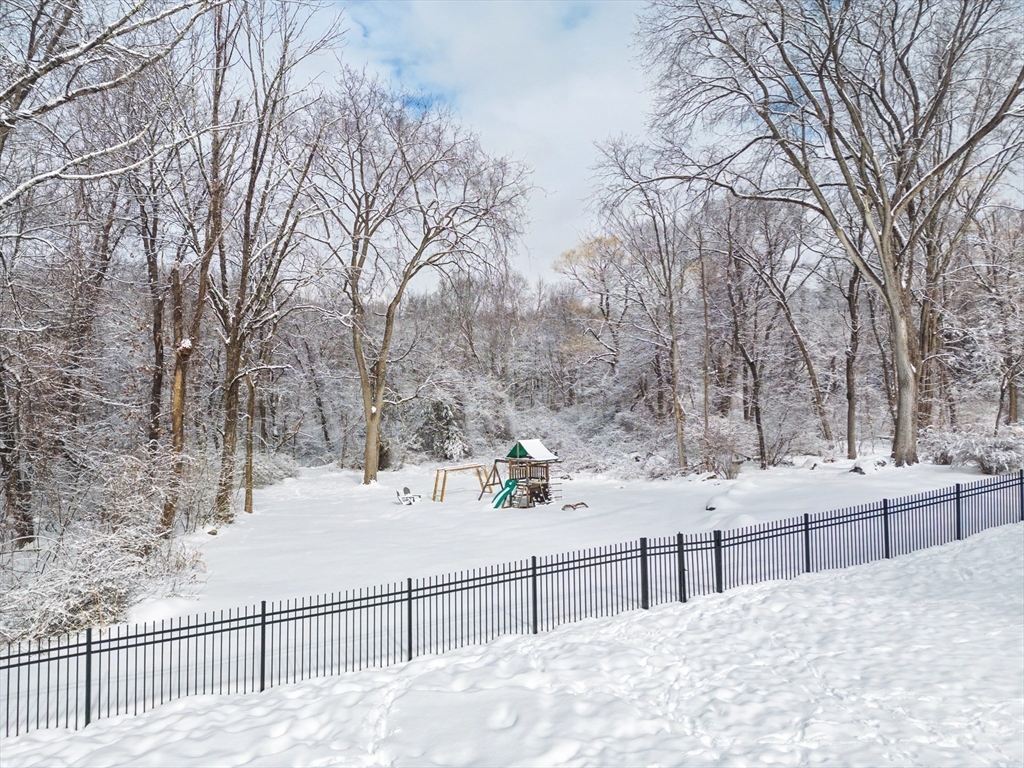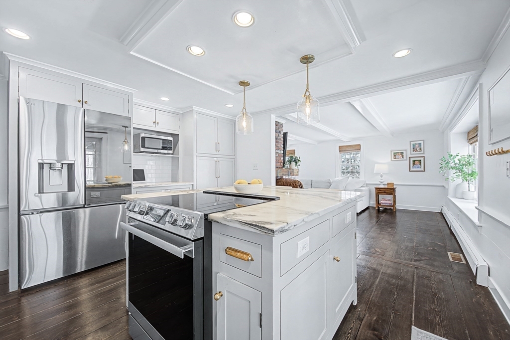 Stunning remodeled 4-bedroom Colonial featuring brand-new vinyl siding and a massive new patio perfect for entertaining. The gorgeous kitchen boasts marble counters, a large island, farmer's under-mount sink, top-of-the-line stainless appliances, and Italian subway tile. Beautiful wide plank pine flooring and fresh paint run throughout, complemented by designer lighting. The primary suite includes a custom dressing room and a spa-like marble and glass shower. The main bath offers a new vanity, marble floors, and custom cabinetry. Enjoy formal living and dining rooms with a fireplace, plus a family room with beamed ceilings. The newly finished basement adds incredible living space, featuring a cozy fireplace and a sleek mini-bar area. Relax on the screened porch with cathedral ceilings overlooking the lush, park-like landscape.