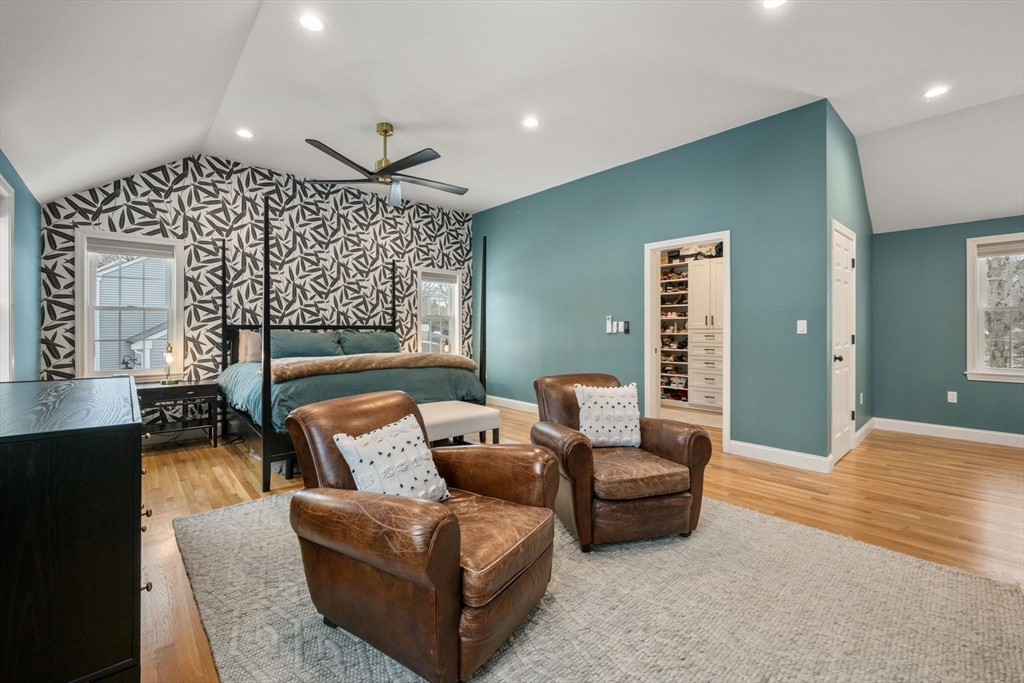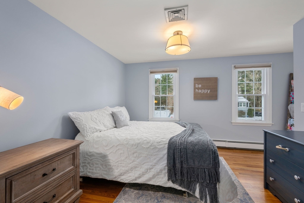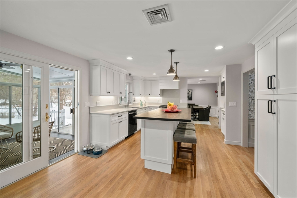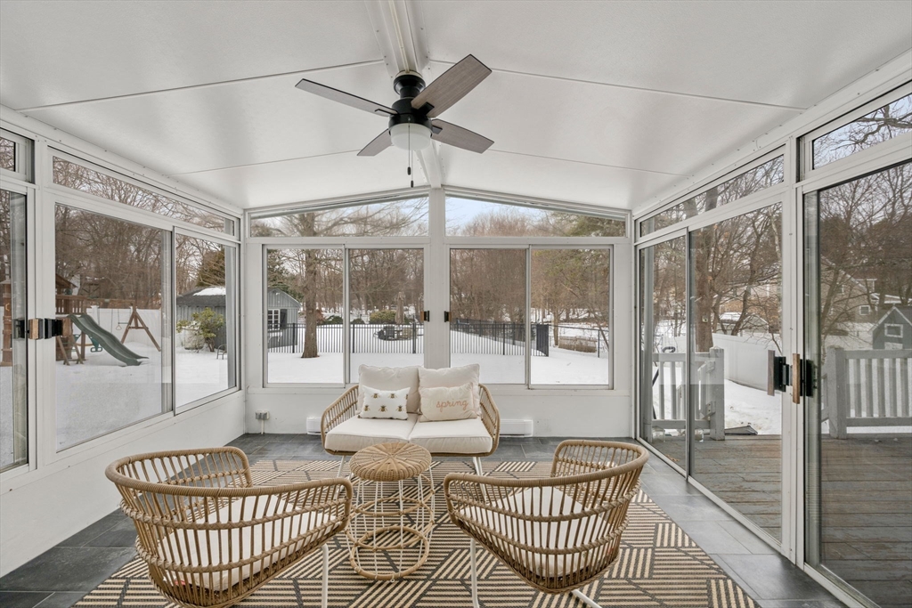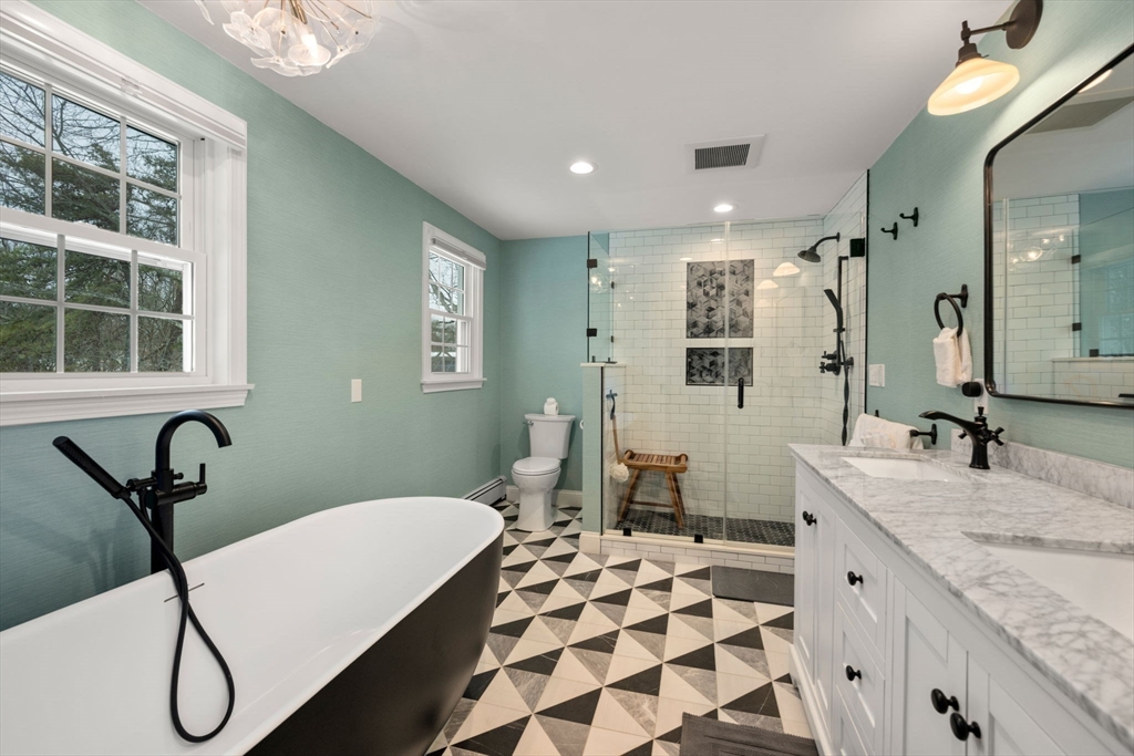 This thoughtfully renovated home is move in ready to enjoy. Contemporary in style with a spacious and bright floor plan. Level backyard offers an inground heated pool and newly fenced yard. The front foyer welcomes you into the fireplace living room. The formal dining room is a perfect entertaining space. Open kitchen, complete with island, pantry, newer appliances and breakfast area offers access to the sun porch and back deck. The fireplace family room is the perfect spot off the kitchen for relaxing with family and friends. First floor also offers a full bath and access to the garage. The second floor is home to a separate office and 4 bedrooms with two renovated bathrooms including the newly added primary suite with beautiful bath and walk in closet. Lower level offers even more space with rec room, gym and office. Many updates have been made over the past few years including paint, ceilings, hardwoods and designer finishes throughout in this popular North Walpole neighbrh