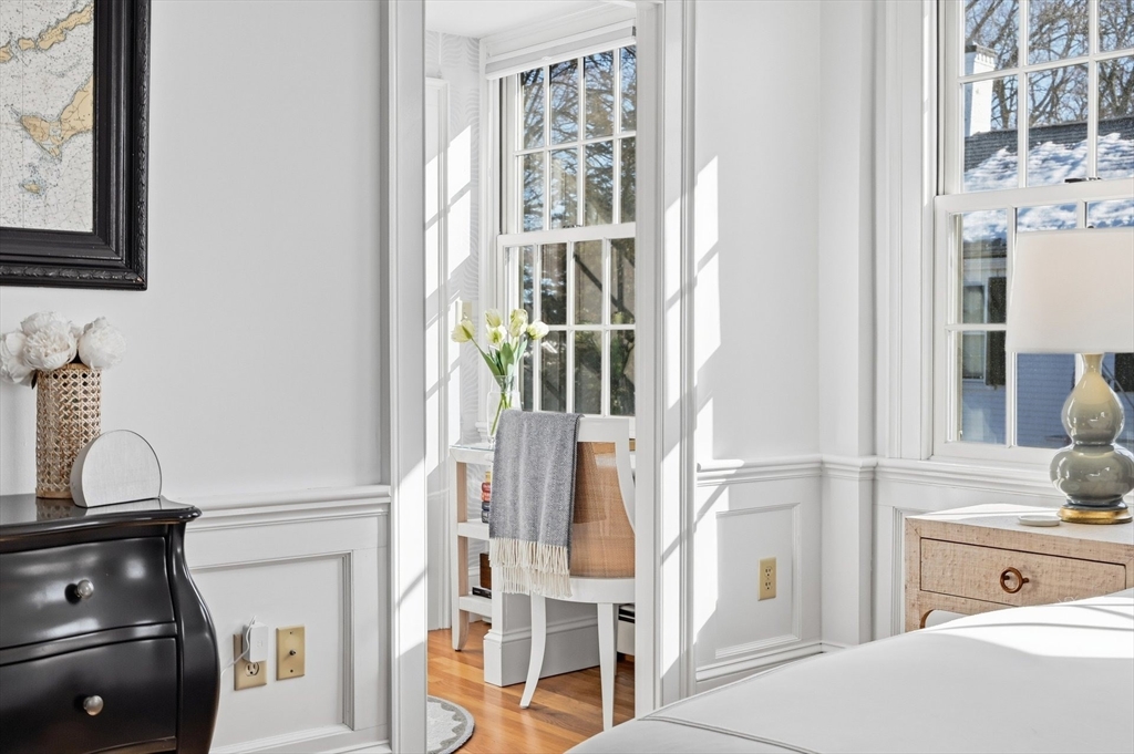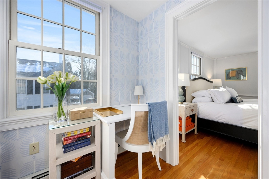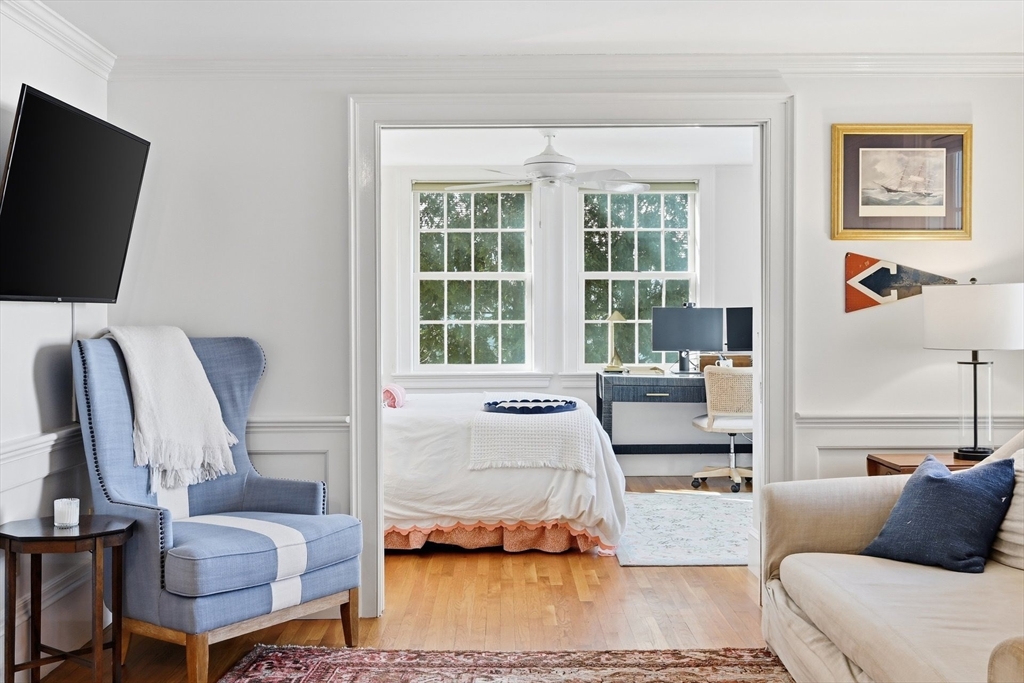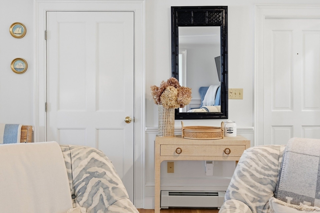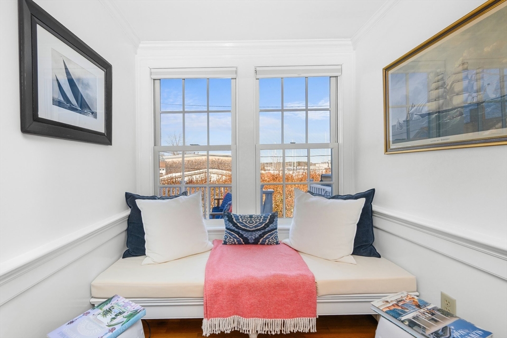 Discover the best of classic New England architecture and coastal luxury at this thoughtfully updated condo in the heart of Marion Village. The entry, distinguished by a charming transom window, opens to a light-filled interior with hardwood floors and crisp wainscoting. The living room is anchored by a fireplace and a built-in window seat capturing views of Sippican Harbor. French doors lead to an elevated outdoor deck overlooking the harbor, ideal for seasonal entertaining. The kitchen features granite countertops, white cabinetry, and stainless-steel appliances, adjacent to a dining area with a built-in cabinet. The primary suite serves as a private sanctuary and includes a fireplace, office nook, and en suite bath with a soaking tub and glass shower. Perfectly positioned within a short walk of the Beverly Yacht Club, the General Store, the Sippican Tennis Club, and Silvershell Beach.