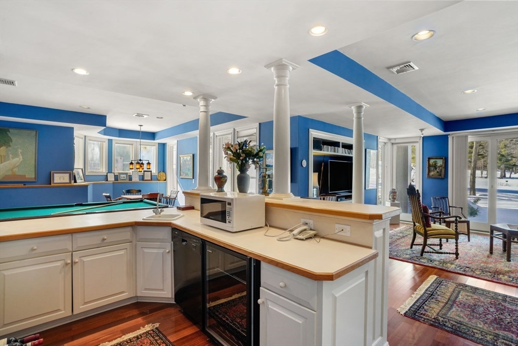 Combining style and sophistication with an easy floorplan, this sunny home has a something for everyone. The livingroom with its dramatic cathedral ceiling, gas fireplace, and walk out deck offers sweeping views of three fairways. A screened porch just off the breakfast nook, with a built-in gas grill. For more formal occasions, a family-sized dining room is also available.The spacious kitchen has a large island, granite counters and a brand new gas range. A First Floor Master Suite includes a spacious bathroom, walk in closet and tranquil views. There is a mudroom w storage and laundry off of the garage.The Second Floor offers two large bedrooms both with views and two bathrooms.The walkout lower level has a family room, a kitchenette with dishwasher and refrigerator, a full bathroom and a large open area for the pool table. This level also has a home office. There is a Kohler generator for peace of mind, HOA for landscaping and snow removal, walk in storage rooms on 2nd and LL.