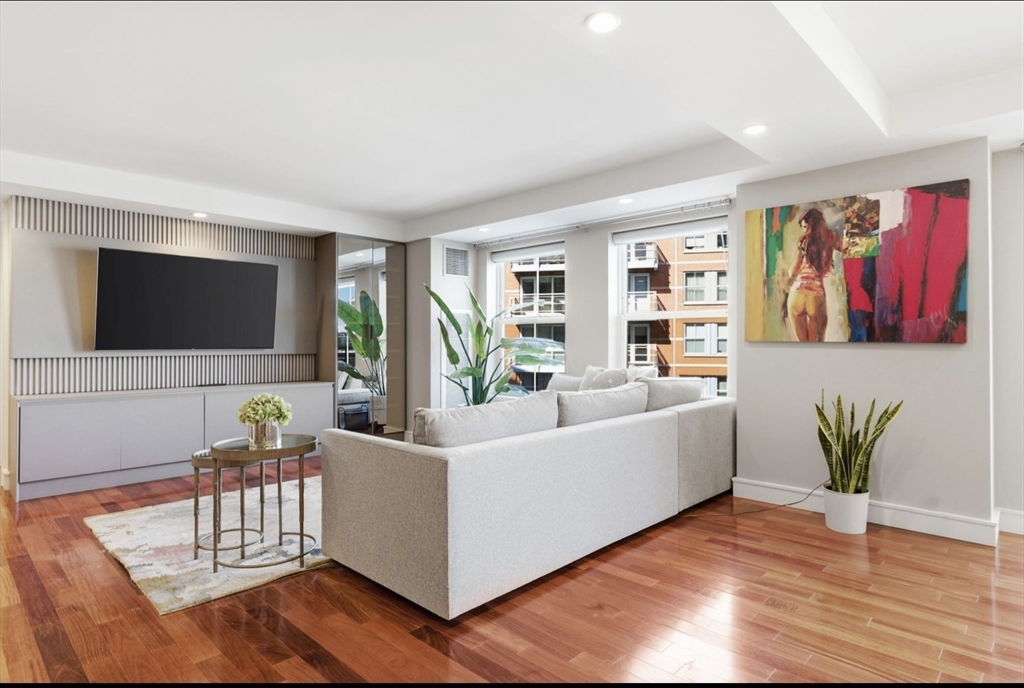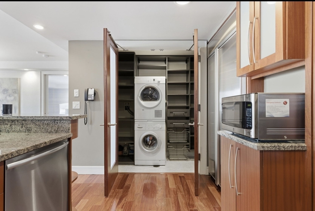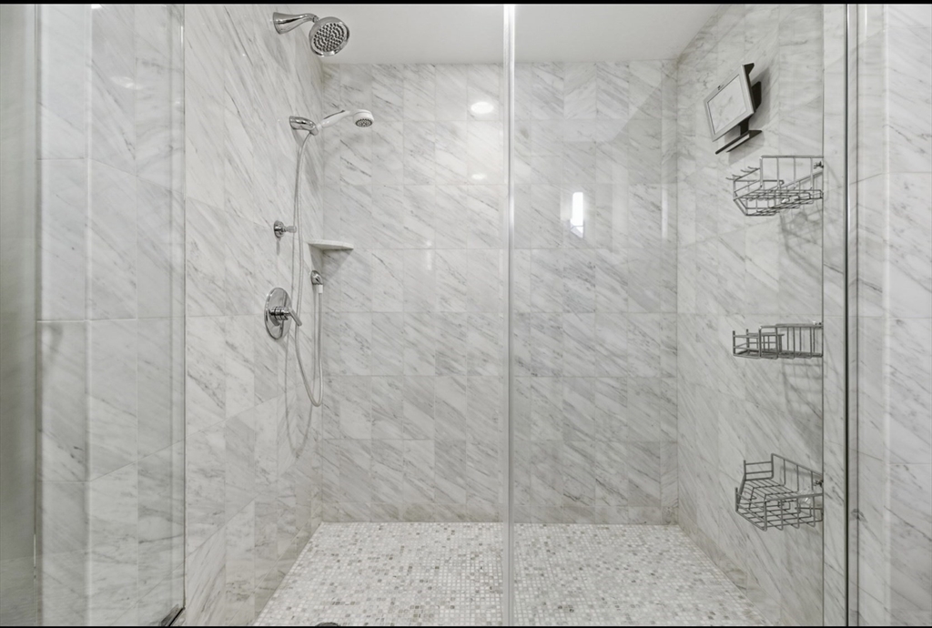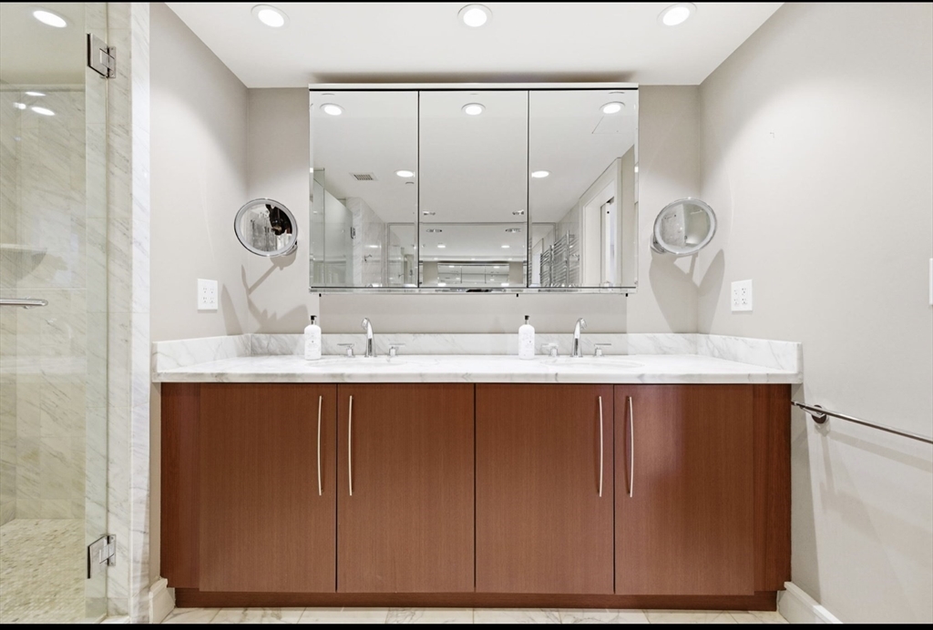 Water Water Water Views from foyer and every room with in this beautiful home. Santos Mahogany floors throughout. Kitchen has gas cooking, thermador appliances, and separate pantry. Open living concept with floor to ceiling glass. Terraces from both living and sumptuous primary bedroom. Custom closets and storage thru out. Calcutta Marble bath has spa like shower and deep whirlpool soaking tub. Secondary bedroom has custom built ins and en suite bath. Powder room . Washer Dryer and deeded storage as well as one garage valet prking space . Hotel Services, residents gym and Exhale Spa . Walk to financial center and North Ends many restaurants. Easy access to all highways.