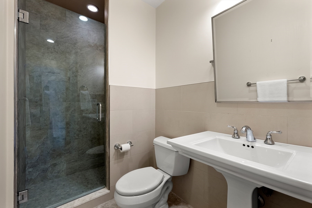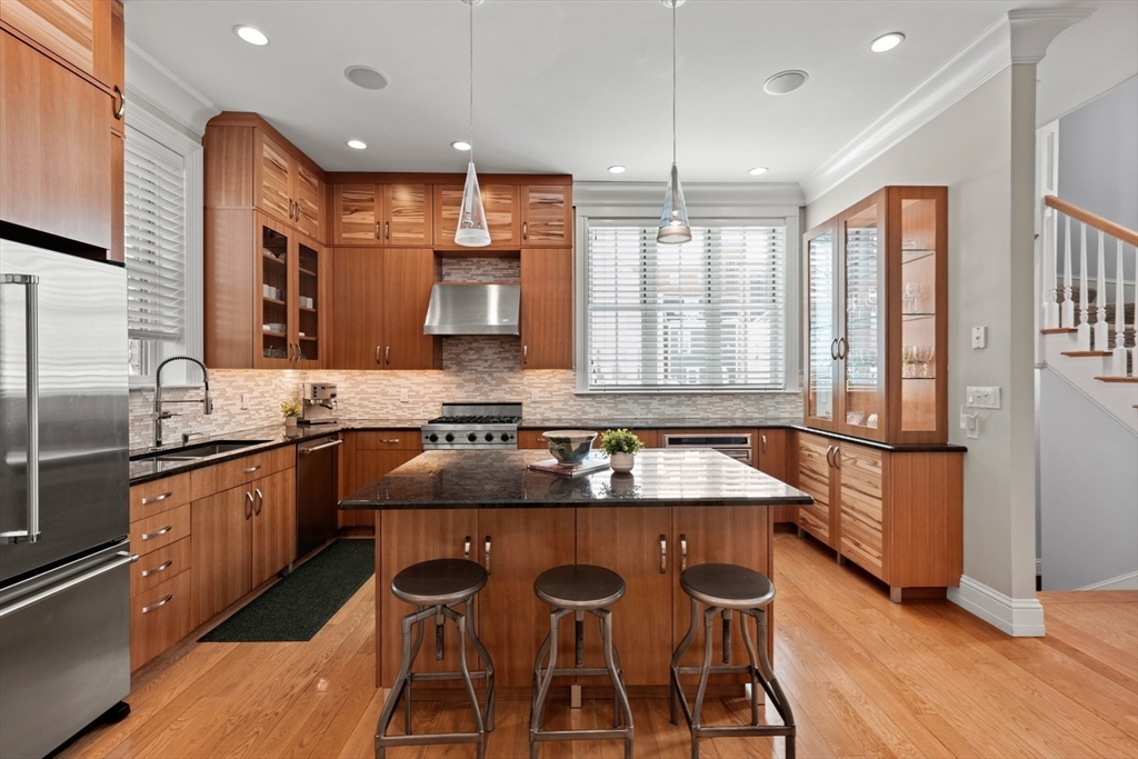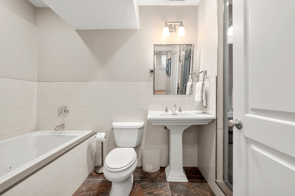 Situated on a coveted corner lot with 3 exposures, the property features a lush private garden with a blue stone patio and 2 adjacent off-street parking spaces. Originally a church built of beautiful sandstone brick, this unique home boasts classic entries, an open staircase, slate roof, high ceilings, and 2 fireplaces. Oversized windows flood an ideal open floor plan with natural light. Enjoy a private deck off the primary suite with views of downtown Boston. Nearby amenities include vibrant nightlife, restaurants and shopping, beaches, parks, 2 MBTA train stations, and bus routes for travel to city destinations. This exceptional and well maintained home blends history, design, tranquility and proximity to enjoyable activities and residential conveniences.