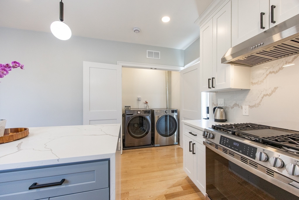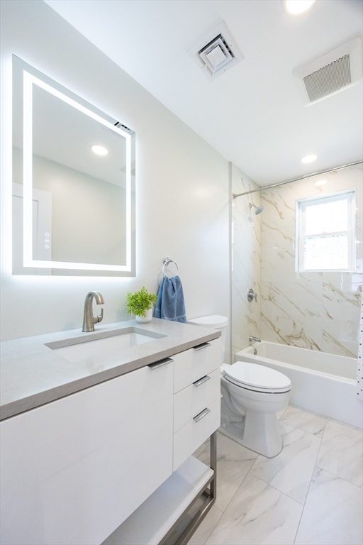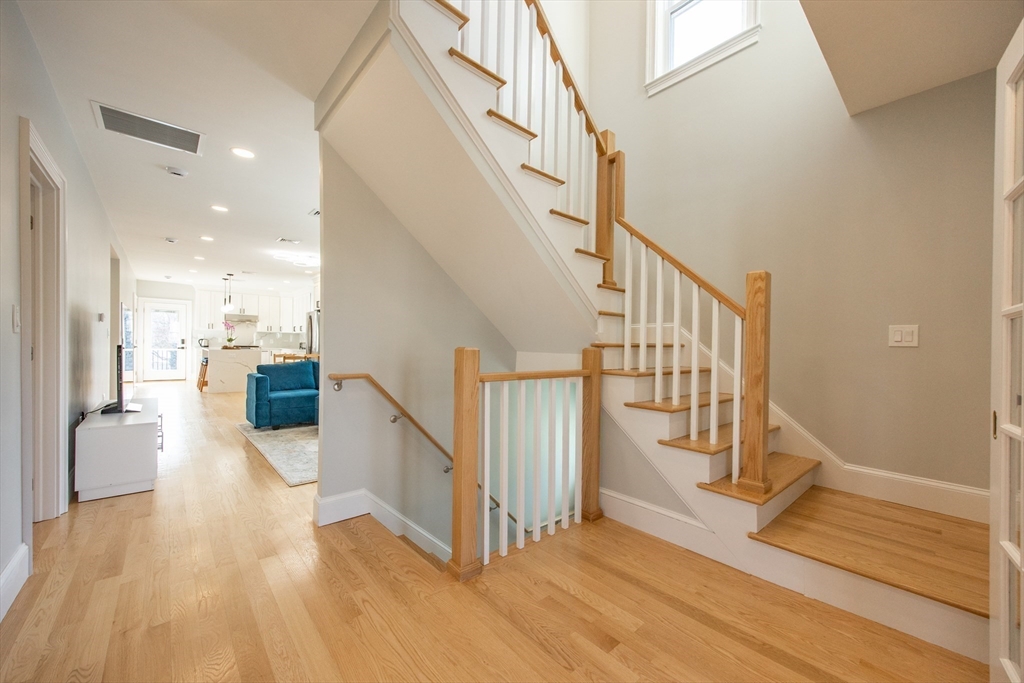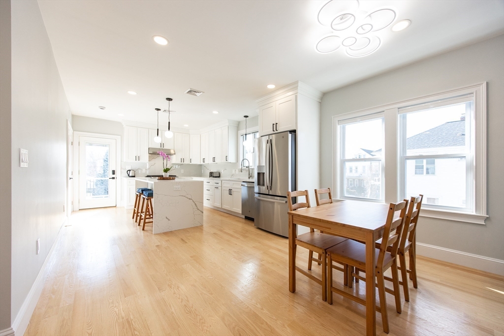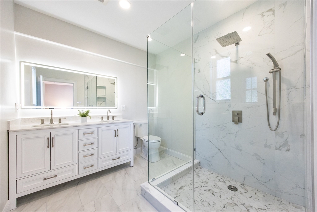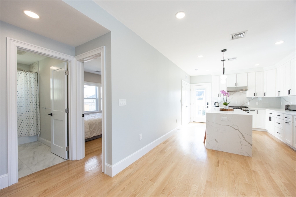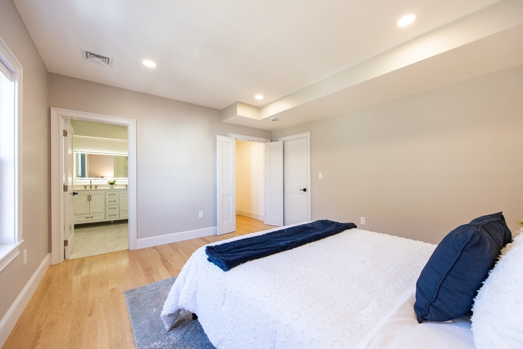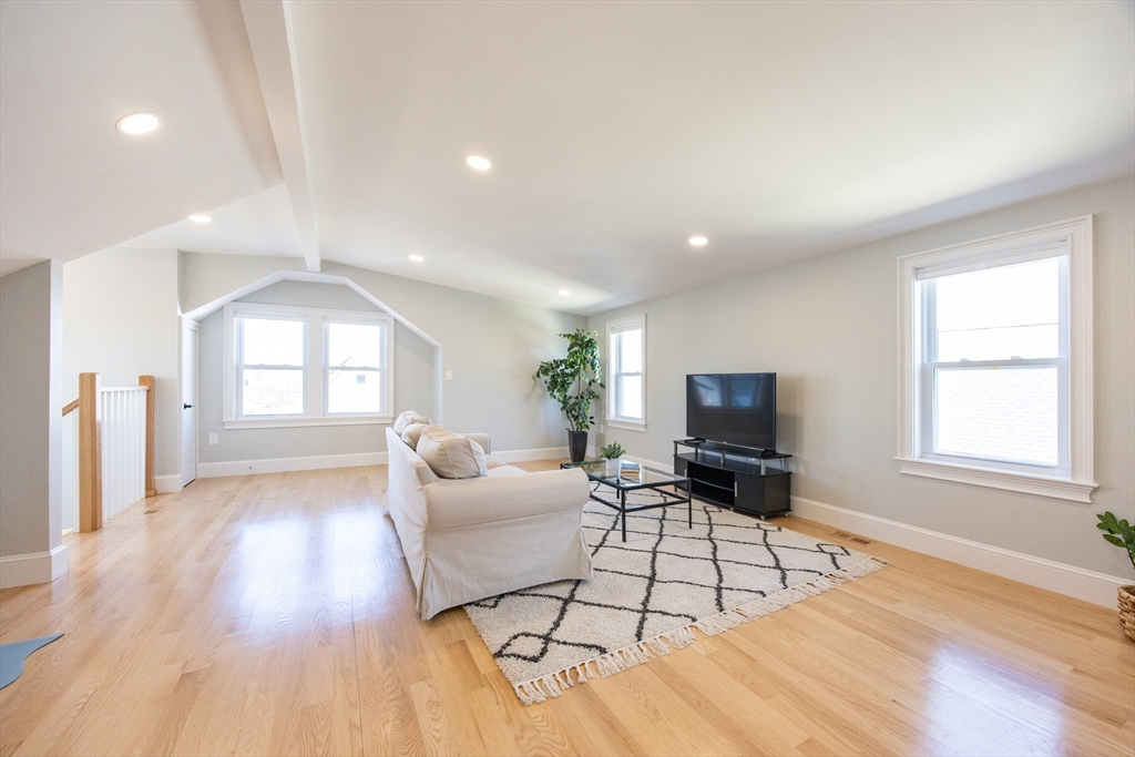 This beautifully renovated, move-in ready 3 bed/3 bath condo offers two spacious levels of living and two off-street parking spots in a prime South Medford location near Tufts. Bright open-concept living/dining area w/ fireplace and ample natural light flows into impressive, modern kitchen with stainless steel appliances, quartz countertops, custom cabinetry, and a large waterfall island w/ built-in microwave. Direct access to an expansive private deck, laundry, & full bathroom. Main level also includes second primary bedroom w/ en suite bath, dual vanity & glass shower, third bedroom w/ huge walk-in closet, and a sunroom perfect for home office. Upper level offers primary suite w/ full bath, huge walk-in closet, and a spacious bonus/family room. Private backyard (left side) and large storage room in basement, new HVAC w/ central heat & A/C, new flooring, and new tankless hot water. Located ~0.6 miles to Tufts/Medford Green Line, close to Davis Square, Assembly Row, & minutes to I-93.