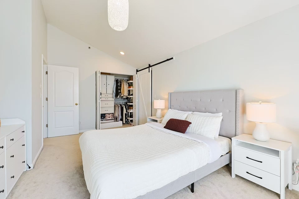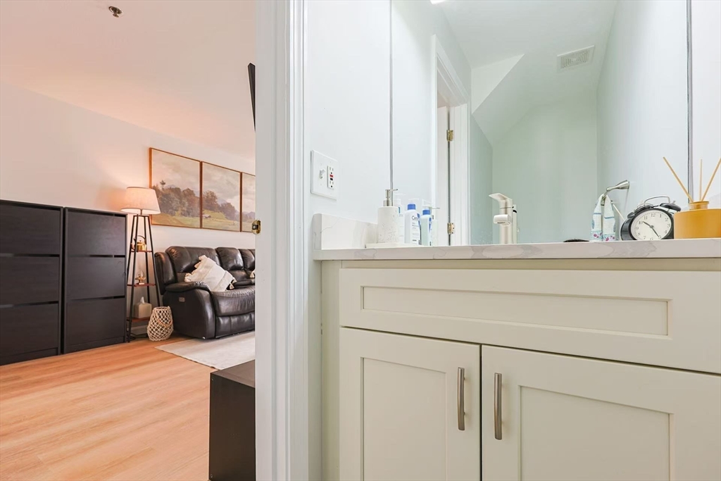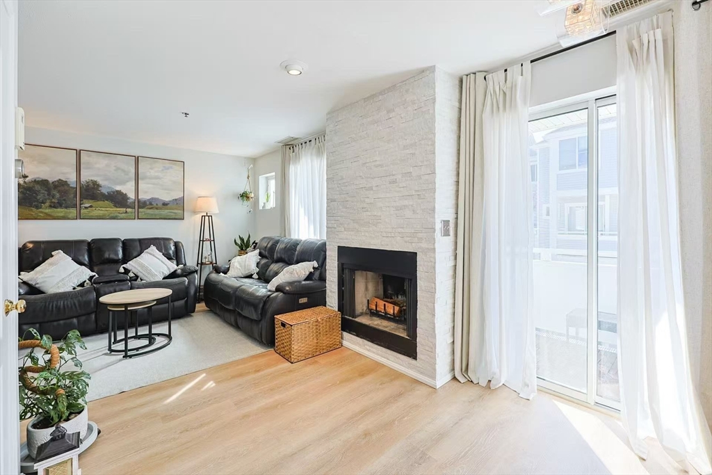 Cherished home now available due to seller’s relocation. Recently renovated true two-level condo in a professionally managed community, tucked within the quiet, scenic setting of The Falls. Updated flooring spans the first level, plus a fully gut-renovated powder room. Central A/C and heat, in-unit laundry, herringbone marble backsplash, white shaker cabinets with soft-close hinges, and a contemporary vanity with quartz top complete the kitchen and bath updates.Bright open living and dining area features custom sun shades, a white stacked-stone fireplace, and a jewel-box light fixture. Balcony oversee the courtyard. Both bedrooms are generously sized on the second level and offer custom closet systems. The clubhouse and pool overlook beautifully landscaped grounds. Minutes to shopping including H-Mart, Walmart, Walgreens, and dining. Highways, MBTA, waterfront, and commuter boat all within 2 miles. Deeded parking space #11 plus ample guest parking. Ideal for owner-occupant or investors