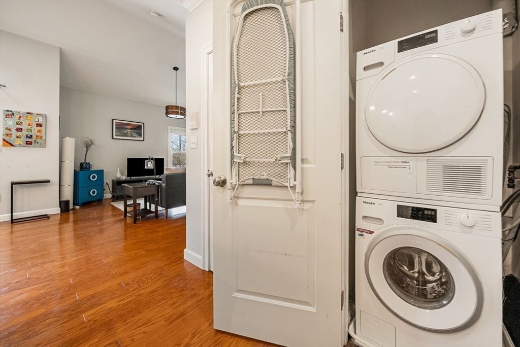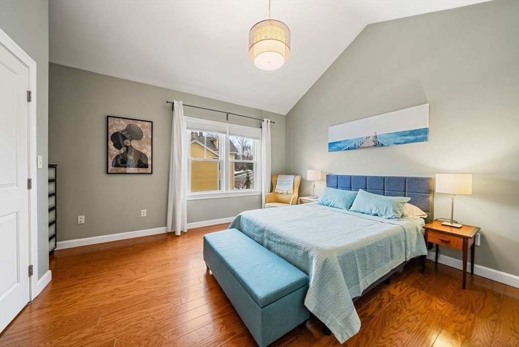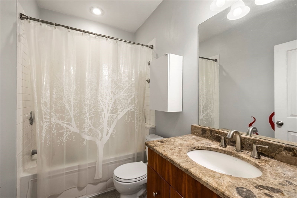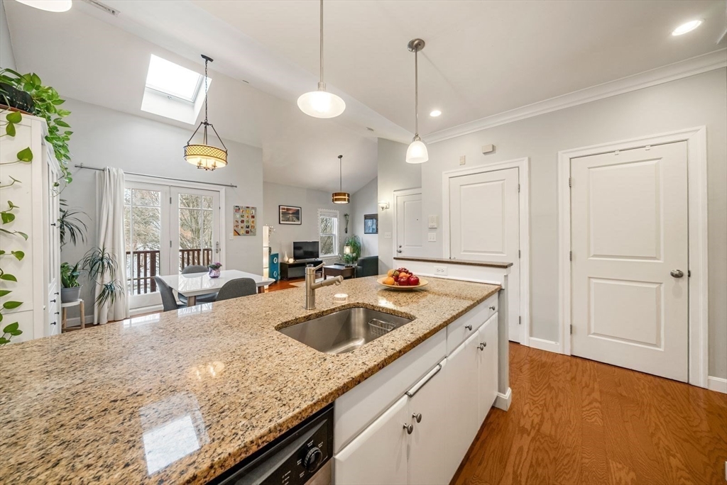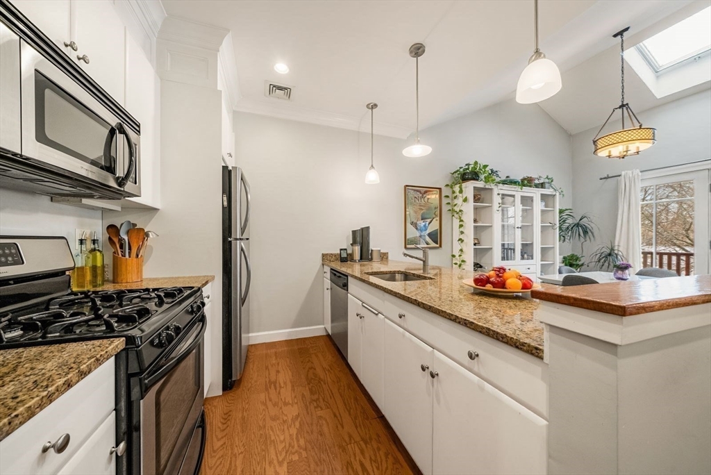 High vaulted ceilings and abundant sunlight define this top-floor condo. The open-concept living, dining, kitchen layout creates an exceptional sense of space and character making this one-bedroom, one-bath home seem far larger than its 805 sq ft. A granite breakfast bar separates the kitchen and dining area, creating an ideal spot for casual meals or extra workspace. The dining area features a skylight and French doors to the private balcony, perfect for relaxing. Beyond, the living room offers a comfortable and flexible setting for everyday living and entertaining. Additional features: in-unit deluxe Miele washer and dryer; an attic and private basement storage; one off-street parking. The condo fee covers heat and hot water. Ideally located one block from Green Street T Stop and the SW Corridor Bike Path, with easy access to Bus 39 to Longwood Medical Area or Back Bay. Enjoy Jamaica Plain's nearby shops, restaurants, bakeries, pubs, and parks, Jamaica Pond and the Arnold Arboretum.