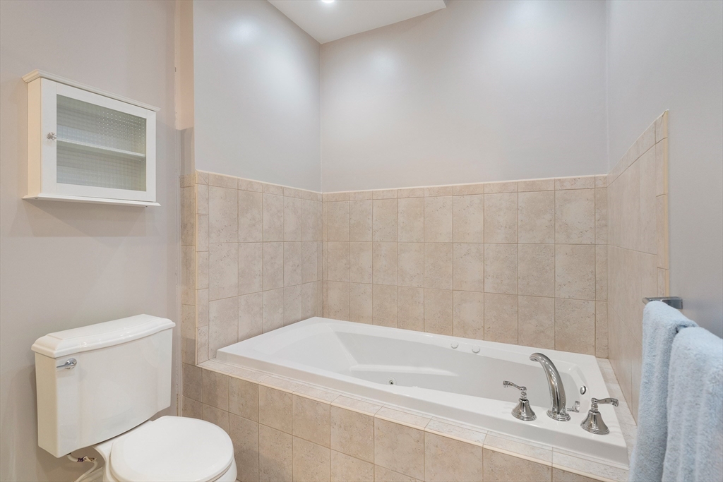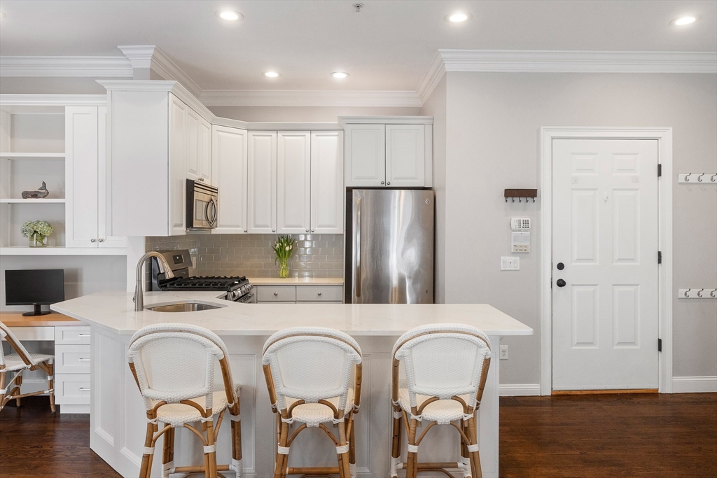 Rarely available 3-bedroom, 2-bath residence featuring an expansive private terrace and one deeded parking space — a true standout opportunity for Charlestown buyers. 1,225 SF of well-designed living space, the spacious living room features 9’8” ceilings, a gas fireplace with custom built-ins, and direct access to a large private terrace ideal for entertaining and hosting gatherings. The updated kitchen includes white cabinetry, quartz countertops, stainless steel appliances, separate beverage station with additional wine fridge, custom banquet seating, and a built-in home office station with storage. The primary suite offers a large custom walk in closet and en-suite bath with Jacuzzi tub and separate glass enclosed shower. Two additional bedrooms feature double-wide closets with plantation shutters. Additional highlights include beautiful hardwood floors, recessed lighting, crown moldings, in-unit W/D, Central AC and Heat plus an additional storage unit in the lower level.