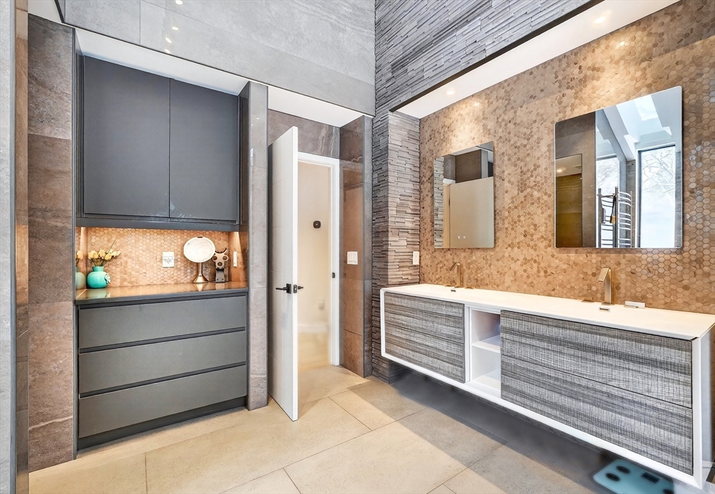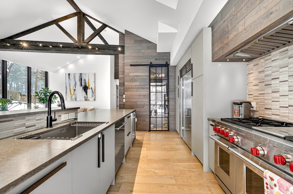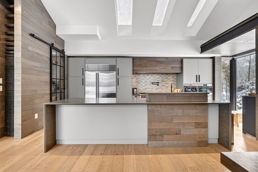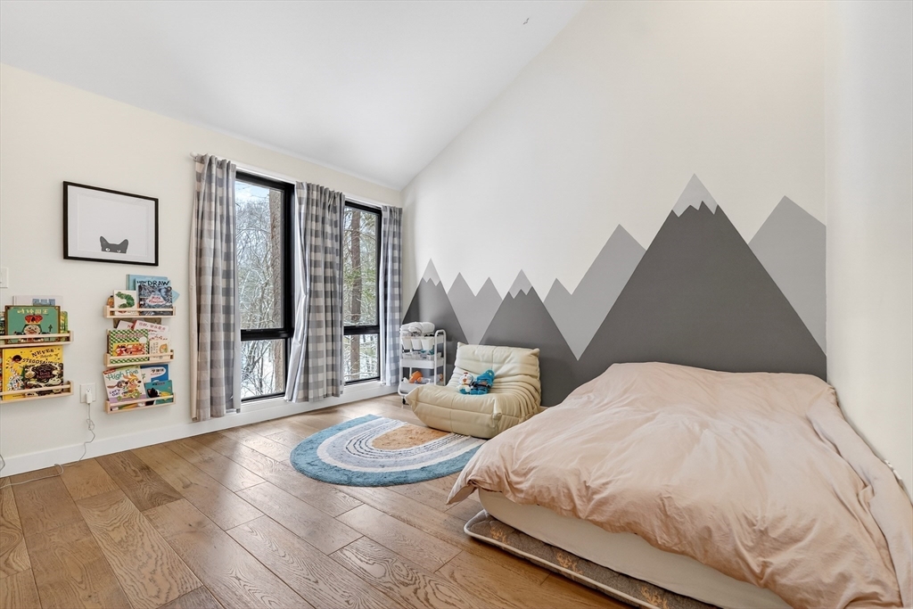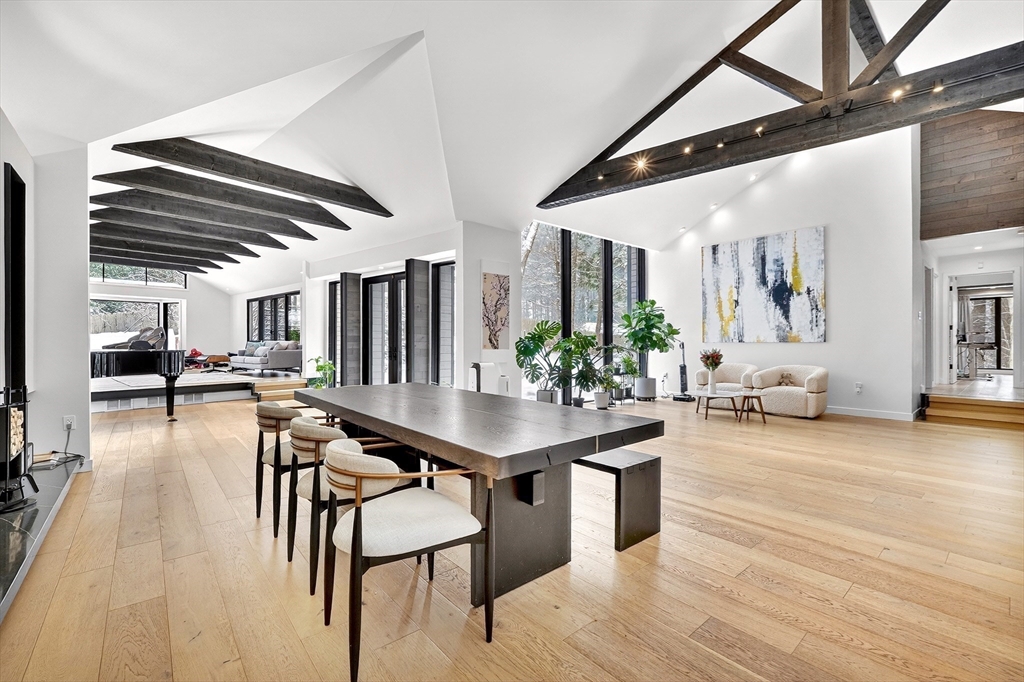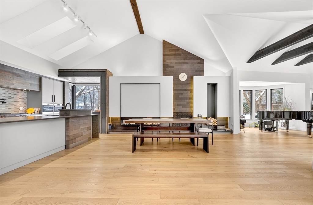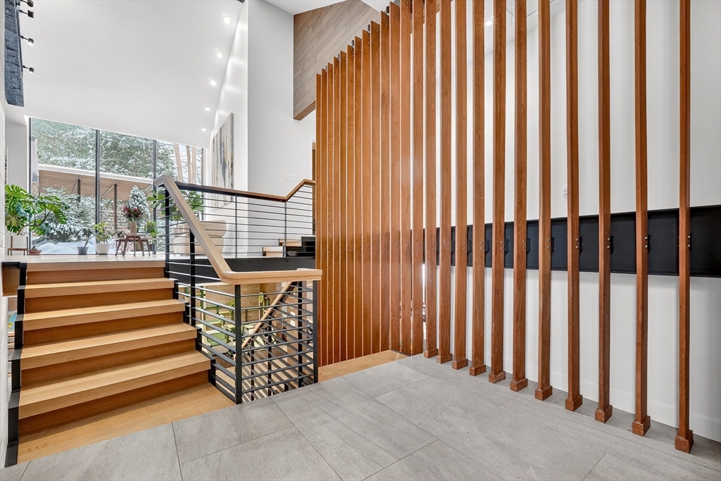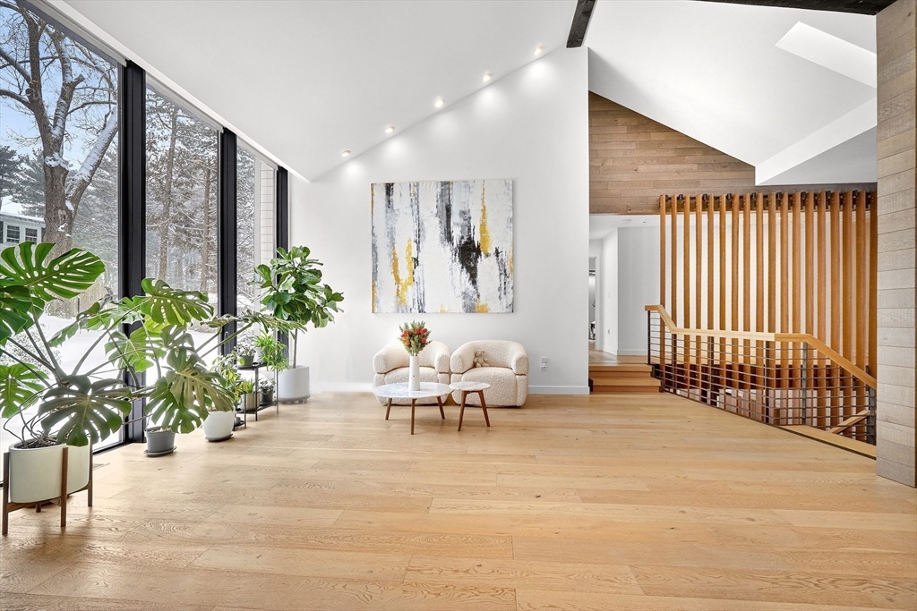 A striking modern architectural residence blending clean lines, abundant natural light, and thoughtful design for sophisticated yet comfortable living, with a quiet and peaceful atmosphere inside the home and private yard. The main level features an open-concept layout connecting the living room, dining area, and chef’s kitchen with high-end appliances and an oversized island, plus a fireplace-centered family room and a dramatic interior courtyard that fills the home with natural light. All four bedrooms are on this level, including a primary suite with private bath, one en-suite bedroom, and two bedrooms sharing a Jack & Jill bath, all with radiant heated floors. The walk-out lower level offers radiant heat, flexible recreation space, backyard access, and a mudroom connected to the garage. A secluded yard provides an ideal setting for entertaining guests. Fully owned solar panels on metal roof. Conveniently located near Weston High School with easy access to Wellesley amenities.