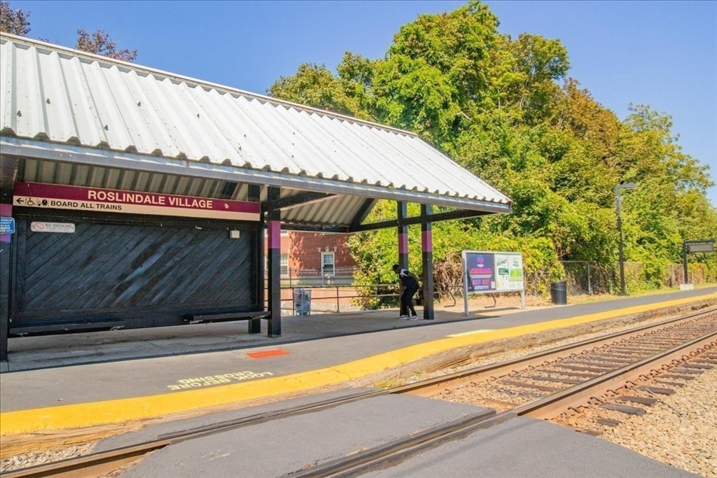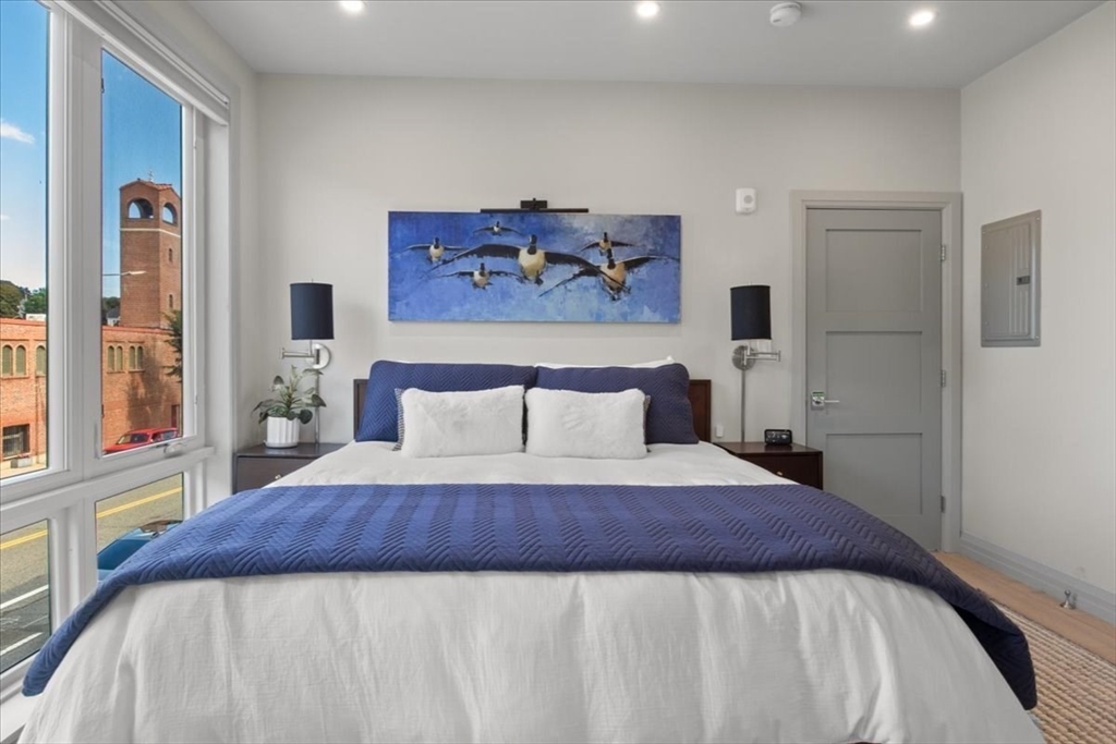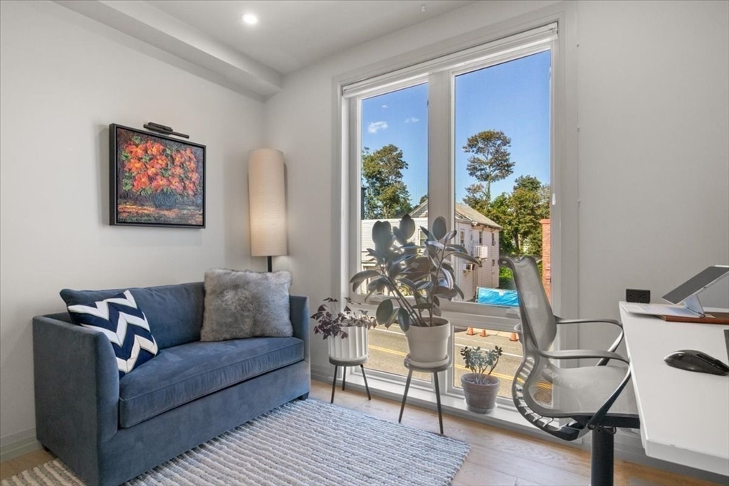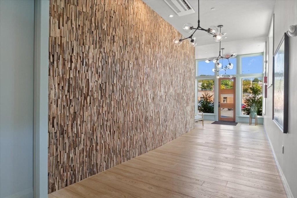 Luxury new construction condo in the heart of Roslindale! This boutique residence blends style and function with its brick façade, metal accents, and warm, contemporary interiors. Step inside the grand foyer with soaring ceilings, teak accent wall, and designer lighting. Filled with natural light from floor to ceiling windows adorned with high-end Stoneside blinds. Featuring wide-plank Sawyer Mason flooring, Cabinet Studio kitchen with vertical grain cabinetry, integrated coffee system, Calacatta Ultra Quartz waterfall counters, and Fisher & Paykel appliances. The primary suite includes a custom walk-in closet and spa-like bath with radiant heated floors, glass shower, and floating vanity. Private covered balcony. Extras include garage parking, storage, and bike room. Beloved farmer's market with fresh produce, unique gifts, music and community. Train stop in vibrant Roslindale Village just outside your door—home to trendy restaurants, local shops, and cozy cafés. Welcome home!