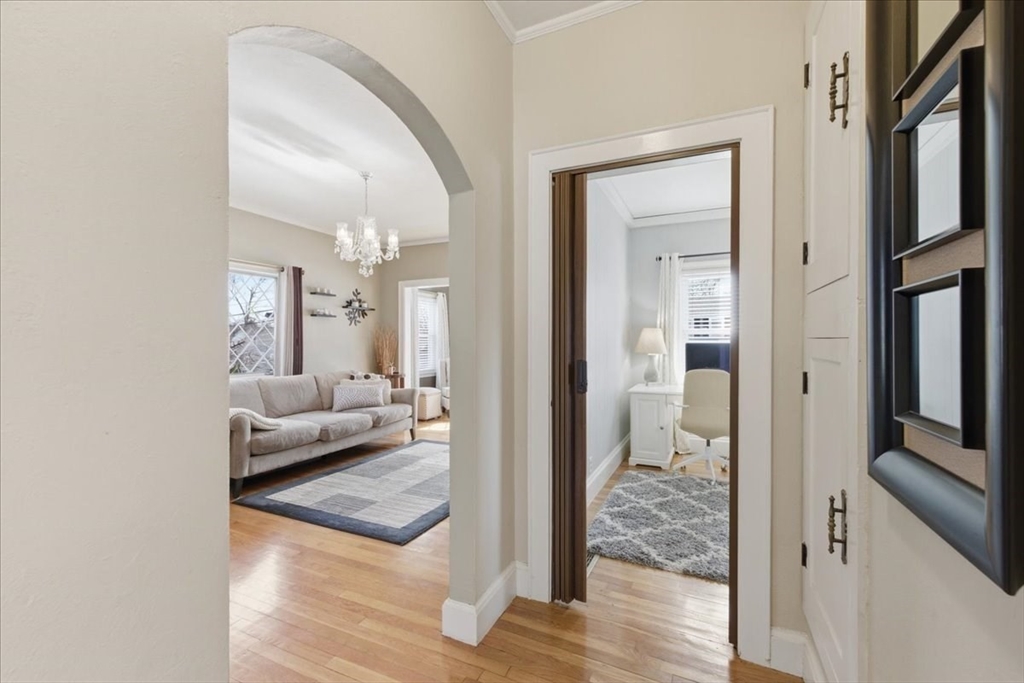 Opportunity knocks! This unique, 1940's Cape style home blends classic charm with thoughtful updates. A gracious foyer with bay-window opens into the sun-splashed living-room with distinguished tall ceilings and beautiful hardwood flooring. A tastefully renovated kitchen boasts stainless steel appliances, granite countertops, and a picture window with bar-top into the dining area, creating an open, connected feel. Step through the slider out to a newer composite deck with steps down to a patio and a private backyard oasis, beautifully landscaped with mature plantings and a shed. A modern full bathroom and 1st floor bedroom complete the 1st floor. An arched doorway leads to the 2nd level with 2 sizable bedrooms. The garage under steps into a clean basement with newer vinyl flooring, den or office/tv space with laundry and cedar closet. Commuters delight! Walk to the train and easy access to major highways. Nearby restaurants, shopping at Costco, Legacy & University Station!