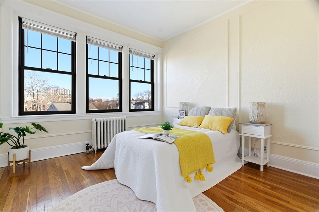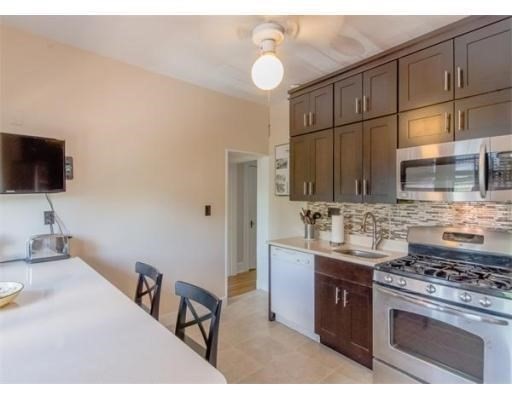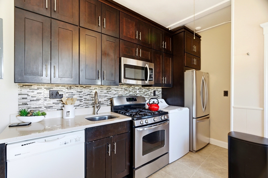 Bright front-to-back light fills this beautifully renovated 2-bedroom condo in a charming courtyard setting. The updated kitchen features chocolate-oak cabinetry, quartz counters with backsplash, stainless steel appliances, and a seamlessly integrated in-unit washer/dryer. A private rear balcony off the kitchen is perfect for al fresco dining. The spacious primary bedroom offers double closets and room for a home office, steps from a remodeled full bath. The well-proportioned second bedroom includes a built-in bookcase. Andersen double-pane windows and refinished hardwood floors enhance the living room and bedrooms. Strong association with high owner occupancy and solid reserves. Extra basement storage and rental parking available next door. Blocks to Brookline Village and Coolidge Corner, Green Line C/D, and an easy commute to Longwood Medical Area. Long-term parking available for rent downstairs. A must see!
