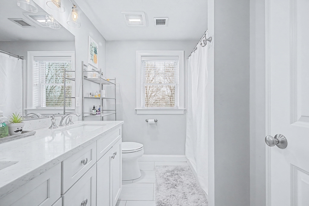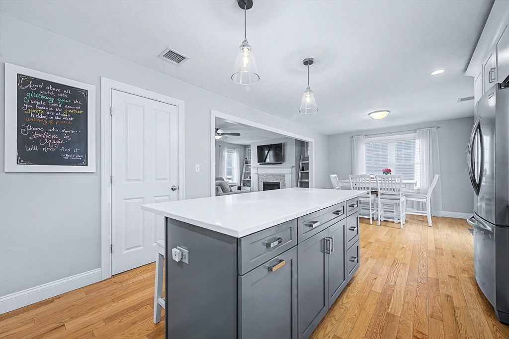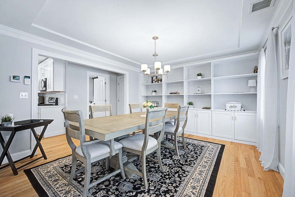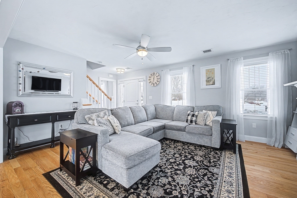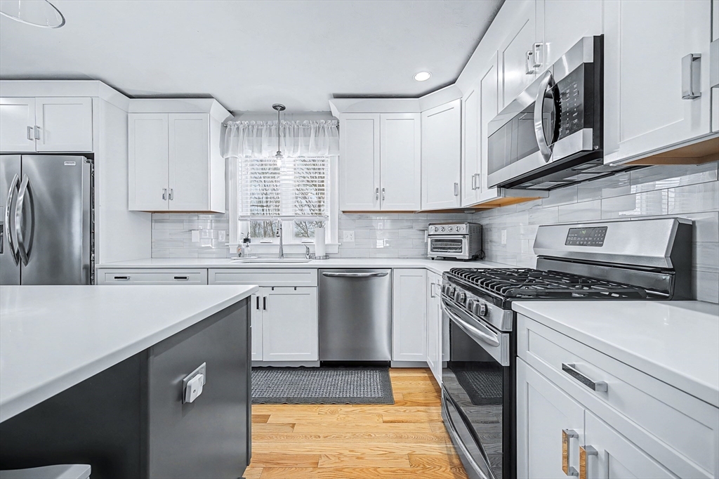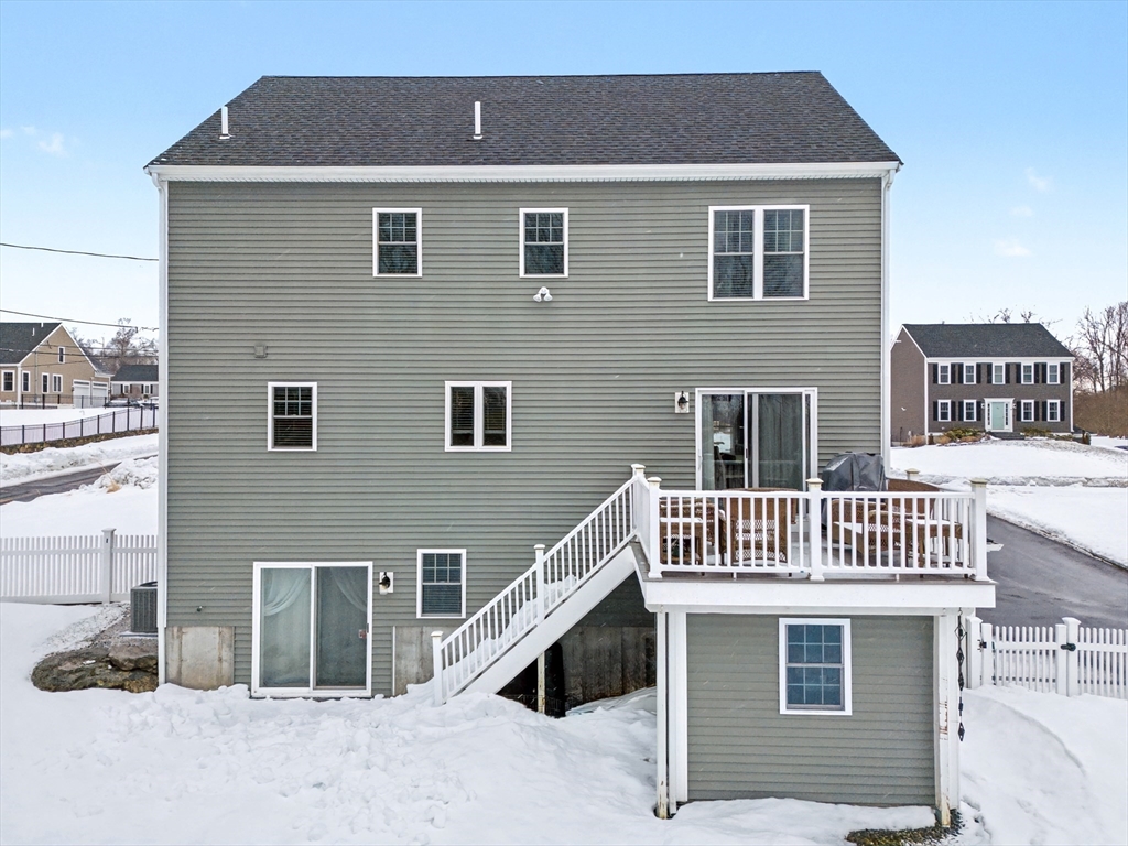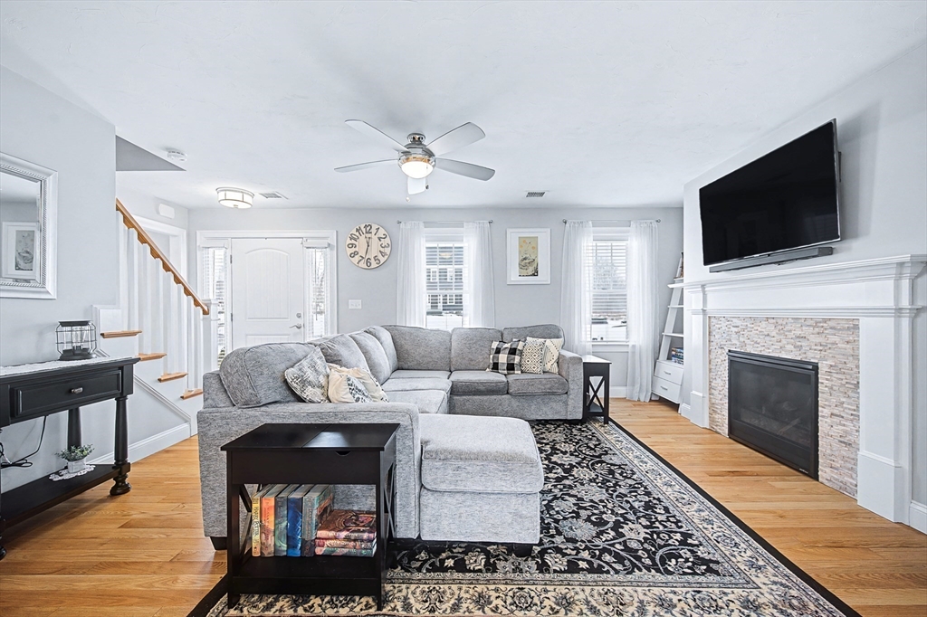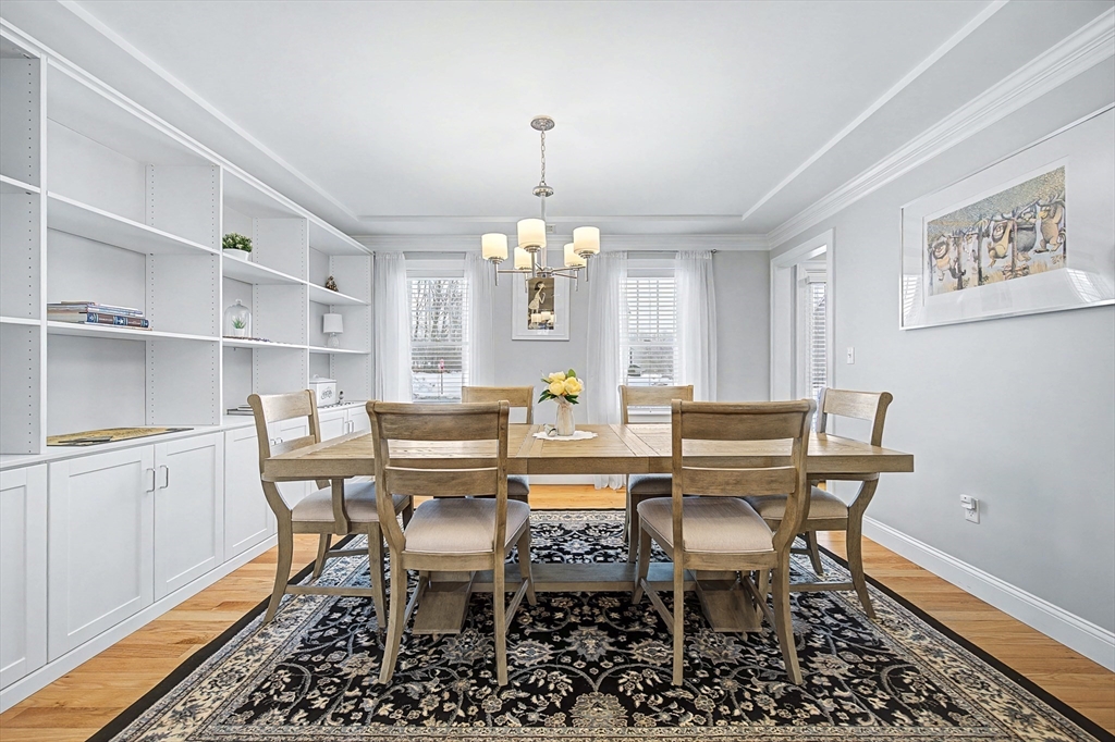 Beautiful Colonial in highly desirable Touisset Woods, a premier seaside subdivision. This well-designed home features a designer kitchen with upgraded cabinetry, pantry with rollouts, oversized island, stainless steel appliances, quartz countertops, tiled backsplash, and recessed lighting. Hardwood floors throughout the main level, stairs, and second-floor hallway. The open layout offers an eat-in dining area, formal dining room with crown molding and tray ceiling, and a spacious living room with natural gas fireplace. Upstairs includes two generous bedrooms and a primary suite with two walk-in closets and a private bath with granite countertops and double vanity. Many closets feature custom California Closet systems for exceptional organization. Custom mudroom with built-in bench and large closet. The lower level offers additional finished space. Professionally landscaped yard with irrigation, fully fenced vinyl backyard, and closed storage/shed