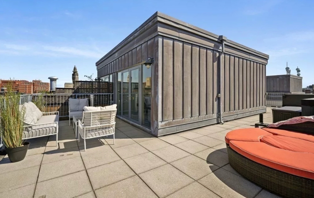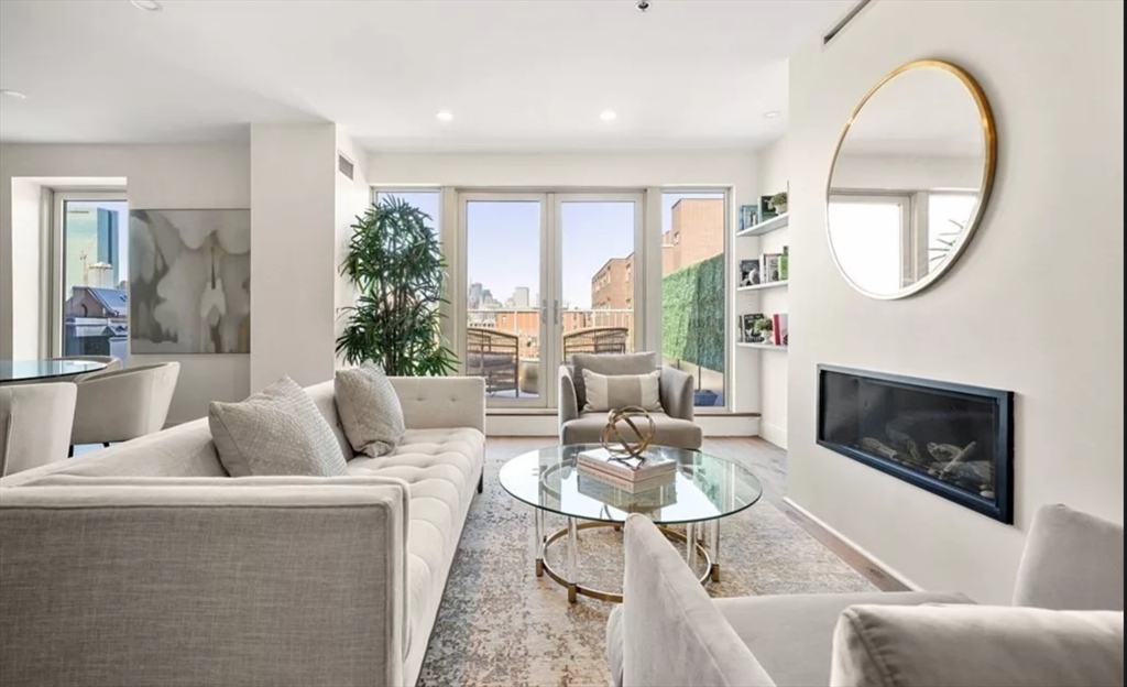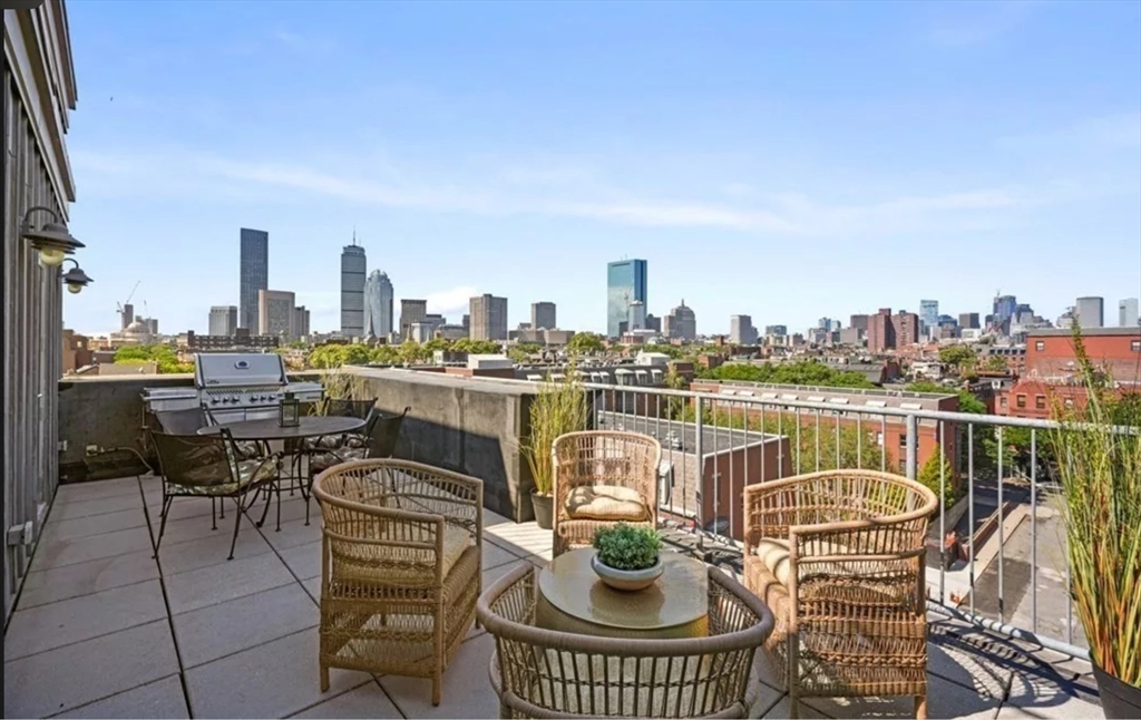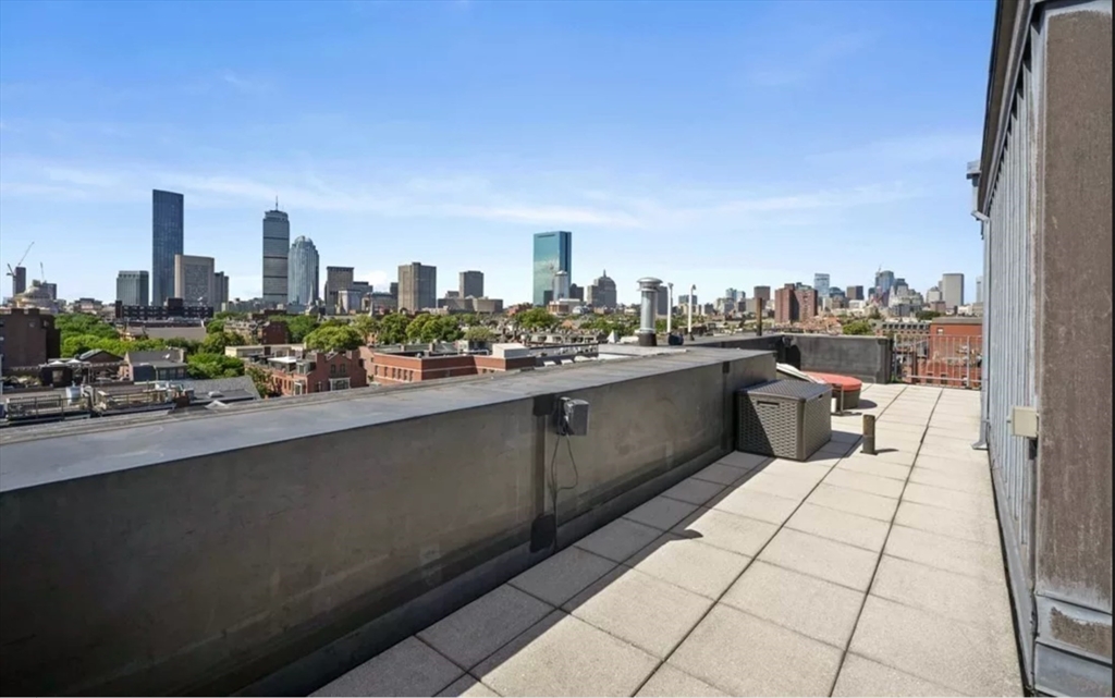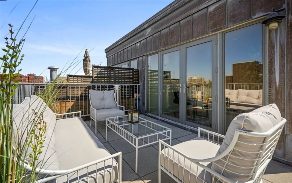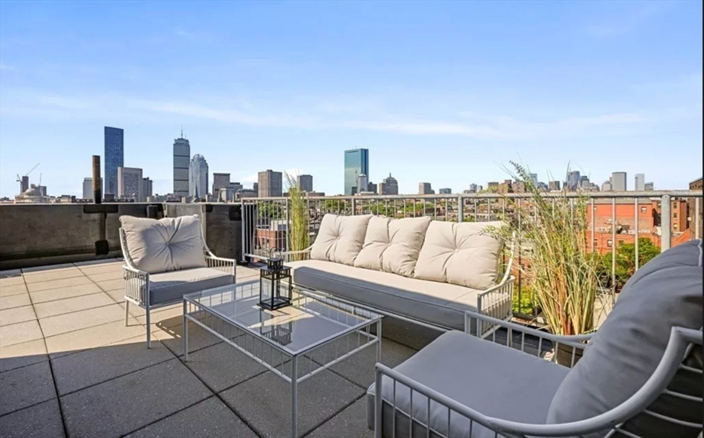 This immaculate 1,541 SF penthouse comes with two stunning walk-out roof decks: one with a gas-grill hookup; the other a sprawling expanse with sweeping skyline and sunset views. Designed by Divine Design Center, the renovated chef's kitchen is clad with premium finishes and fixtures including soapstone countertops, Leicht cabinets, and professional-grade appliances. Two bedrooms, two full baths, a dry bar with a wine fridge, and generous living space deliver the perfect setting for relaxing and entertaining. An office/den can function as a guest room. Special highlights include a gas fireplace, in unit laundry, grills on deck, tons of storage space, and the convenience of TWO garage parking space and a individual HUGE locked up storage room. A stone’s throw from sought-after parks, specialty shops, and restaurants, this is the ideal way to enjoy a lifestyle of luxury in the South End. Photos are previous stage.