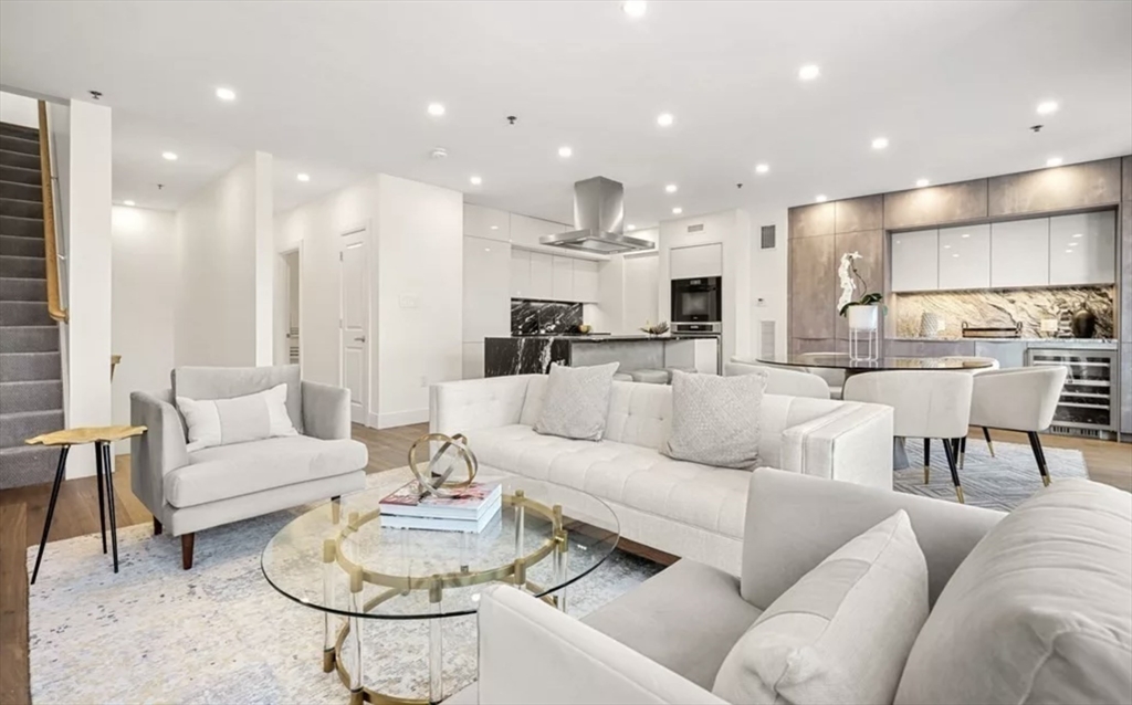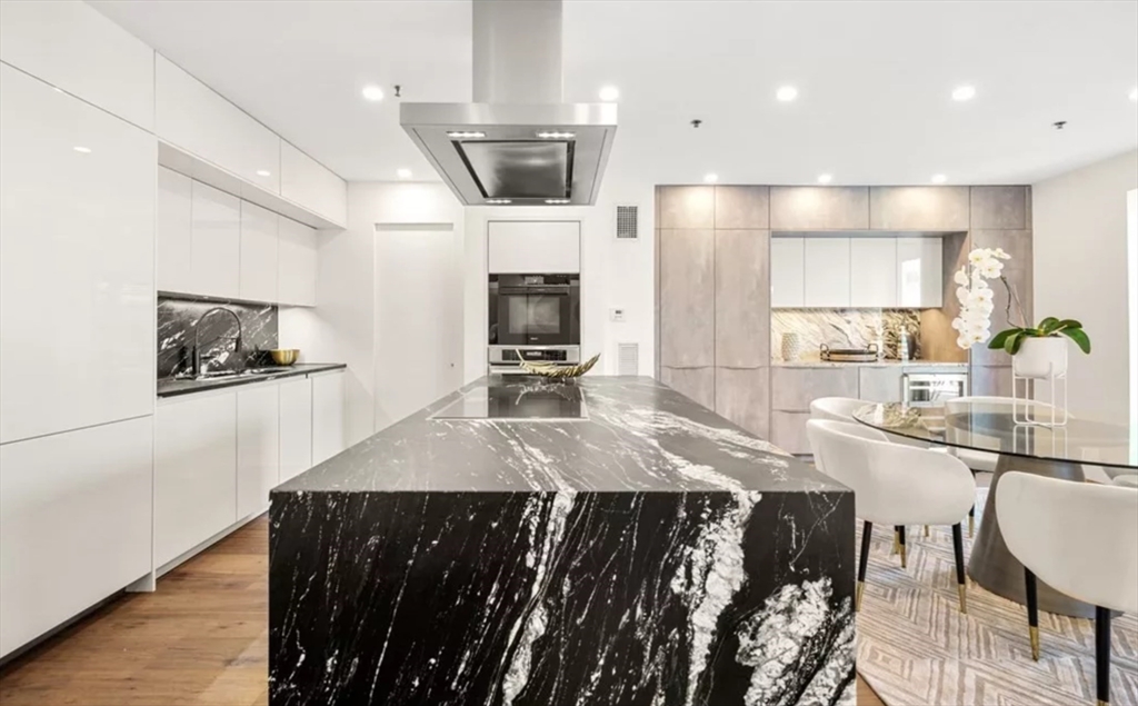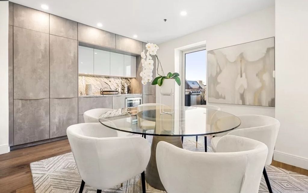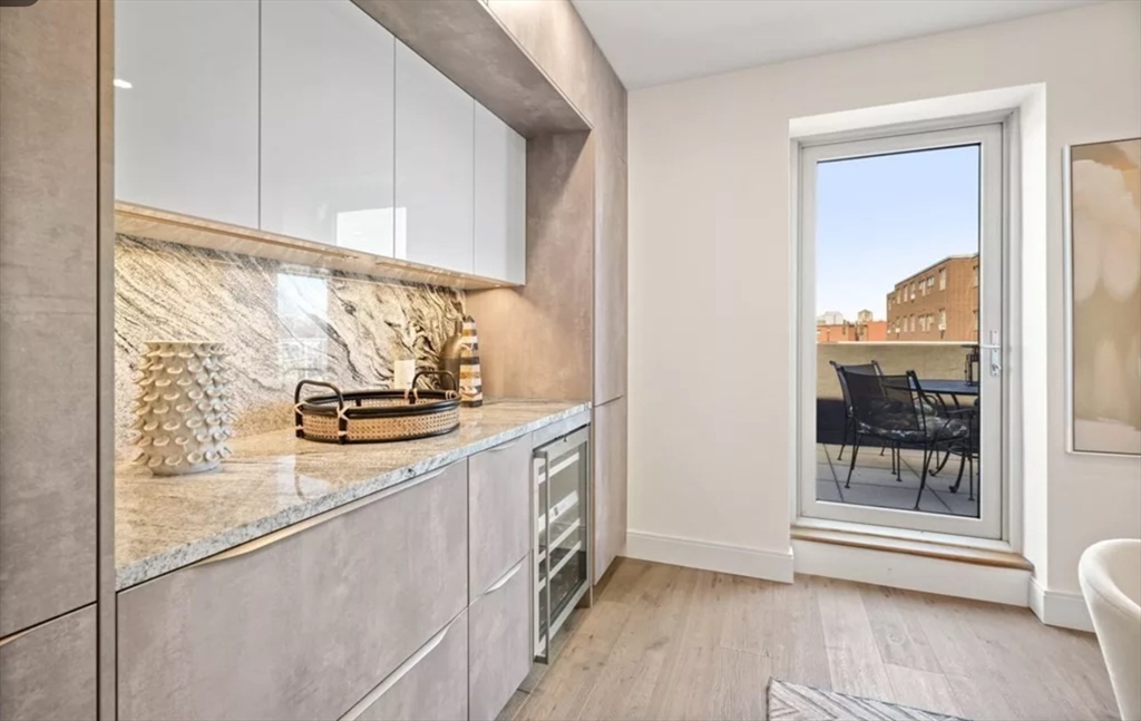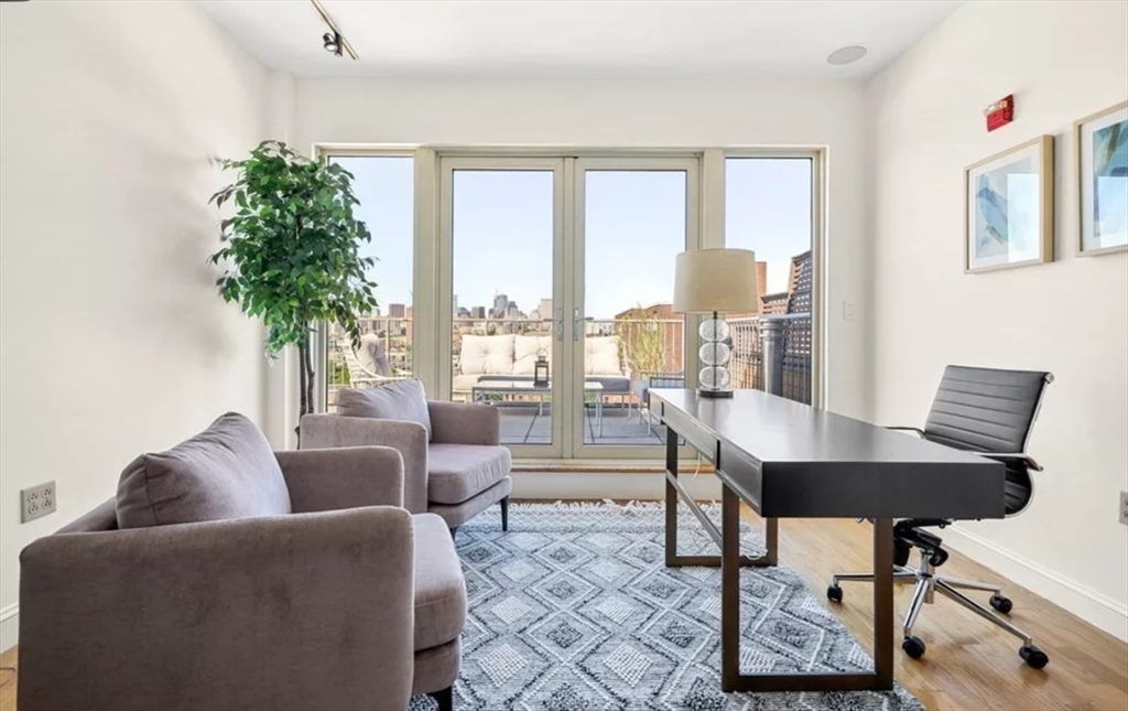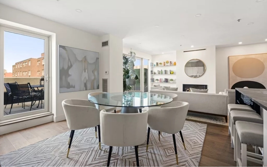This immaculate 1,541 SF penthouse comes with two stunning walk-out roof decks: one with a gas-grill hookup; the other a sprawling expanse with sweeping skyline and sunset views. Designed by Divine Design Center, the renovated chef's kitchen is clad with premium finishes and fixtures including soapstone countertops, Leicht cabinets, and professional-grade appliances. Two bedrooms, two full baths, a dry bar with a wine fridge, and generous living space deliver the perfect setting for relaxing and entertaining. An office/den can function as a guest room. Special highlights include a gas fireplace, in unit laundry, grills on deck, tons of storage space, and the convenience of TWO garage parking space and a individual HUGE locked up storage room. A stone’s throw from sought-after parks, specialty shops, and restaurants, this is the ideal way to enjoy a lifestyle of luxury in the South End. Photos are previous stage.