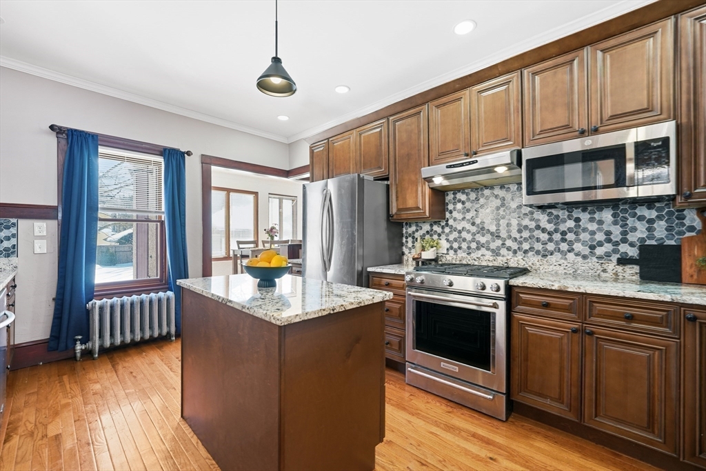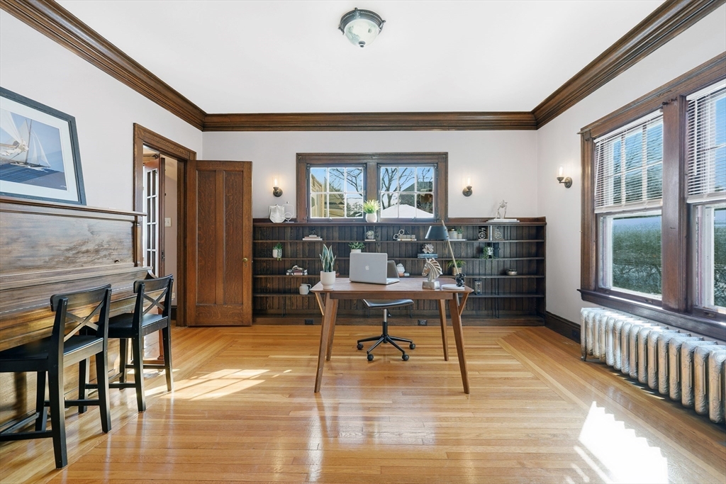 Beautifully maintained historic home with three finished levels of living space. The main level offers a gracious living room with fireplace that flows into a private office or library, formal dining room, and grand foyer with soaring ceilings, inlay hardwood floors, and stunning original woodwork. The remodeled kitchen features stainless steel appliances, granite counters, tiled backsplash, high-end cabinetry, half bath, and secondary stairwell. A heated rear porch provides an ideal drop zone with direct driveway access.The second floor includes three bedrooms, including a spacious primary suite with oversized ensuite, soaking tub, tiled shower, and walk-in closet. One bedroom has its own fireplace. An additional full bath and heated sunroom overlooking the yard complete this level.The third floor adds three more bedrooms, fresh paint, gleaming hardwood floors, full bath, and bonus flex space. Detached two-car garage and manageable yard perfect for entertaining or play.