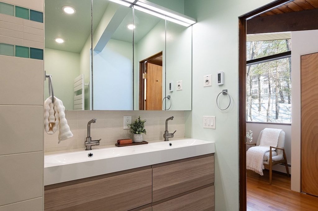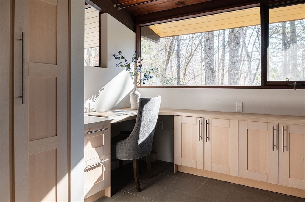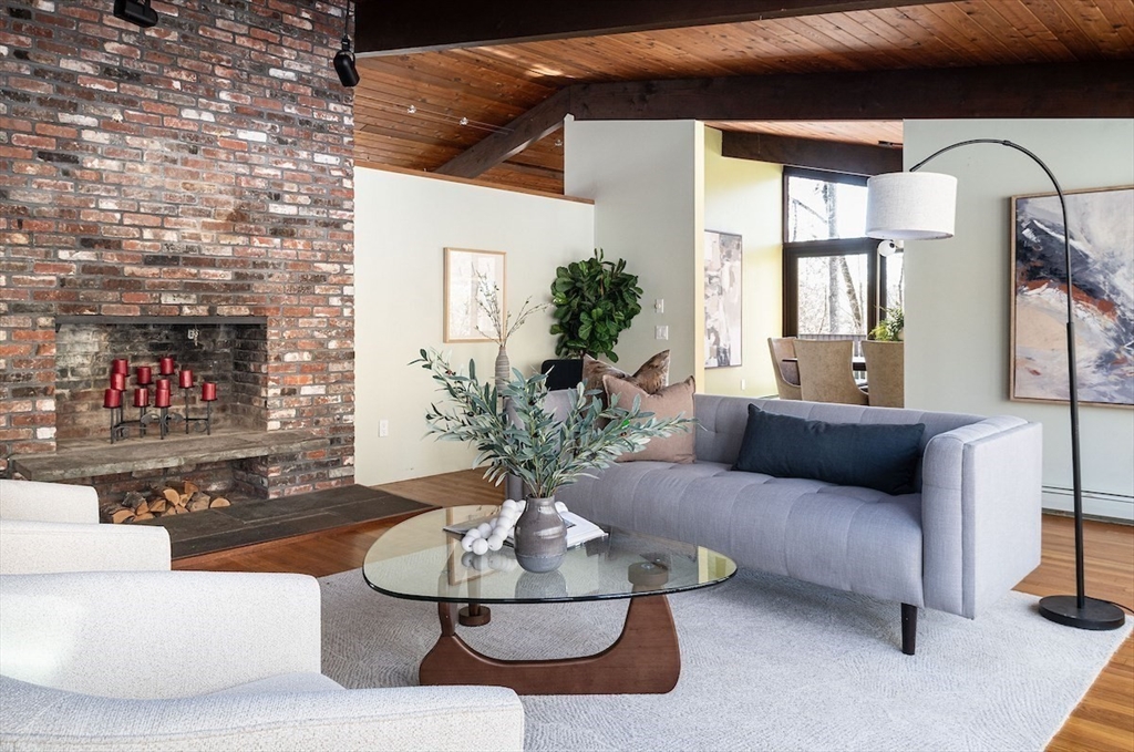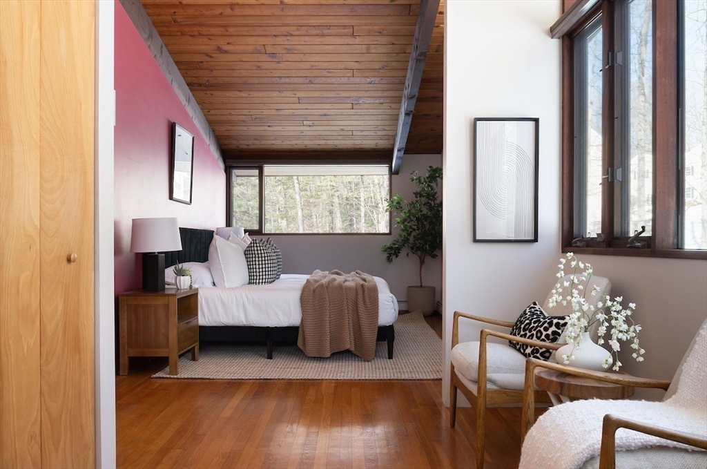 Pride of ownership shines in this sophisticated Turning Mill Deck House near Estabrook School and acres of conservation land. Sunlight pours through oversized windows and skylights, highlighting cathedral ceilings, an open floor plan, post-and-beam construction, & seamless indoor-outdoor living. A 2012 remodel added a large kitchen with top-tier appliances, an expansive island, radiant floor heat, and stylish counters. The living room features a fireplace, walls of sliders to a huge deck, hardwood floors, and flows to the dining room and a huge second deck. Renovated baths offer sleek, wall-mounted fixtures. The generous primary suite boasts a private bath with heated floors. A second bedroom and a half bath on the main level. The walk-out lower level features 3 more bedrooms, a full bath, and a family room. 200-amp electric, central air, radiant heat, & a large partially fenced yard, complete this beloved home. Enjoy a bonded membership to the Paint Rock pool. Attached 2-car garage.