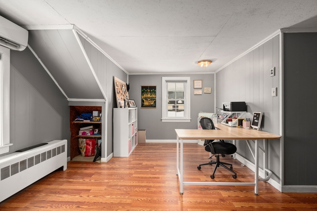 Wonderful 3-bedroom Cape in a great neighborhood of Gardner Park. Living room with a beautiful stone fireplace is open to the new kitchen with quartz counters & SS appliances. First floor den has a slider to an impressive new composite deck. Two generous bedrooms and a full bath on the second floor. Master bedroom has a slider to a balcony overlooking the yard and spiral staircase to deck. Potential for the third bedroom on first floor currently being used as dining room with new pellet stove., Finished unheated lower level has a spacious family room and an additional room. Converted to mini split systems for heat and air conditioning so baseboard is not connected. One car detached garage with slider to yard which is great for summer entertaining. Great value!!