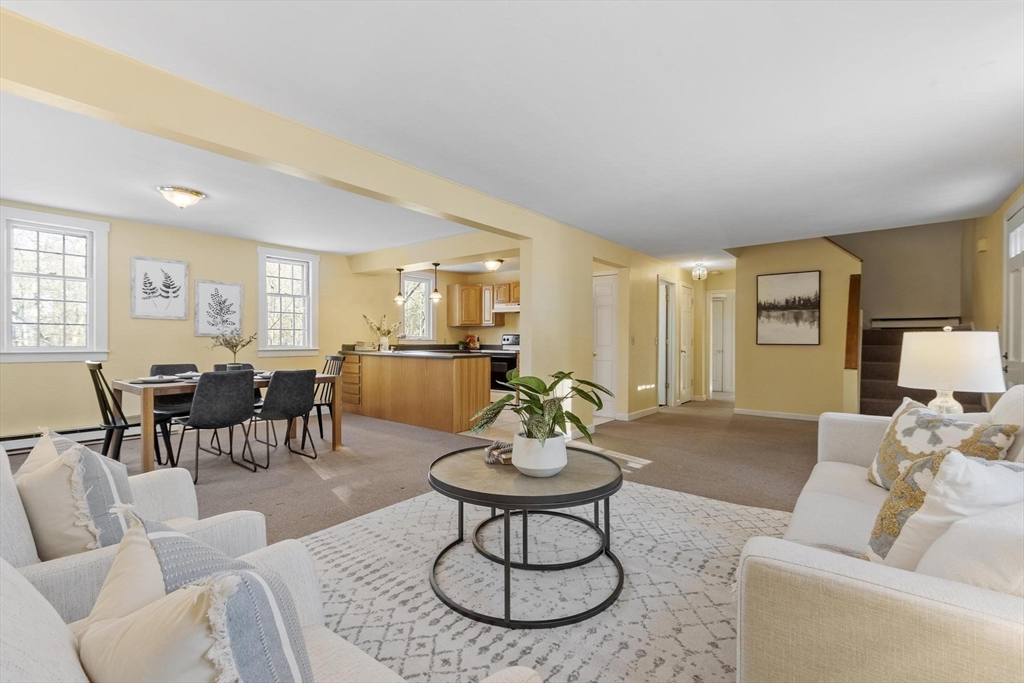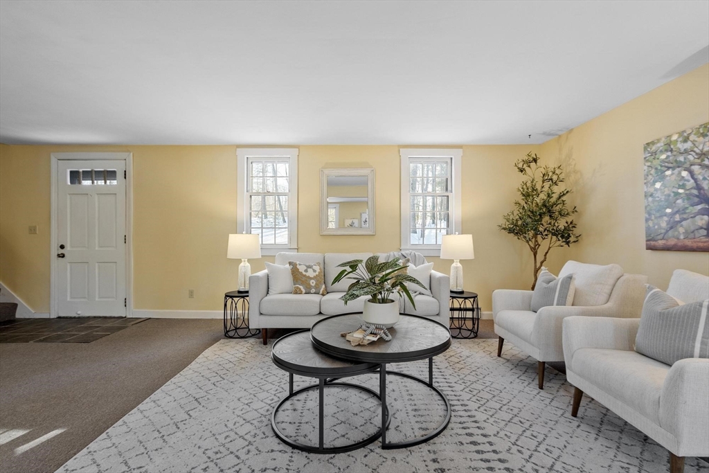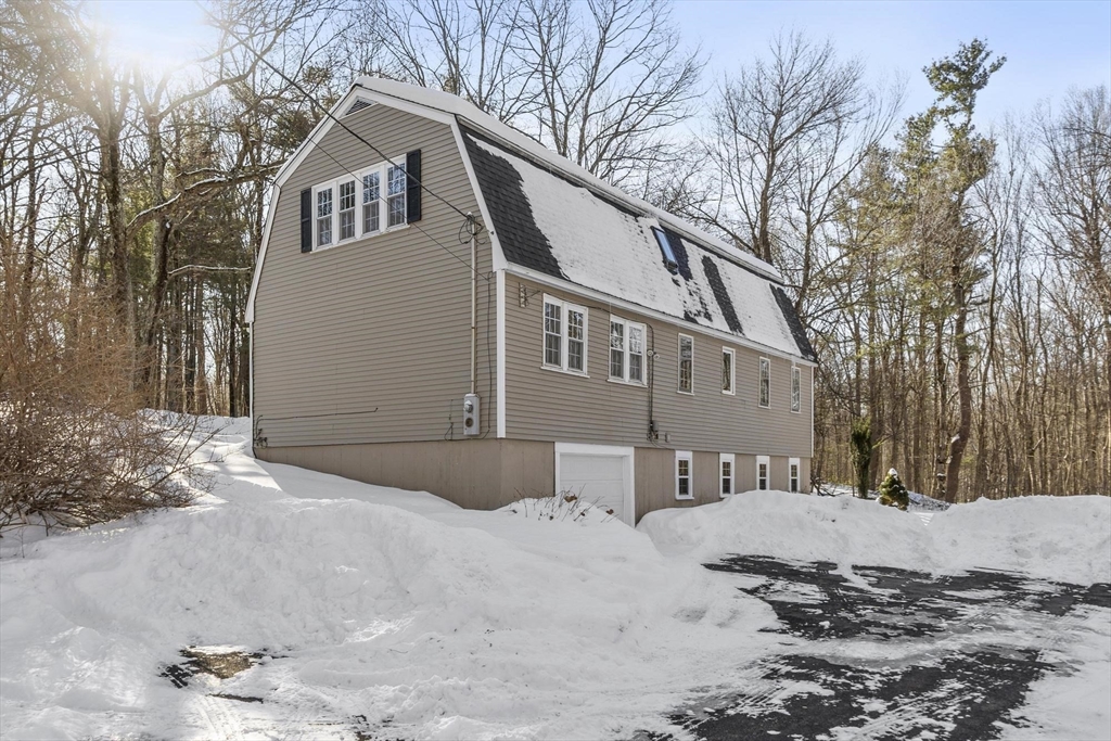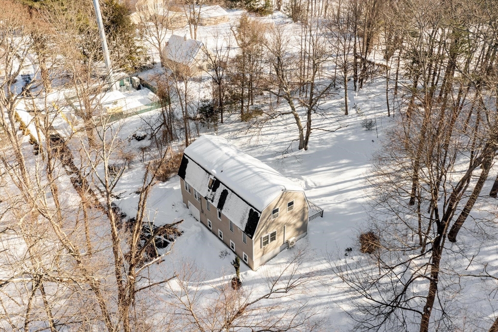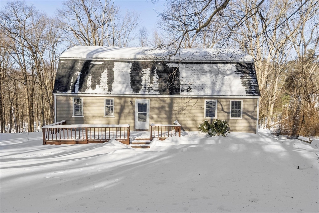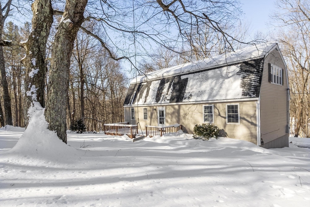 A peaceful retreat with everyday conveniences just moments away! Travel down the private driveway to a private setting with wooded views and direct access to abutting conservation land. Just moments from local schools and the town center, this location offers an ideal blend of natural beauty and accessibility. Inside, an open-concept floor plan connects the kitchen, living, and dining rooms, creating a comfortable and functional main living space. The first floor includes two bedrooms, also suitable for a home office, along with a full bath. The second floor features a spacious bedroom and full bath, providing a private suite. Additional potential awaits in the unfinished attic, offering an opportunity for future expansion. A brand-new roof installed in 2025 and a passing Title V for three bedrooms provide buyers with confidence in the home’s major systems. This property combines location, privacy, and opportunity in a desirable setting. Explore the opportunities that await you!