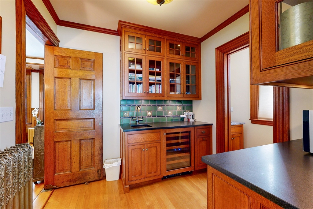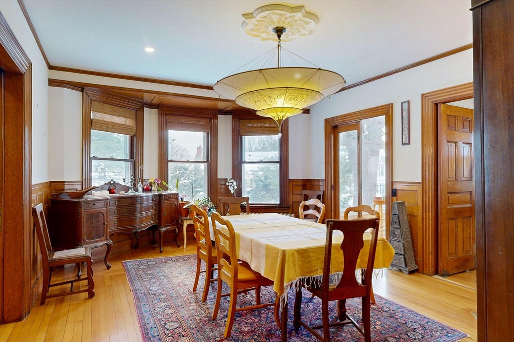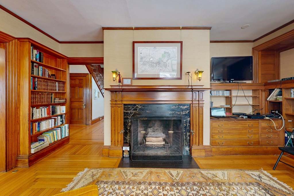 This beautifully updated 1894 Victorian home sits proudly upon a knoll in the heart of Newton Centre, boasting a commanding street presence and a stunning wrap-around porch. Inside, the residence seamlessly blends historic charm—original moldings, exquisite quarter-sawn oak, and leaded glass—with modern renovations and updated mechanical systems. The gracious foyer opens into a home bathed in natural light, featuring 10-foot ceilings and hardwood floors. Highlights include a 23-foot living room with a fireplace, a family room with pocket doors, and a serene greenhouse sunroom. The updated eat-in kitchen offers a center island and granite counters, complemented by an elegant dining room and a butler’s pantry with a wine cooler. The second floor hosts a luxurious master suite with a marble radiant-heat bath, two additional bedrooms, and laundry. The third floor adds three more bedrooms and a full bath. Outside, enjoy a lovely yard and a 2-car garage, all steps from Newton Center.