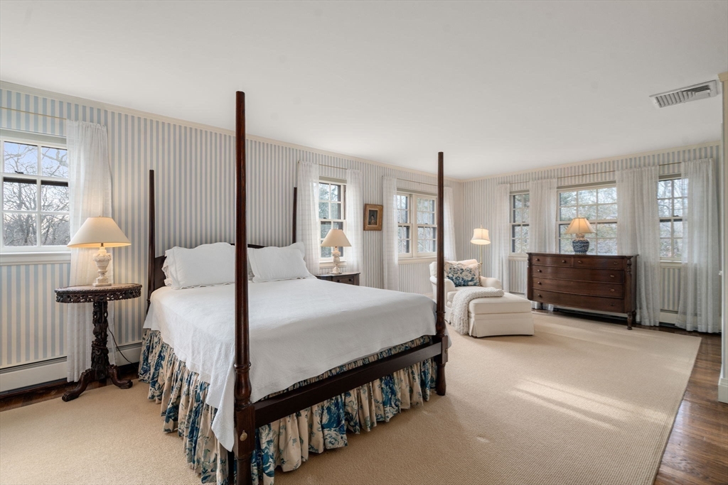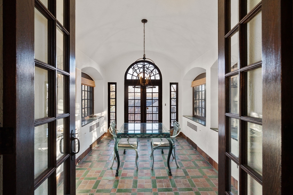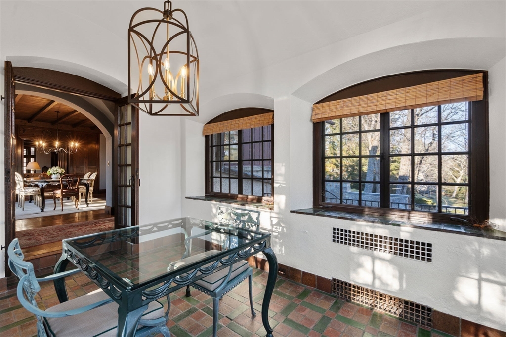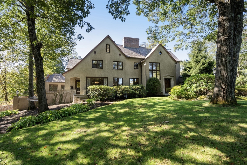 Privately nestled on nearly an acre of land this exceptional Cliff Estates home offers timeless elegance in a stunning and serene setting. Sweeping heated driveway with gorgeous stone walls lead up to beautiful front yard. The gracious two story foyer welcomes you with soaring ceilings, intricate millwork and rich hardwood floors throughout. Sophisticated fireplaced living room and sun splashed dining room exude warmth and charm. Expansive eat in kitchen leads to generous butlers pantry and three season porch. The second floor boasts a lovely primary suite with renovated marble bath and 4 additional family bedrooms. Finished third floor has endless options for home office, bonus playroom or additional bedroom suite. Picturesque grounds and stone patios allow for wonderful outdoor entertaining space. Walk out lower level has an au pair / in law suite with separate entrance and its own garage. Close to the commuter rail and all of Wellesley amenities.