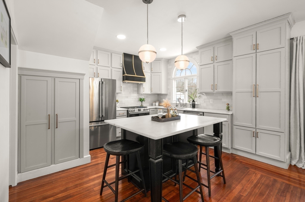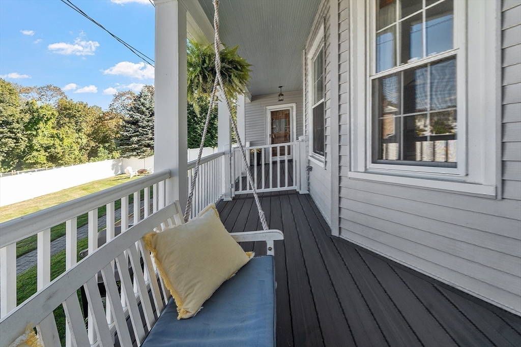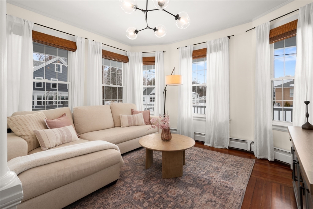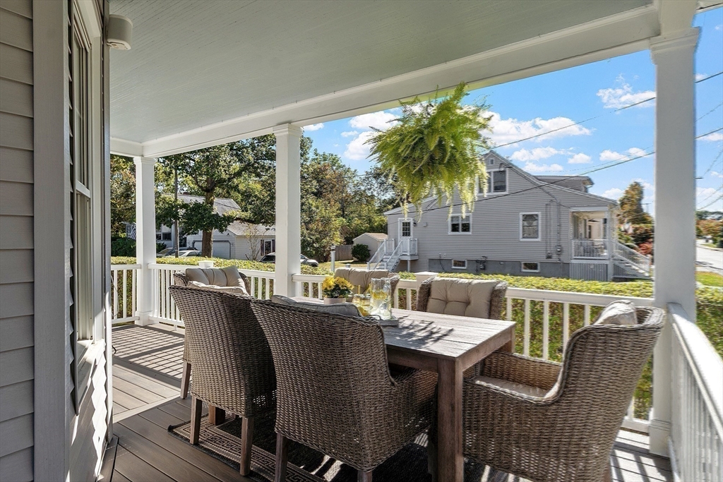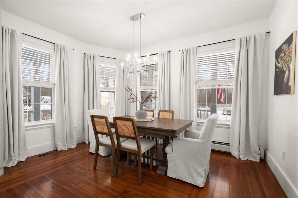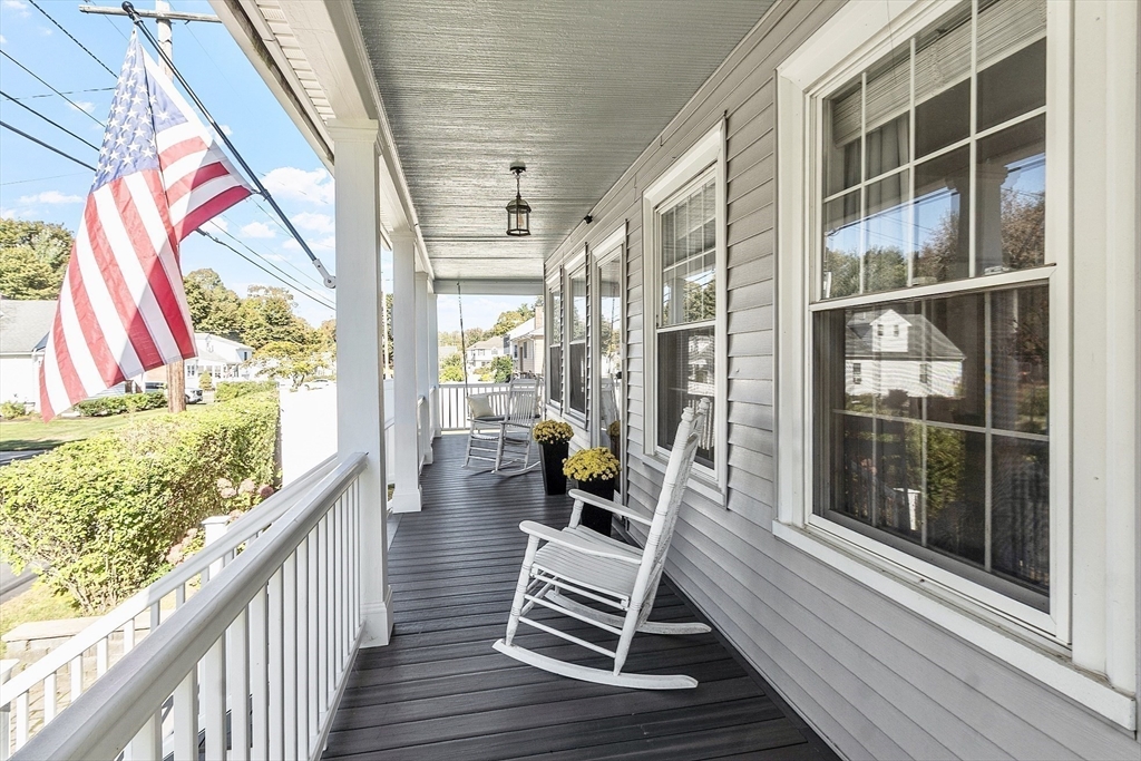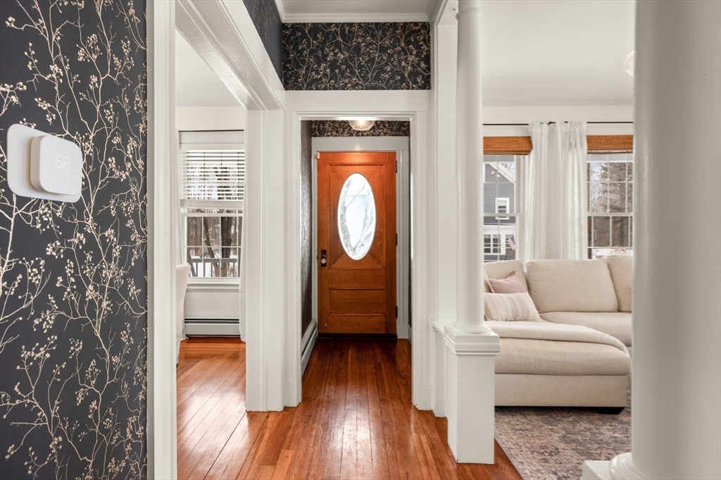 Charming bungalow with beautiful, modern updates and sunny, wrap-around porch near North Andover's picturesque Old Center! Showcasing tasteful improvements & gorgeous renovated kitchen, this special residence captivates from entry. Kitchen w/dining area features white marble counters, subway textured tile backsplash, custom island, gold accents & high-quality stainless appliances including premium six burner gas range. Light filled main level welcomes w/gleaming wood floors, stylish lighting, chic accent wallpaper & thoughtful details. Convenient first floor primary, spacious family room, full bath, laundry & mudroom highlight functional main level layout. Second floor offers bonus room, two more bedrooms & another full bath. Recently converted to natural gas, home offers new boiler, tankless water heater, central air & new PVC pipes. Vinyl siding & composite porch & fence provide ease of living. Enviable curb appeal & desirable location w/sidewalks to town common & quaint Old Center!