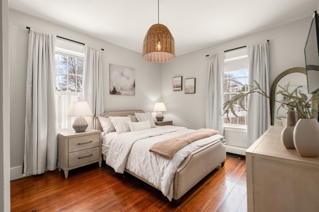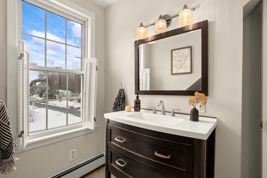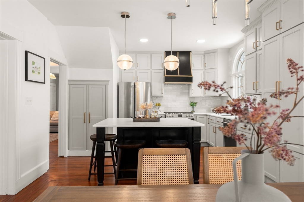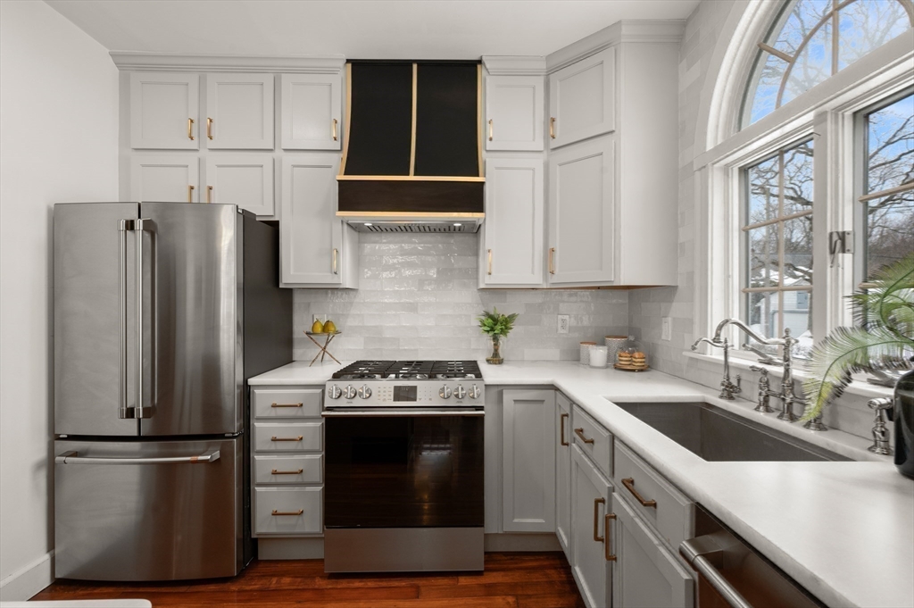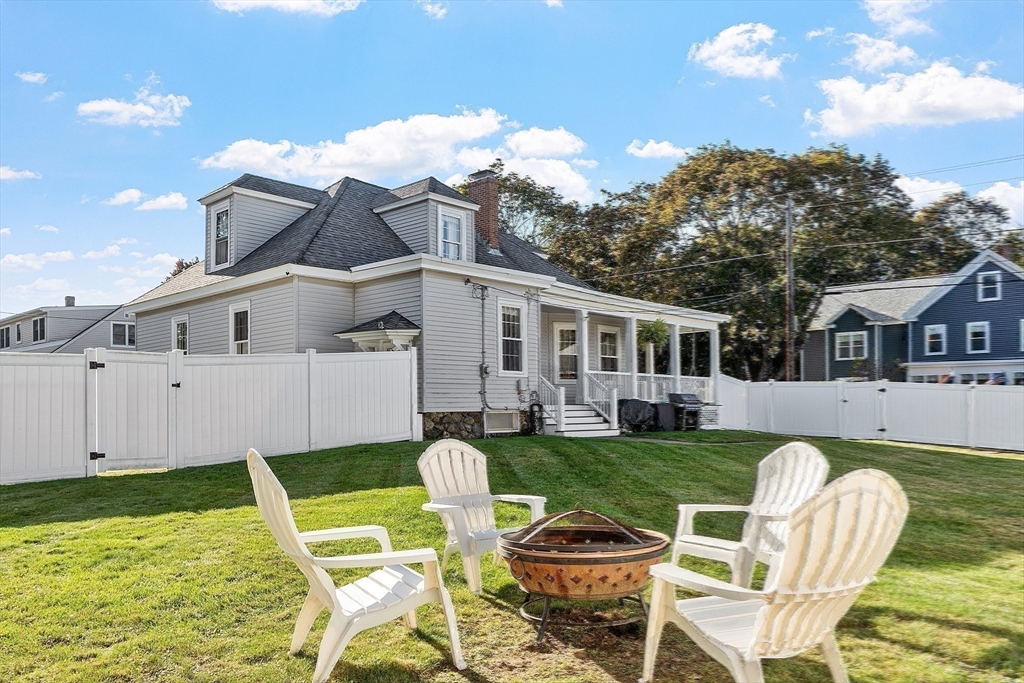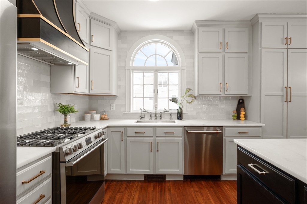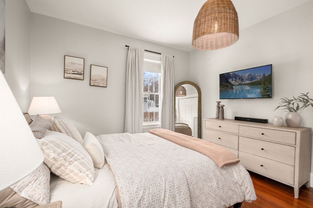 Charming bungalow with beautiful, modern updates and sunny, wrap-around porch near North Andover's picturesque Old Center! Showcasing tasteful improvements & gorgeous renovated kitchen, this special residence captivates from entry. Kitchen w/dining area features white marble counters, subway textured tile backsplash, custom island, gold accents & high-quality stainless appliances including premium six burner gas range. Light filled main level welcomes w/gleaming wood floors, stylish lighting, chic accent wallpaper & thoughtful details. Convenient first floor primary, spacious family room, full bath, laundry & mudroom highlight functional main level layout. Second floor offers bonus room, two more bedrooms & another full bath. Recently converted to natural gas, home offers new boiler, tankless water heater, central air & new PVC pipes. Vinyl siding & composite porch & fence provide ease of living. Enviable curb appeal & desirable location w/sidewalks to town common & quaint Old Center!