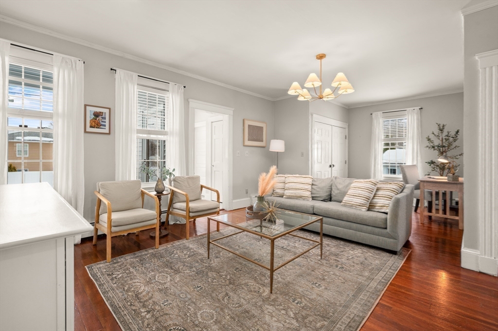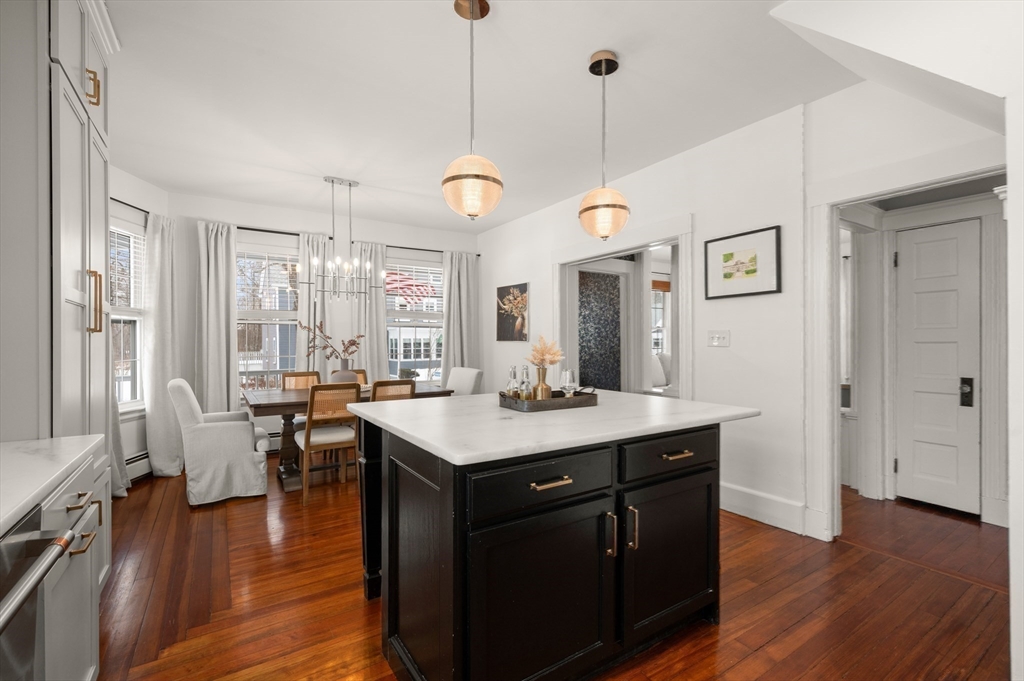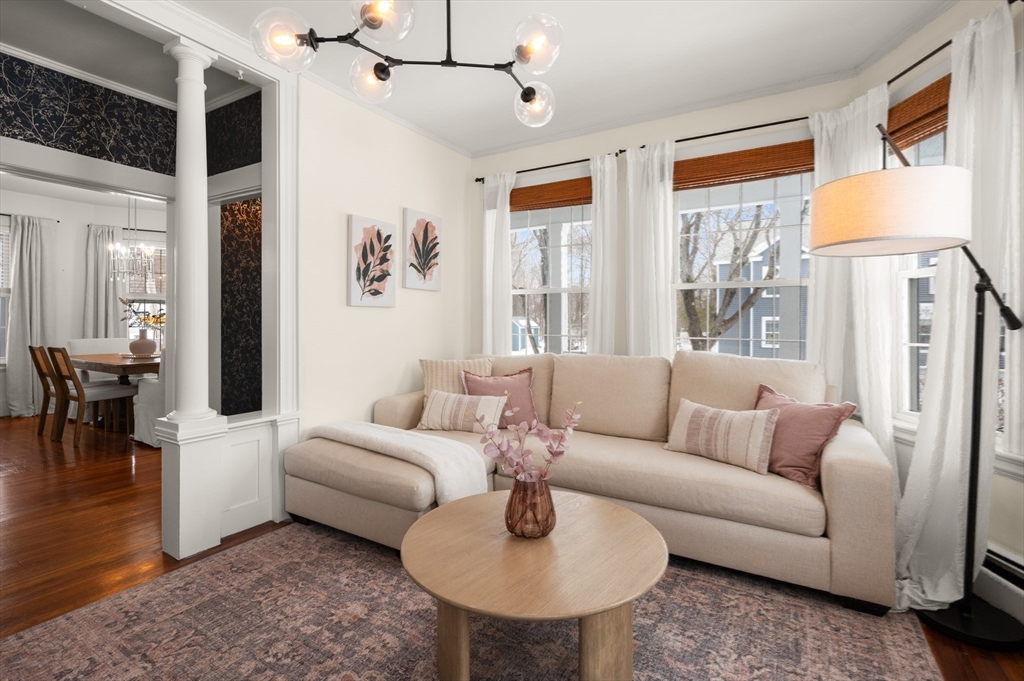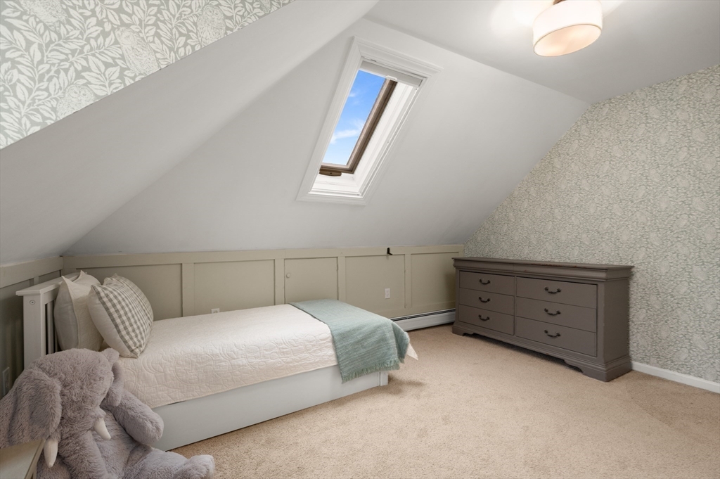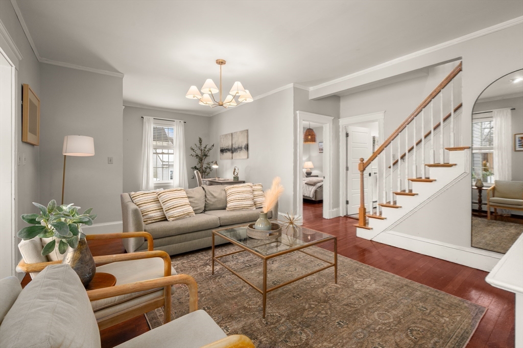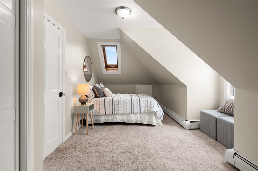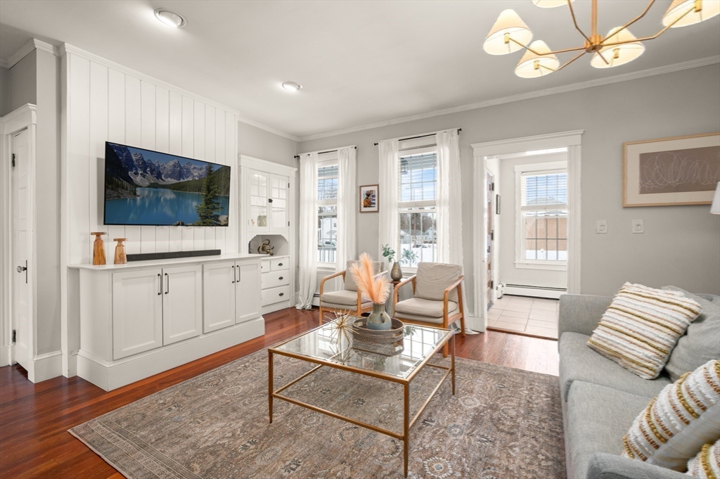 Charming bungalow with beautiful, modern updates and sunny, wrap-around porch near North Andover's picturesque Old Center! Showcasing tasteful improvements & gorgeous renovated kitchen, this special residence captivates from entry. Kitchen w/dining area features white marble counters, subway textured tile backsplash, custom island, gold accents & high-quality stainless appliances including premium six burner gas range. Light filled main level welcomes w/gleaming wood floors, stylish lighting, chic accent wallpaper & thoughtful details. Convenient first floor primary, spacious family room, full bath, laundry & mudroom highlight functional main level layout. Second floor offers bonus room, two more bedrooms & another full bath. Recently converted to natural gas, home offers new boiler, tankless water heater, central air & new PVC pipes. Vinyl siding & composite porch & fence provide ease of living. Enviable curb appeal & desirable location w/sidewalks to town common & quaint Old Center!