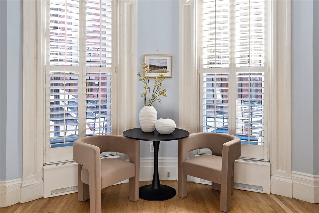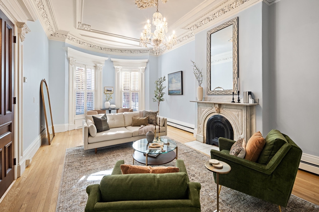Set in a classic brick bow-front with low-stoop, this sun-filled South End home is a truly special offering, highlighted by historic details, soaring 12-foot ceilings, and the kind of dramatic volume rarely found in a one-bedroom-plus layout. The elegant parlor level showcases original “wedding cake” plasterwork, a marble mantle adorns the decorative fireplace, warm wood floors, and thoughtful built-ins. The home offers approximately 960 square feet of single-floor living and a large private balcony, perfect for morning coffee or evenings at home. The kitchen renovation was beautifully designed and executed with polished quartz countertops, stainless steel appliances, and a gas range creating a clean, modern complement to the home’s original charm. A newly renovated marble and tile bath adds a timeless finish. Additional conveniences include common storage and free common laundry. Transferrable rental garage parking across the street available, ask for details.