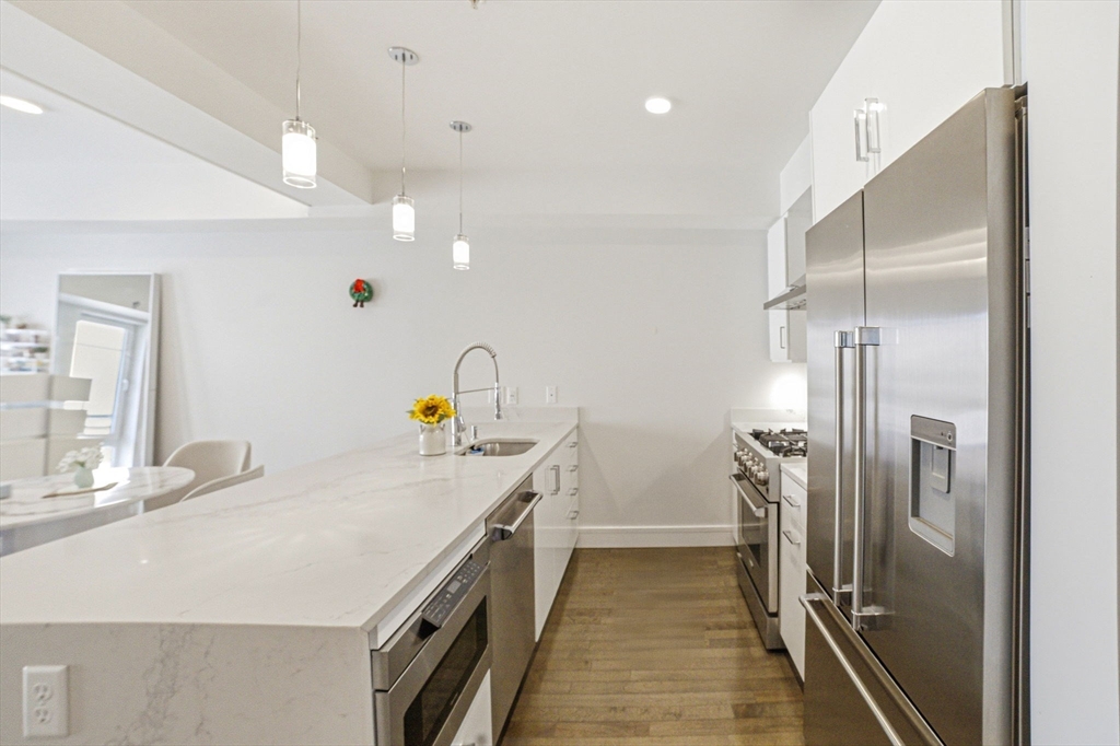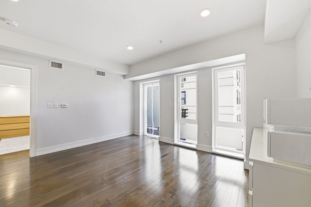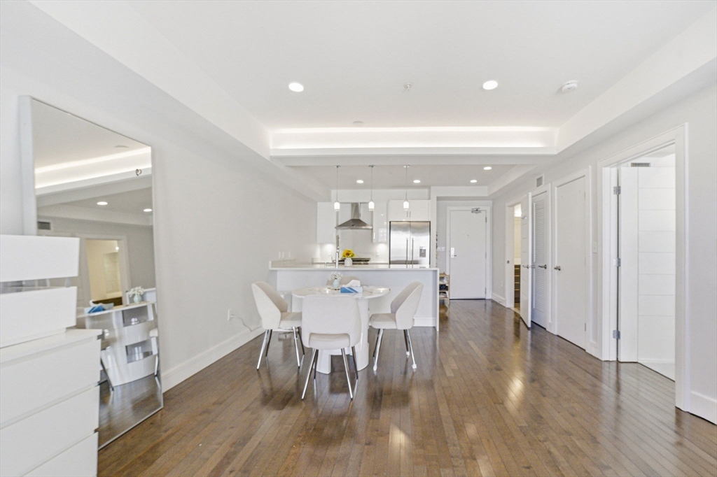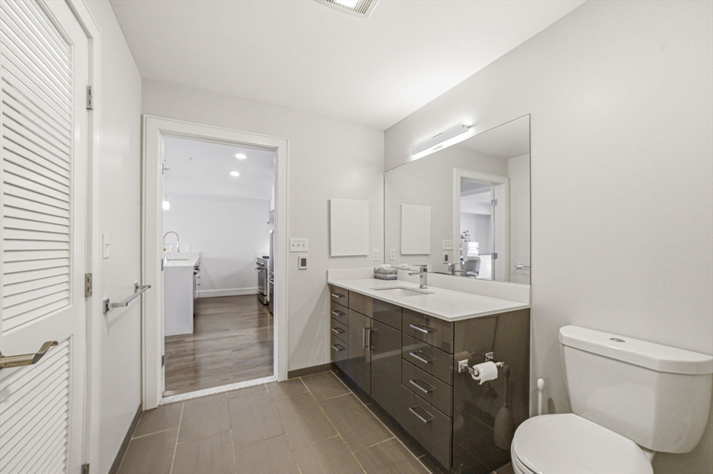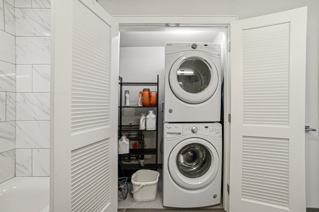 This southeast-facing 1 bed/1 bath condo with garage parking features modern finishes and exceptional convenience. The gourmet kitchen offers a gas range, vented hood, and premium stainless-steel appliances. Wide-plank engineered hardwood flooring throughout, plus a walk-in closet in the primary bedroom. Bathroom with radiant floor heating. In-unit washer/dryer. Enjoy great natural light and a private approx. 40 sq ft balcony. Building amenities include a fitness center, outdoor roof deck, and bike storage. Conveniently located near Twin City Plaza, Somerville Skating Rink, Gold Star Mothers Park, playgrounds, basketball courts, and the MBTA stations at Cambridge Crossing and Kendall Square—moments to the heart of Cambridge.